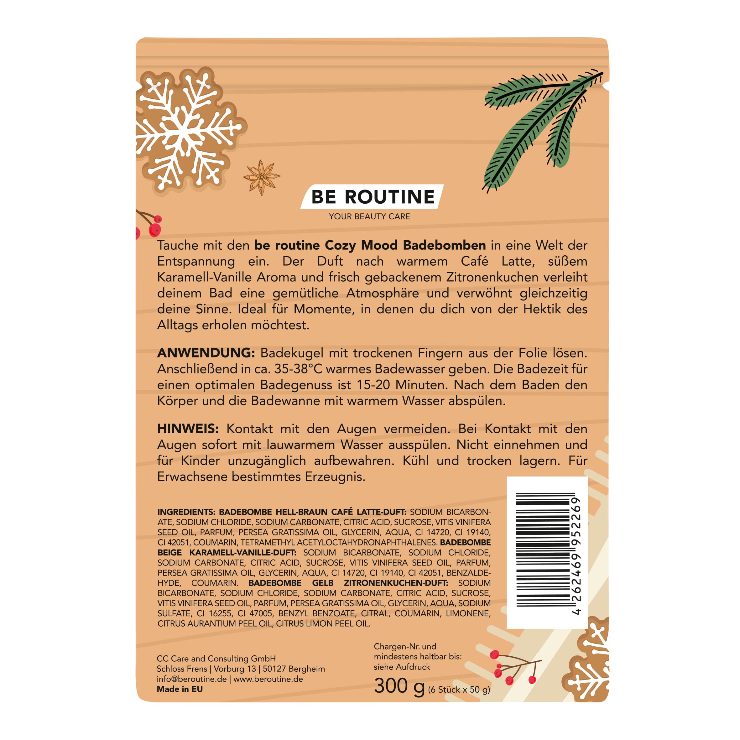 Tauche mit den BE ROUTINE Cozy Mood Badebomben in eine Welt der Entspannung ein. Der Duft nach warmem Café Latte, süßem Karamell-Vanille Aroma und frisch gebackenem Zitronenkuchen verleiht deinem Bad eine gemütliche Atmosphäre und verwöhnt gleichzeitig deine Sinne. Ideal für Momente, in denen du dich von der Hektik des Alltags erholen möchtest.
