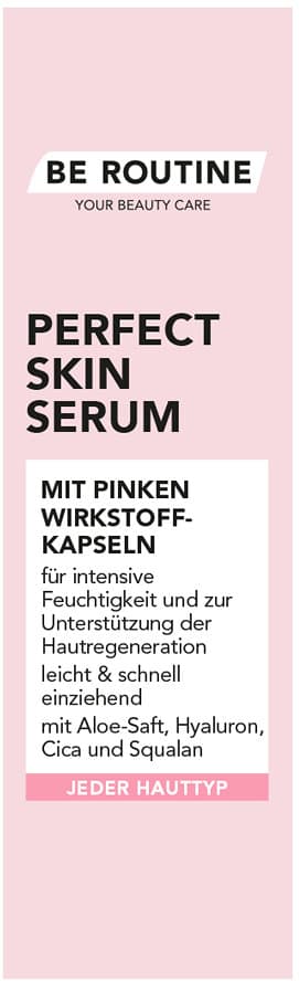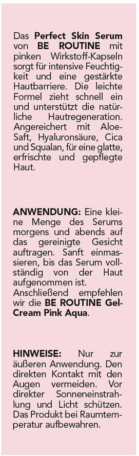 Das BE ROUTINE Perfect Skin Serum mit pinken Wirkstoff-Kapseln sorgt für ein Gefühl von Feuchtigkeit und unterstützt die Hautgeneration. Die leichte, schnell einziehende Formel pflegt die Haut angenehm weich. Aloe-Saft, Hyaluronsäure, Cica und Squalan schenken eine glatte, erfrischte und gepflegte Haut.