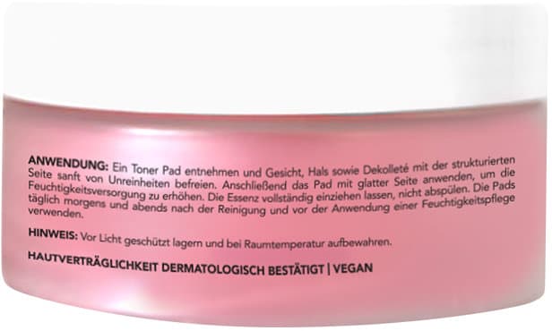 AnwendungshinweisEin Toner Pad entnehmen und Gesicht, Hals und Dekolleté mit der strukturierten Seite von Unreinheiten befreien. Anschließend die glatte Seite verwenden, um die Feuchtigkeitsversorgung zu erhöhen. Essenz vollständig einziehen lassen. Täglich morgens und abends nach der Reinigung und vor der Pflege verwenden.
