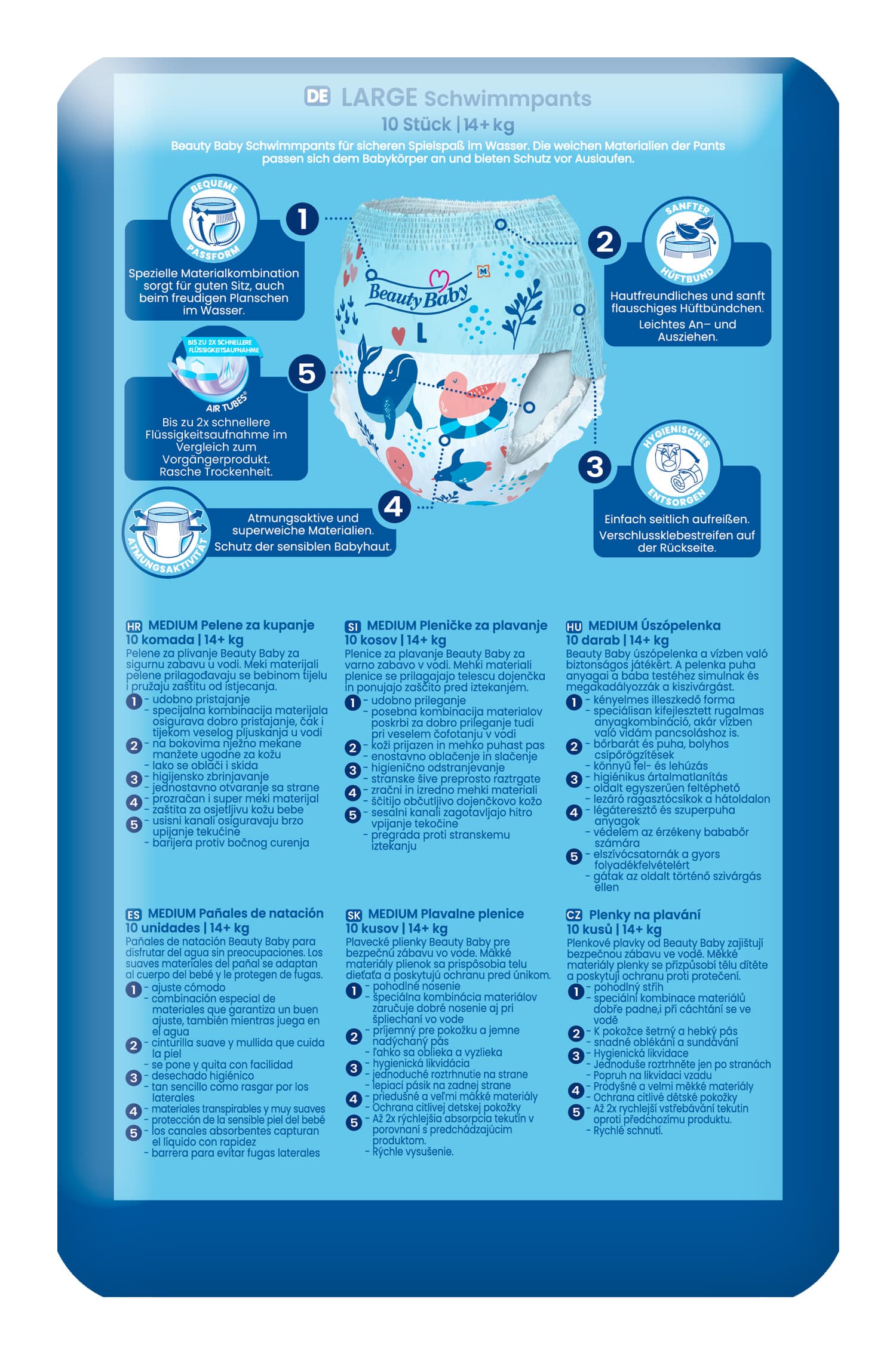 Beauty Baby Schwimmpants sind speziell für die Bedürfnisse Ihres Kindes entwickelt worden.Die angenehm weichen Materialien und die atmungsaktiven Oberflächen schützen die sensible Babyhaut, auch im Wasser. Für unbegrenzten Spielspaß!Eine speziell entwickelte elastische Materialkombination sorgt für eine bequeme, körpergerechte Passform und gutem Sitz. Das sanft flauschige Stretchbündchen sorgt für leichtes An- und Ausziehen.Die breiten, elastischen Beinabschlüsse verhindern unerwünschtes seitliches Auslaufen.Die Schwimmpants sind frei von Allergenen, unnötigen Zusätzen und auf Schadstoffe geprüft. 0%: Parfüm - Naturlatex - Lotion.Der eingesetze Zellstoff stammt aus verantwortungsvollen Quellen und ist chlorfrei gebleicht. Die Herstellung des Produkts erfolgt in einem CO2 neutralen Werk, was zu 100% mit Öko-Strom betrieben wird.