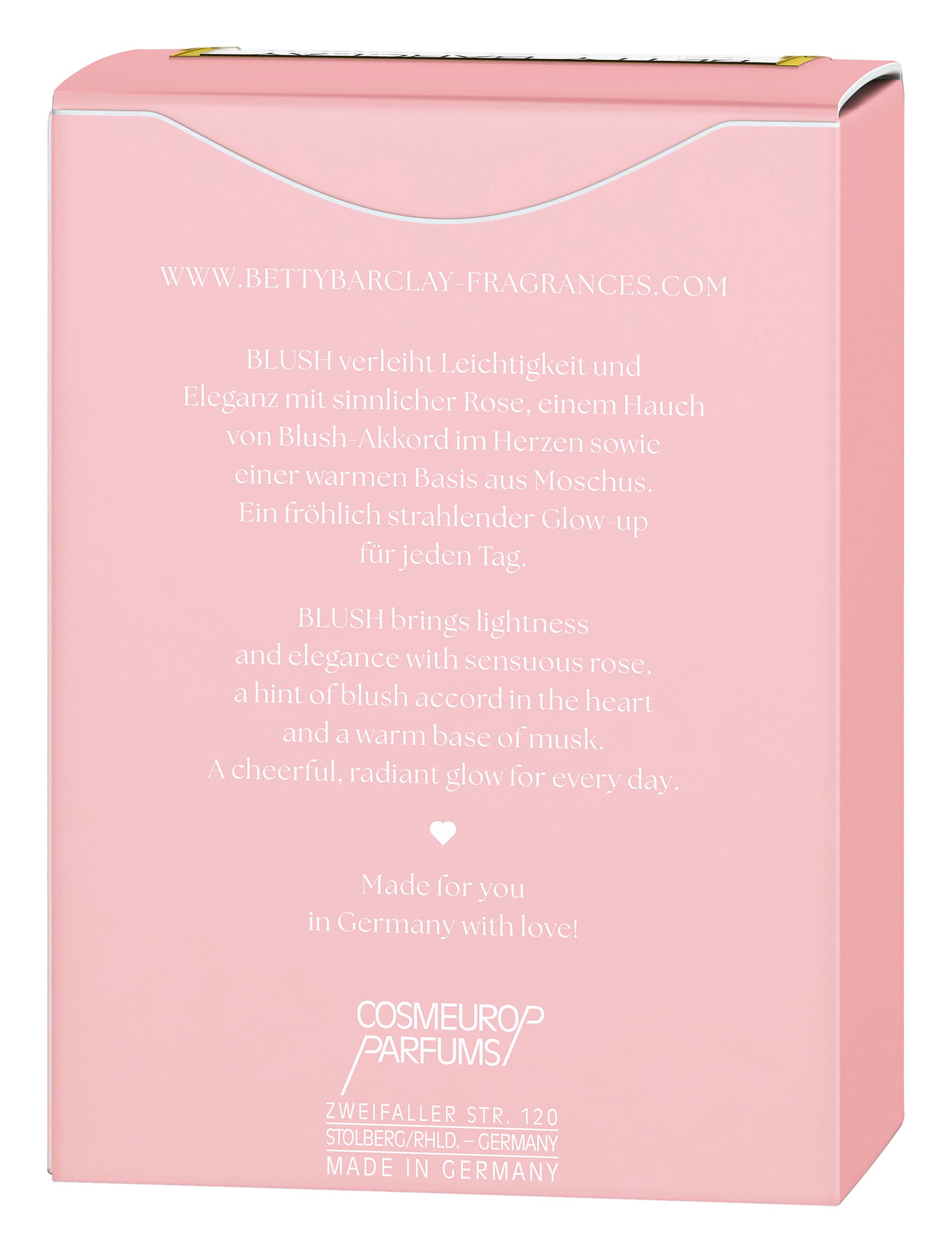 - Der neue Duft Betty Barclay Blush verleiht der Trägerin auf natürliche Weise eine ganz besondere Strahlkraft und fügt sich als floraler Duft optimal in das Produktportfolio von Betty Barclay Fragrances ein.