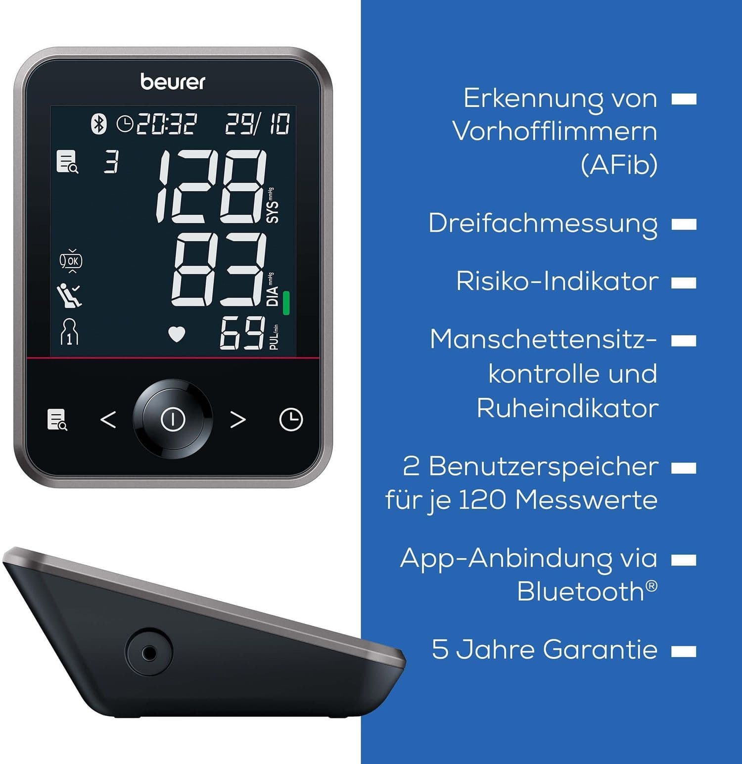 - Zwei Benutzerspeicher für je 120 Messwerte. Einfache Bedienung über 4 Sensor-Touch-Knöpfe