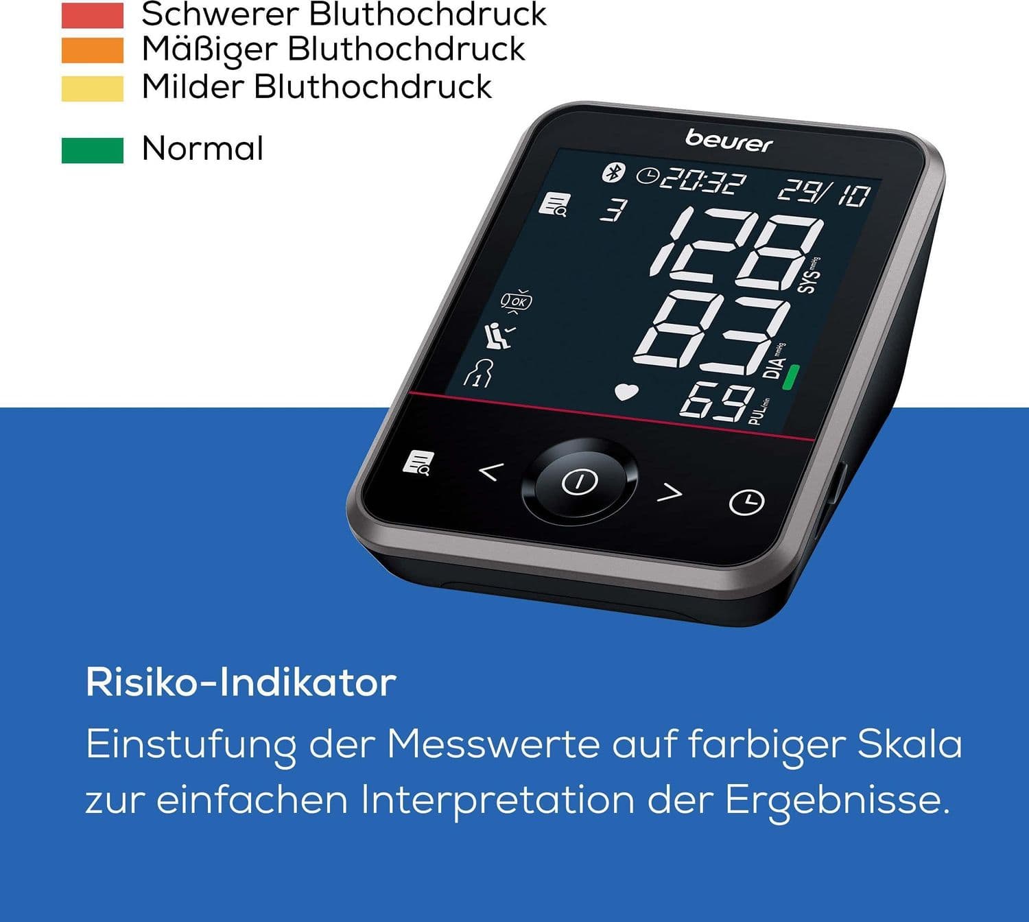 - Entwicklung der Blutdruckwerte jederzeit mit der App „beurer HealthManager Pro“ im Blick behalten.