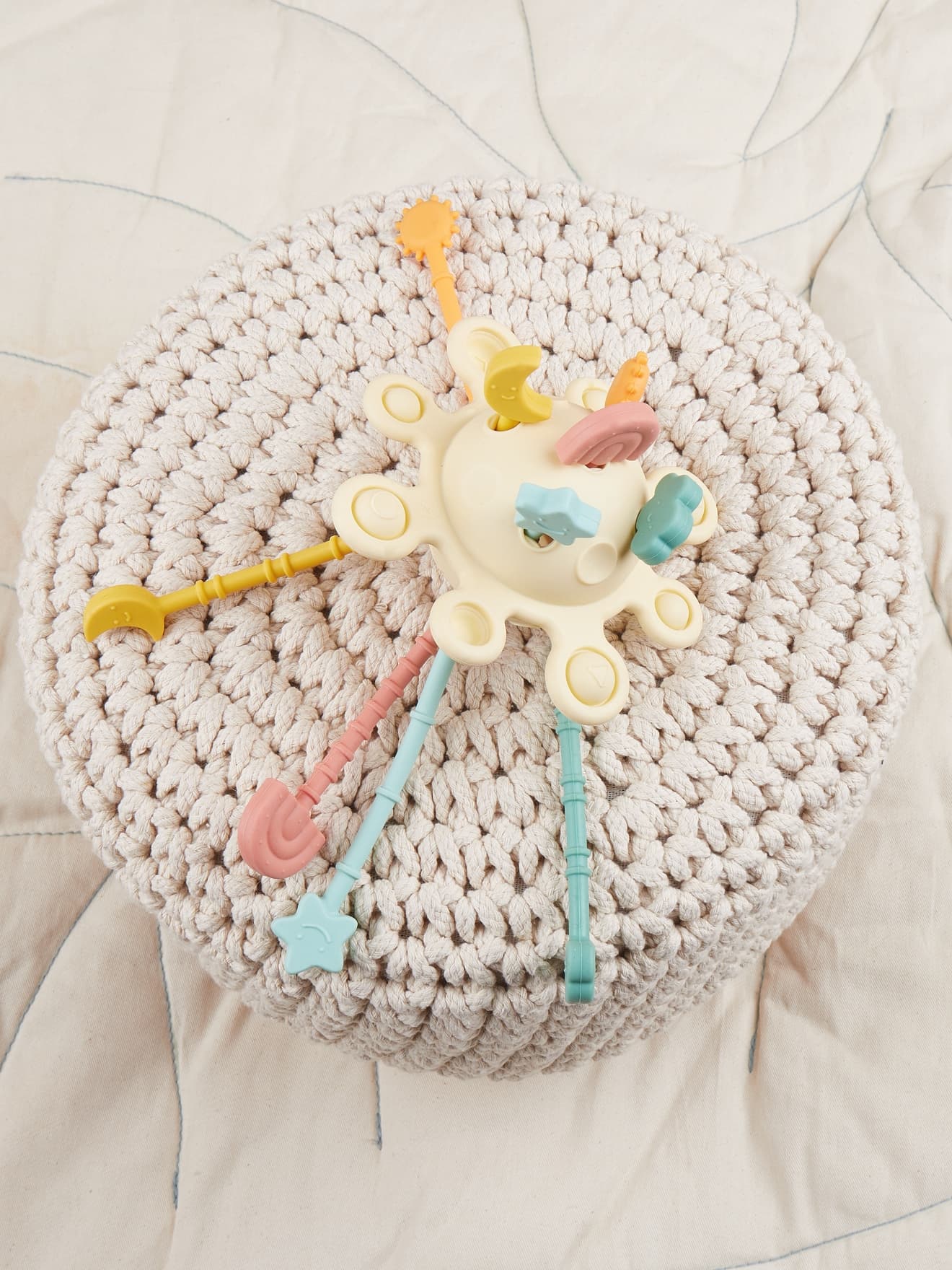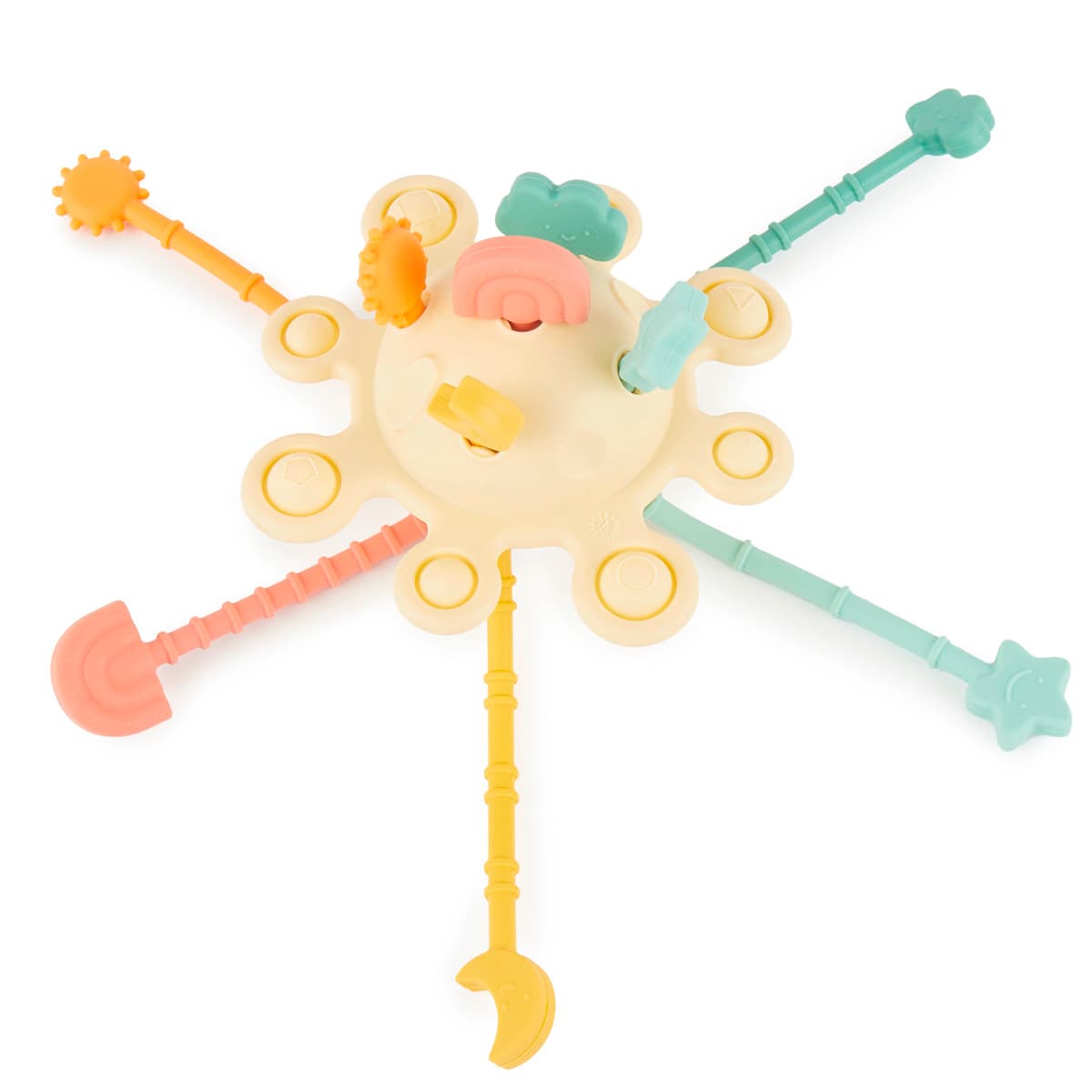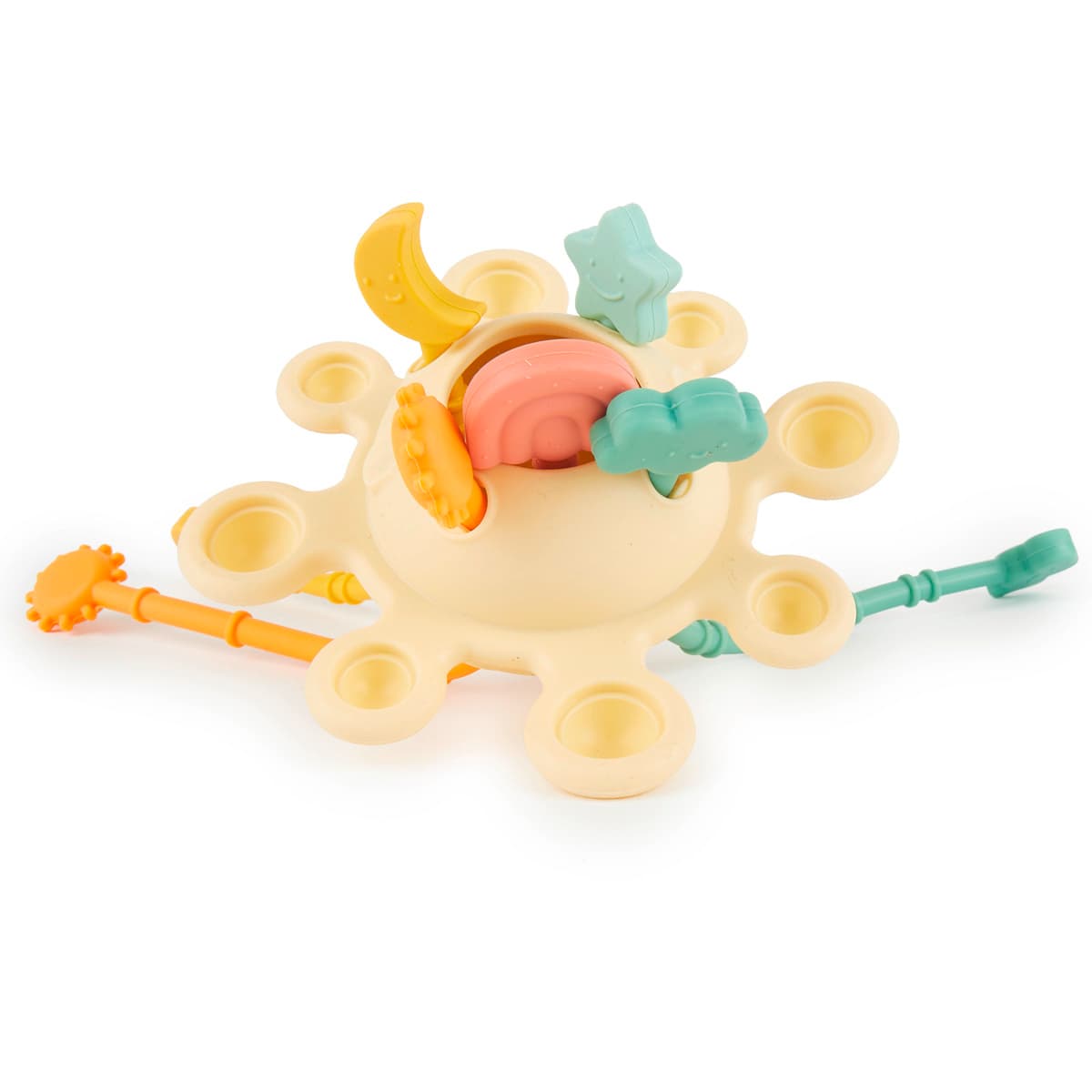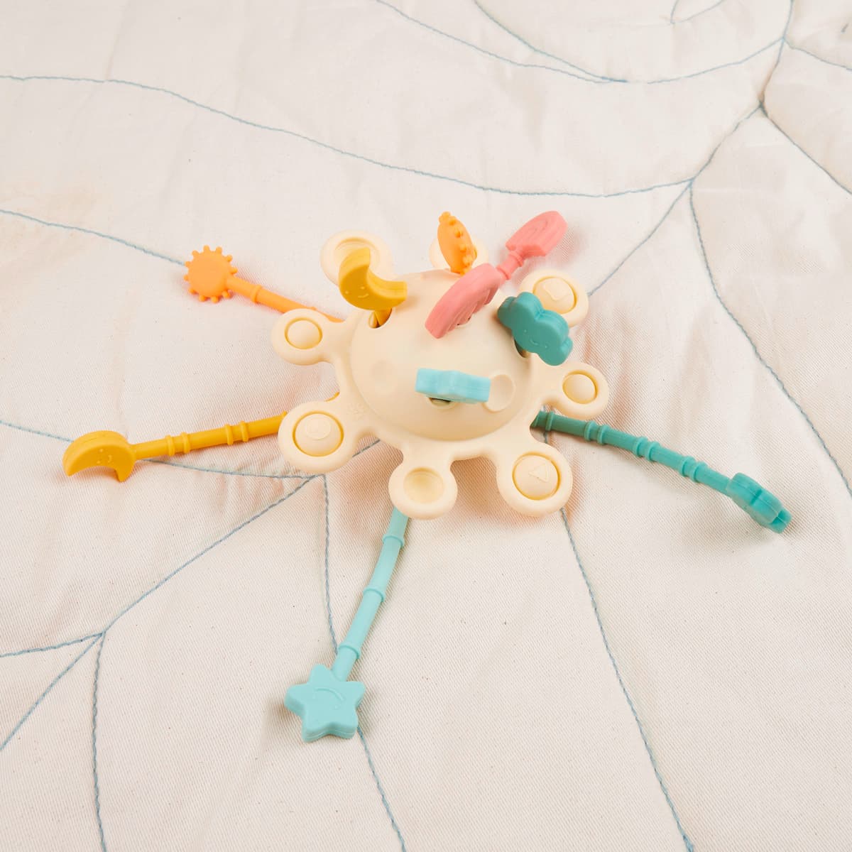 Mit robusten Silikon-Zugkordeln, versteckten Elementen wie Sonne, Mond und Sternen sowie Pop-it-Feldern fördert er spielerisch die Feinmotorik, die Hand-Auge-Koordination und die sensorische Wahrnehmung.