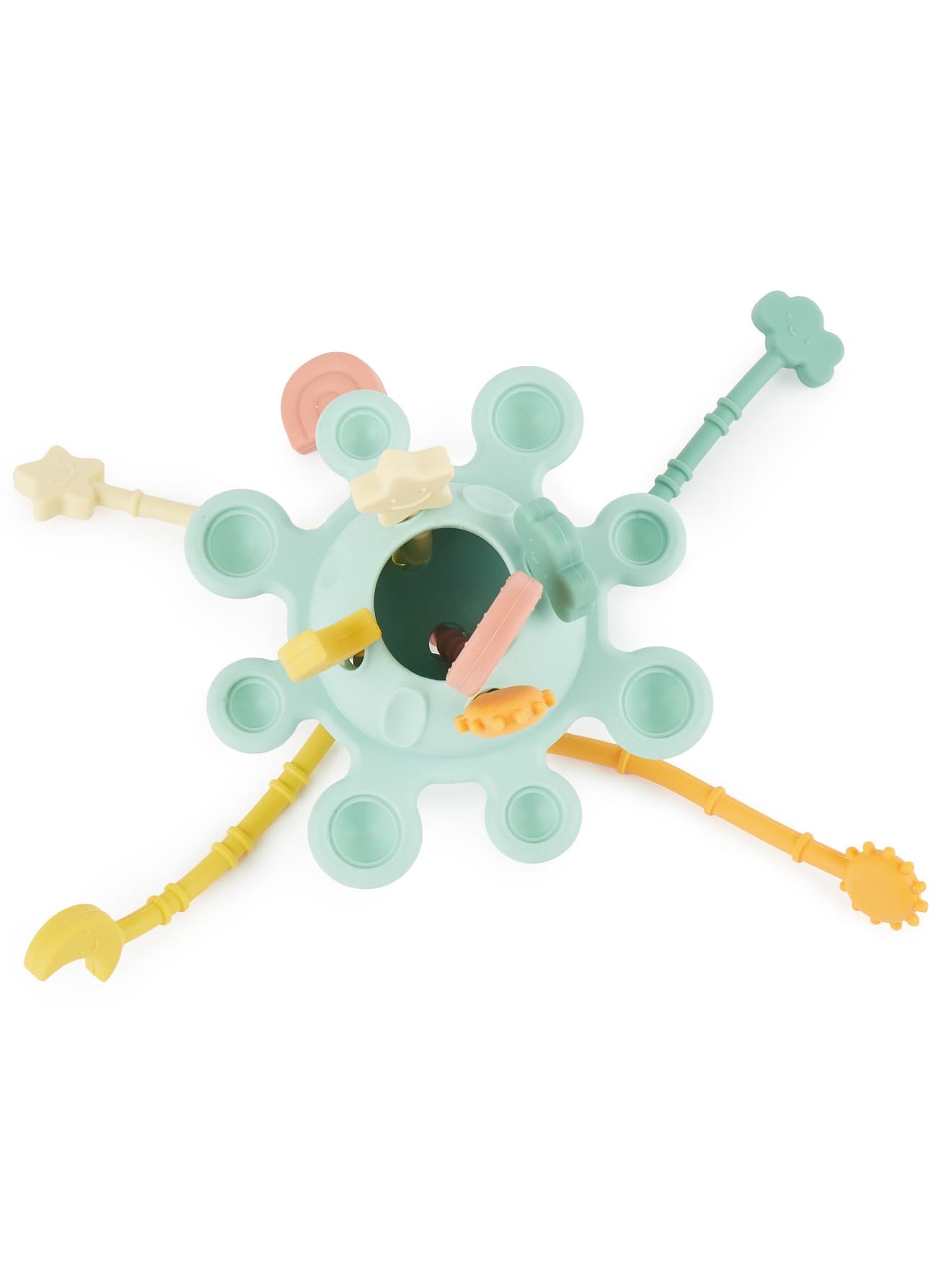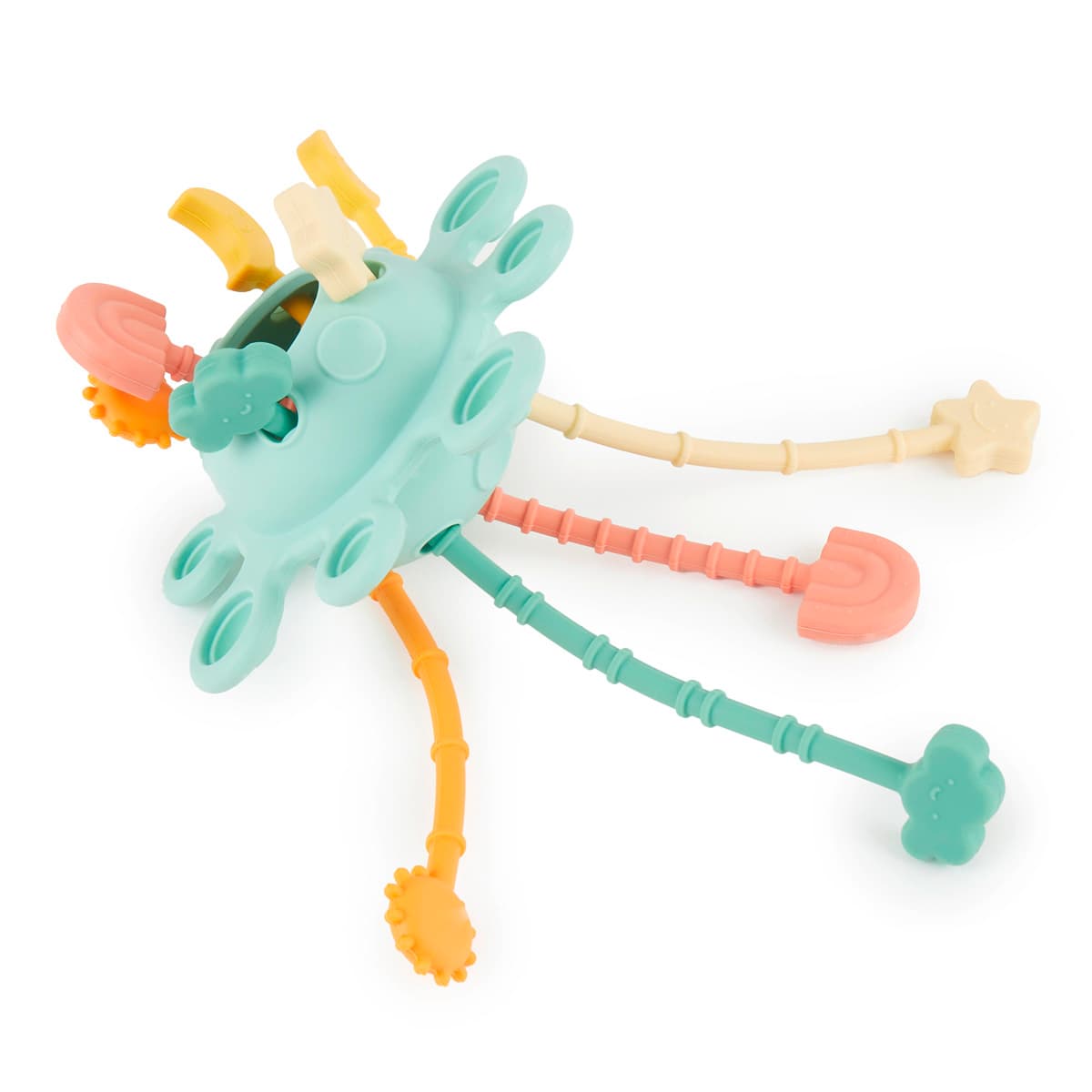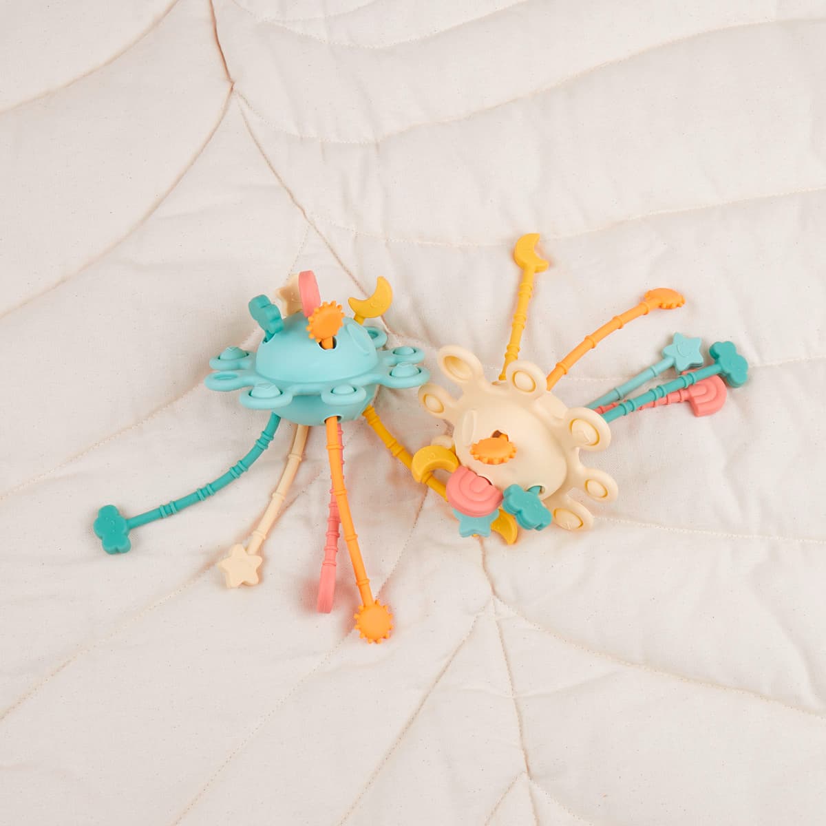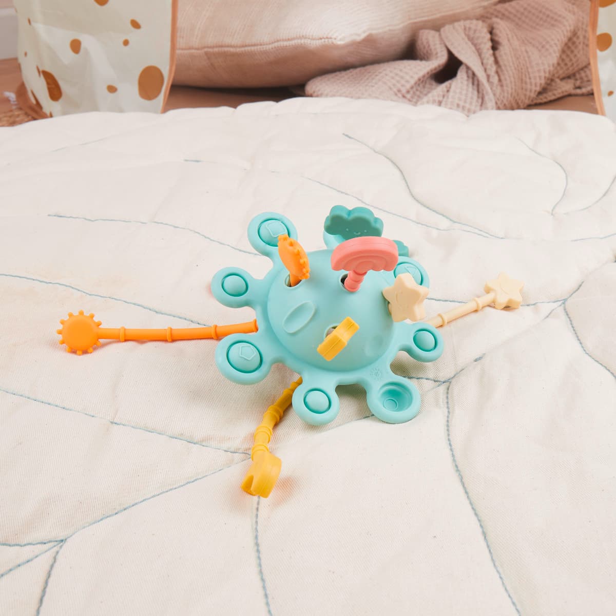Mit robusten Silikon-Zugkordeln, versteckten Elementen wie Sonne, Mond und Sternen sowie Pop-it-Feldern fördert es spielerisch die Feinmotorik, die Hand-Auge-Koordination und die sensorische Wahrnehmung.