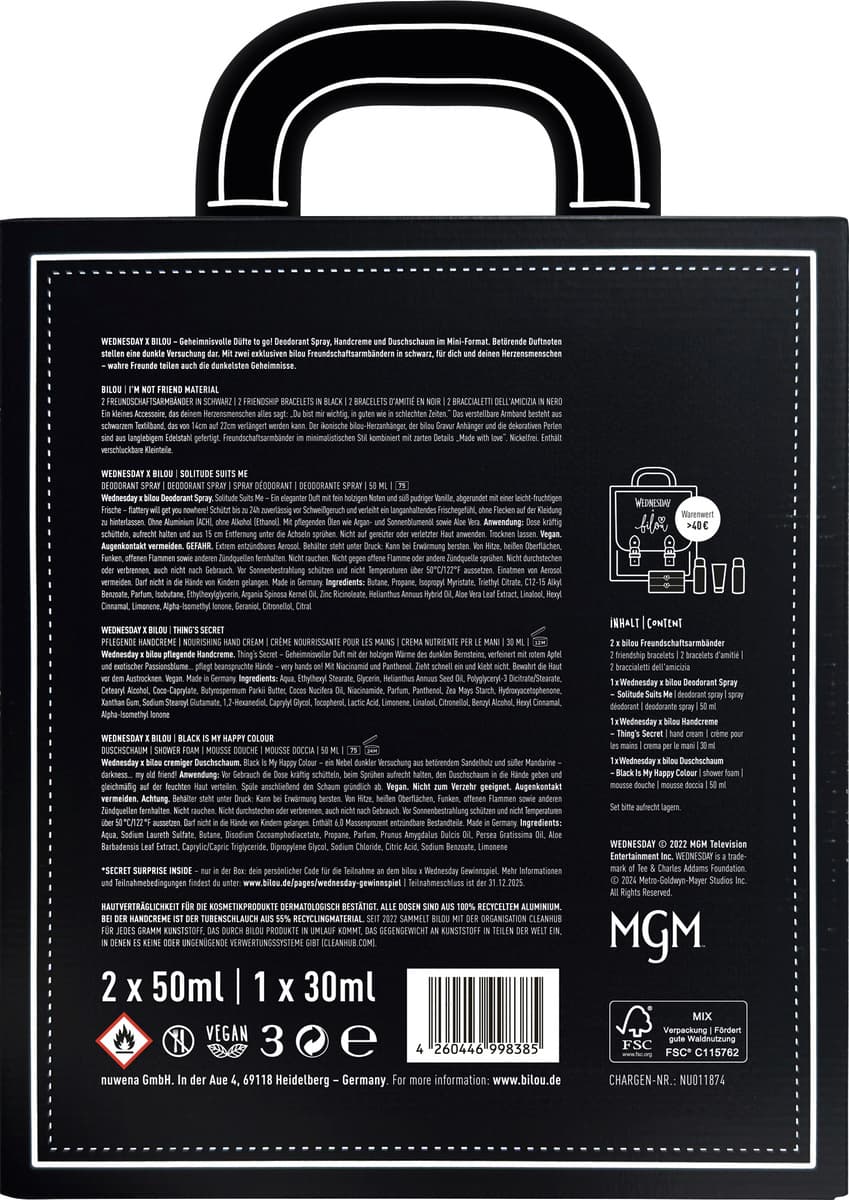 Wednesday x bilou – Geheimnisvolle Düfte to go! Deodorant Spray, Handcreme und Duschschaum im Mini-Format. Betörende Duftnoten stellen eine dunkle Versuchung dar. Mit zwei exklusiven bilou Freundschaftsarmbändern in schwarz, für dich und deinen Herzensmenschen – wahre Freunde teilen auch die dunkelsten Geheimnisse. WEDNESDAY © 2022 MGM. WEDNESDAY is a trademark of Tee & Charles Addams Foundation. © 2024 MGM. ARR. bilou | I’m not friend material | 2 Freundschaftsarmbänder in schwarz - Ein kleines Accessoire, das deinem Herzensmenschen alles sagt: „Du bist mir wichtig, in guten wie in schlechten Zeiten.“ Das verstellbare Armband besteht aus schwarzem Textilband, das von 14cm auf 22cm verlängert werden kann. Der ikonische bilou-Herzanhänger, der bilou Gravur Anhänger und die dekorativen Perlen sind aus langlebigem Edelstahl gefertigt. Freundschaftsarmbänder im minimalistischen Stil kombiniert mit zarten Details „Made with love“. Nickelfrei.. Enthält verschluckbare Kleinteile. Wednesday x bilou Deodorant Spray. Solitude Suits Me - Ein eleganter Duft mit fein holzigen Noten und süß pudriger Vanille, abgerundet mit einer leicht-fruchtigen Frische – flattery will get you nowhere! Schützt bis zu 24h zuverlässig vor Schweißgeruch und verleiht ein langanhaltendes Frischegefühl, ohne Flecken auf der Kleidung zu hinterlassen. Ohne Aluminium (ACH), ohne Alkohol (Ethanol). Mit pflegenden Ölen wie Argan- und Sonnenblumenöl sowie Aloe Vera. Vegan. Made in Germany. Wednesday x bilou pflegende Handcreme. Thing‘s Secret – Geheimnisvoller Duft mit der holzigen Wärme des dunklen Bernsteins, verfeinert mit rotem Apfel und exotischer Passionsblume… pflegt beanspruchte Hände - very hands on! Mit Niacinamid und Panthenol. Zieht schnell ein und klebt nicht. Bewahrt die Haut vor dem Austrocknen. Mit Niacinamid und Panthenol. Zieht schnell ein und klebt nicht. Bewahrt die Haut vor dem Austrocknen. Vegan. Made in Germany. Wednesday x bilou cremiger Duschschaum – Black Is My Happy Colour – ein Nebel dunkler Versuchung aus betörendem Sandelholz und süßer Mandarine – darkness… my old friend! Vegan. Made in Germany. *Secret Surprise Inside – nur in der Box: dein persönlicher Code für die Teilnahme an dem bilou x Wednesday Gewinnspiel. Mehr Informationen und Teilnahmebedingungen findest du unter: www.bilou.de/pages/wednesday-gewinnspiel | Teilnahmeschluss ist der 31.12.2025.