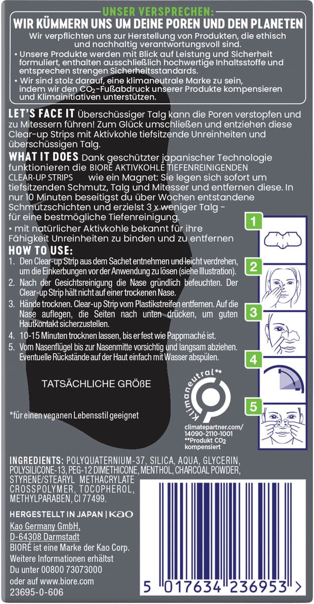 | Anwendungshinweis | how to use: 1. Den Clear-Up Strip aus dem Sachet entnehmen und leicht verdrehen, um die Einkerbungen vor der Anwendung zu lösen (siehe Illustration). 2. Nach der Gesichtsreinigung die Nase gründlich befeuchten. Der Clear-Up Strip hält nicht auf einer trockenen Nase. 3. Hände trocknen. Clear-Up Strip vom Plastikstreifen entfernen. Auf die Nase auflegen, die Seiten nach unten drücken, um guten Hautkontakt sicherzustellen. 4. 10-15 Minuten trocknen lassen, bis er fest wie Pappmaché ist. 5. Vom Nasenflügel bis zur Nasenmitte vorsichtig und langsam abziehen. Eventuelle Rückstände auf der Haut einfach mit Wasser abspülen. |