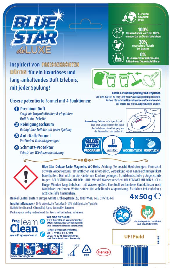 | Anwendungshinweis | Blue Star Deluxe unter den Rand der Toilettenschüssel hängen, wo der Wasserfluss am besten ist. |