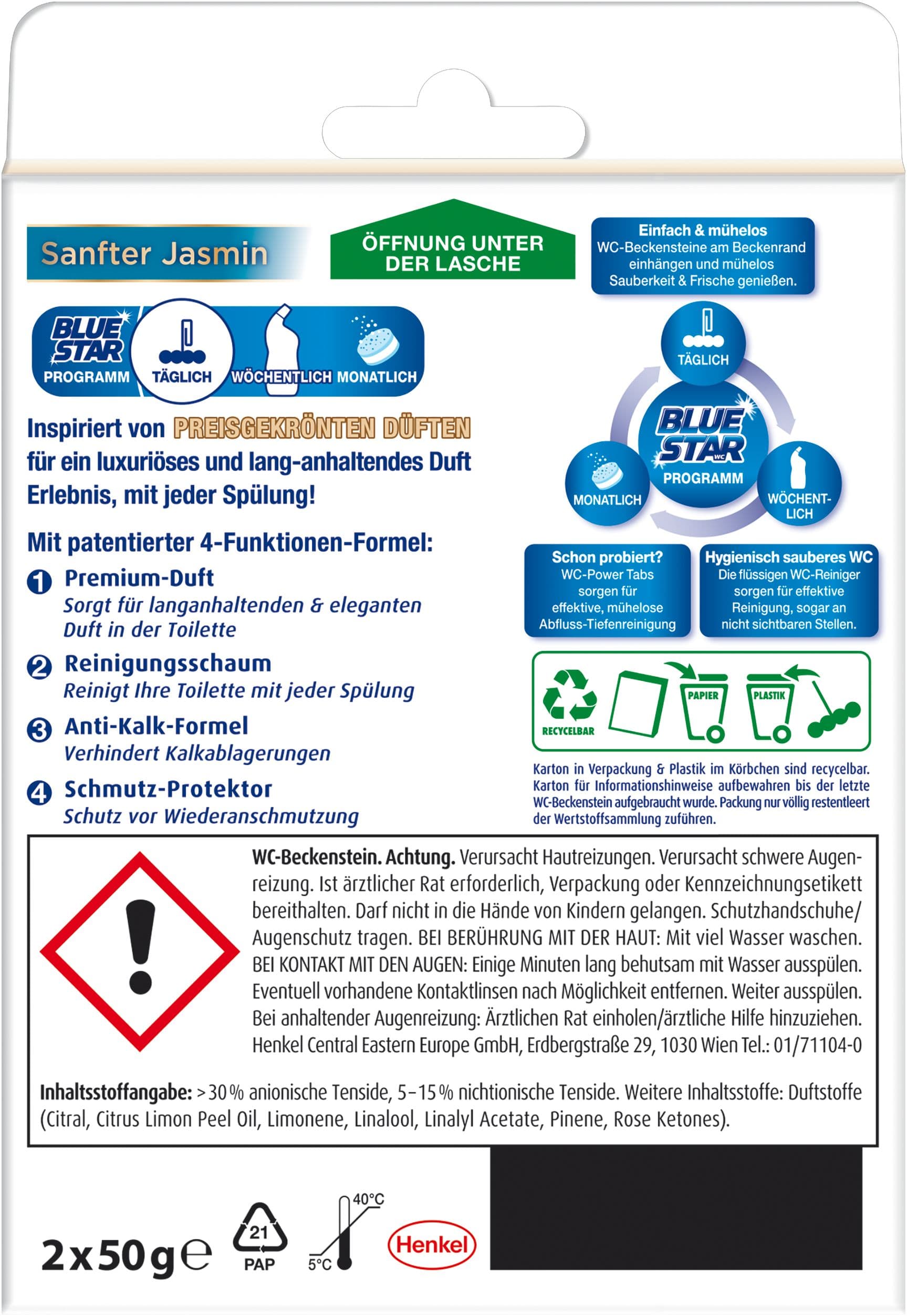 | Anwendungshinweis | Gebrauchsfertiges Produkt. Blue Star deLUXE unter den Rand der Toilettenschüssel hängen, wo der Wasserfluss am besten ist. |