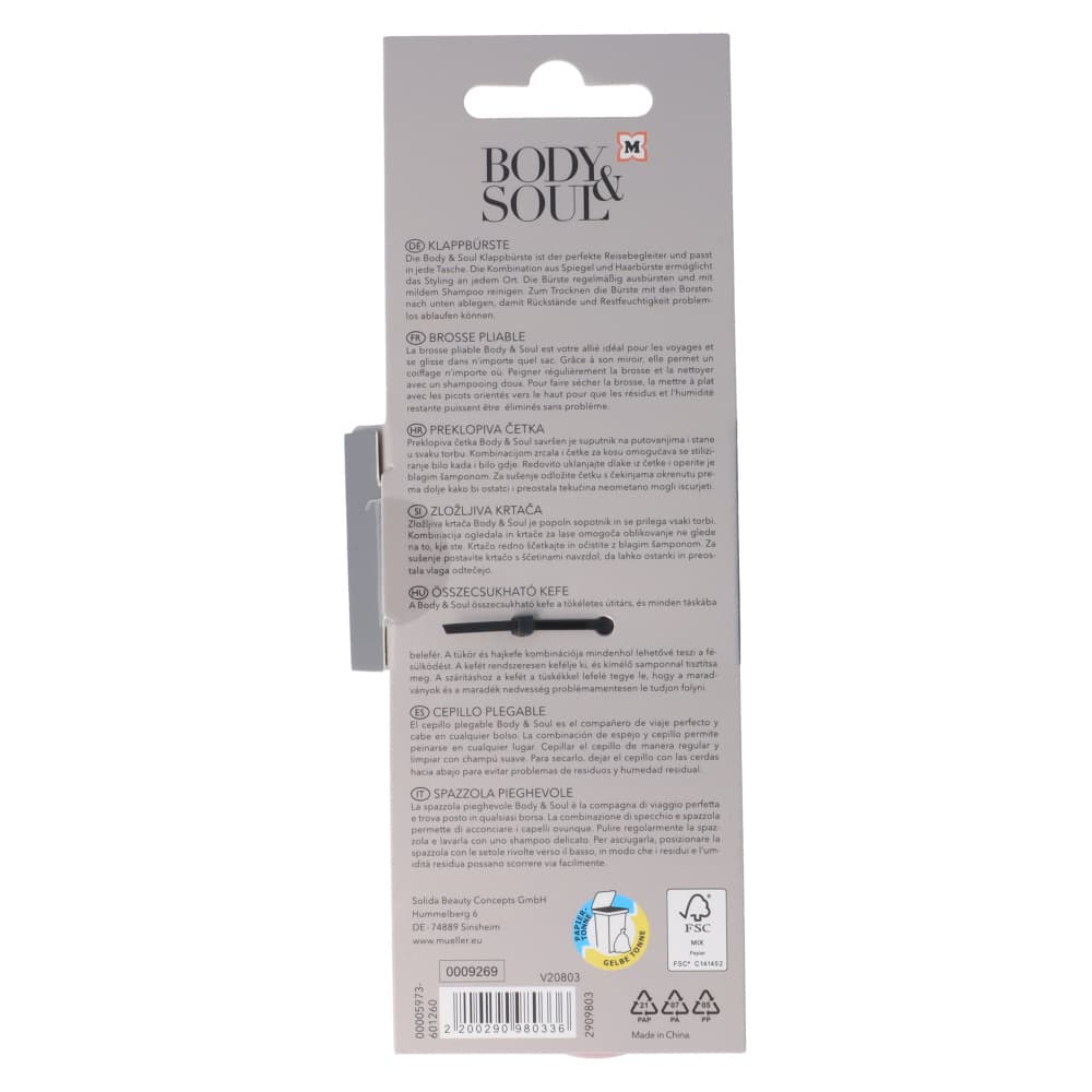 Die Body&Soul Klappbürste ist der perfekte Reisebegleiter und passt in jede Tasche. Die Kombination aus Spiegel und Haarbürste ermöglicht das Styling an jedem Ort. Die Bürste regelmäßig ausbürsten und mit mildem Shampoo reinigen. Zum Trocknen die Bürste mit den Borsten nach unten ablegen, damit Rückstände und Restfeuchtigkeit problemlos ablaufen können.
