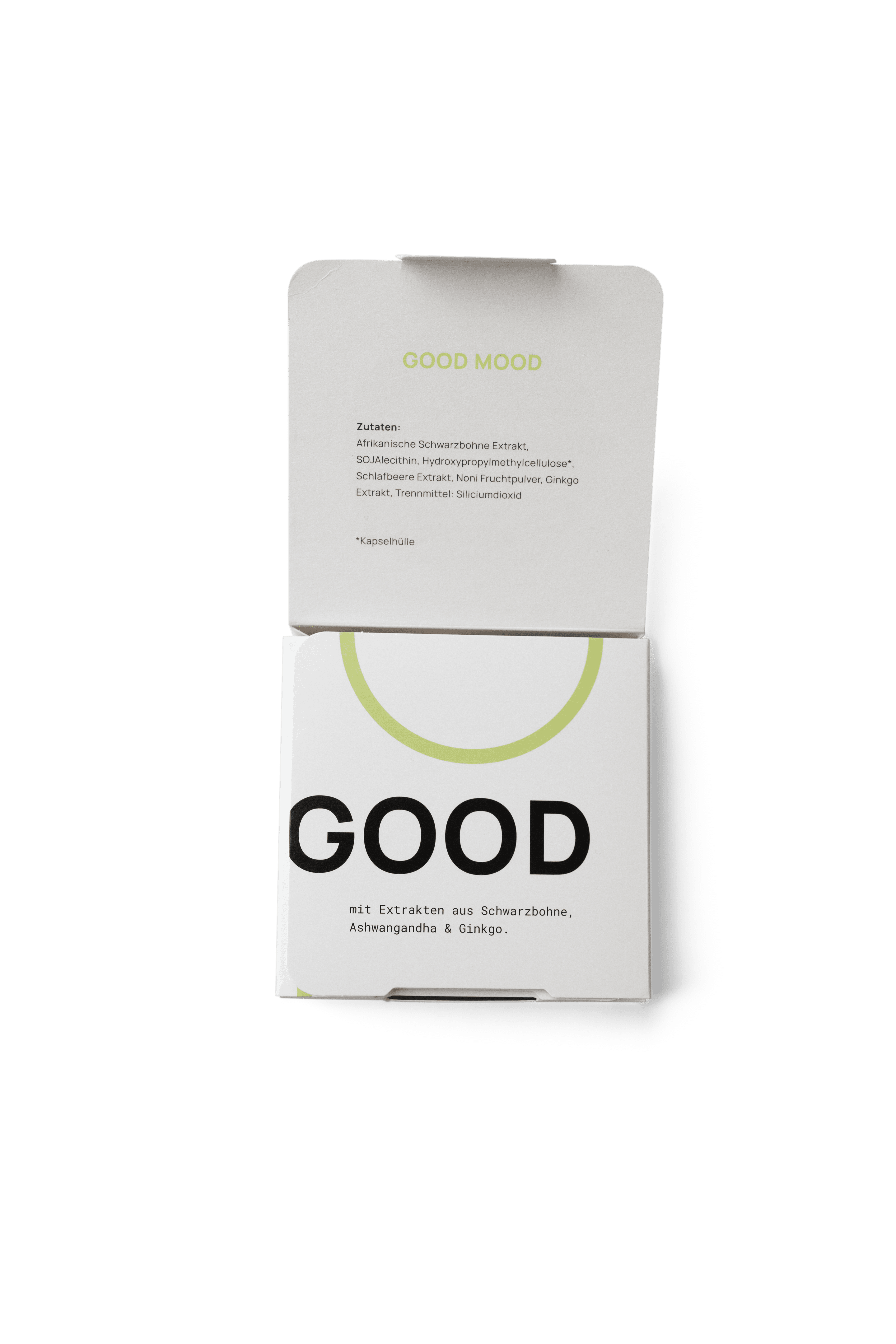 Nahrungsergänzungsmittel: In unserem hektischen Alltag kann es manchmal schwierig sein, die innere Balance zu bewahren und sich rundum wohl zu fühlen. Stress, wechselnde Anforderungen und eine Vielzahl an äußeren Einflüssen können das emotionale Gleichgewicht beeinflussen und die Stimmung trüben. Good Mood kombiniert eine sorgfältige Auswahl an natürlichen Inhaltsstoffen, die harmonisch darauf abgestimmt sind, das allgemeine Wohlbefinden zu fördern und den Körper auf natürliche Weise zu unterstützen. Mit hochwertigem Griffonia-Extrakt aus der Schwarzbohne enthält Good Mood eine natürliche Quelle für 5-HTP, eine Vorstufe von Serotonin. Ergänzt wird die Formel durch Ashwagandha-Extrakt, eine Wurzel, die seit Jahrhunderten in der ayurvedischen Tradition geschätzt wird. Das Noni-Fruchtpulver bringt eine Vielfalt an sekundären Pflanzenstoffen mit, die die exotische Mischung abrunden. Zudem enthält Good Mood Phosphatidylserin, das natürlicherweise in