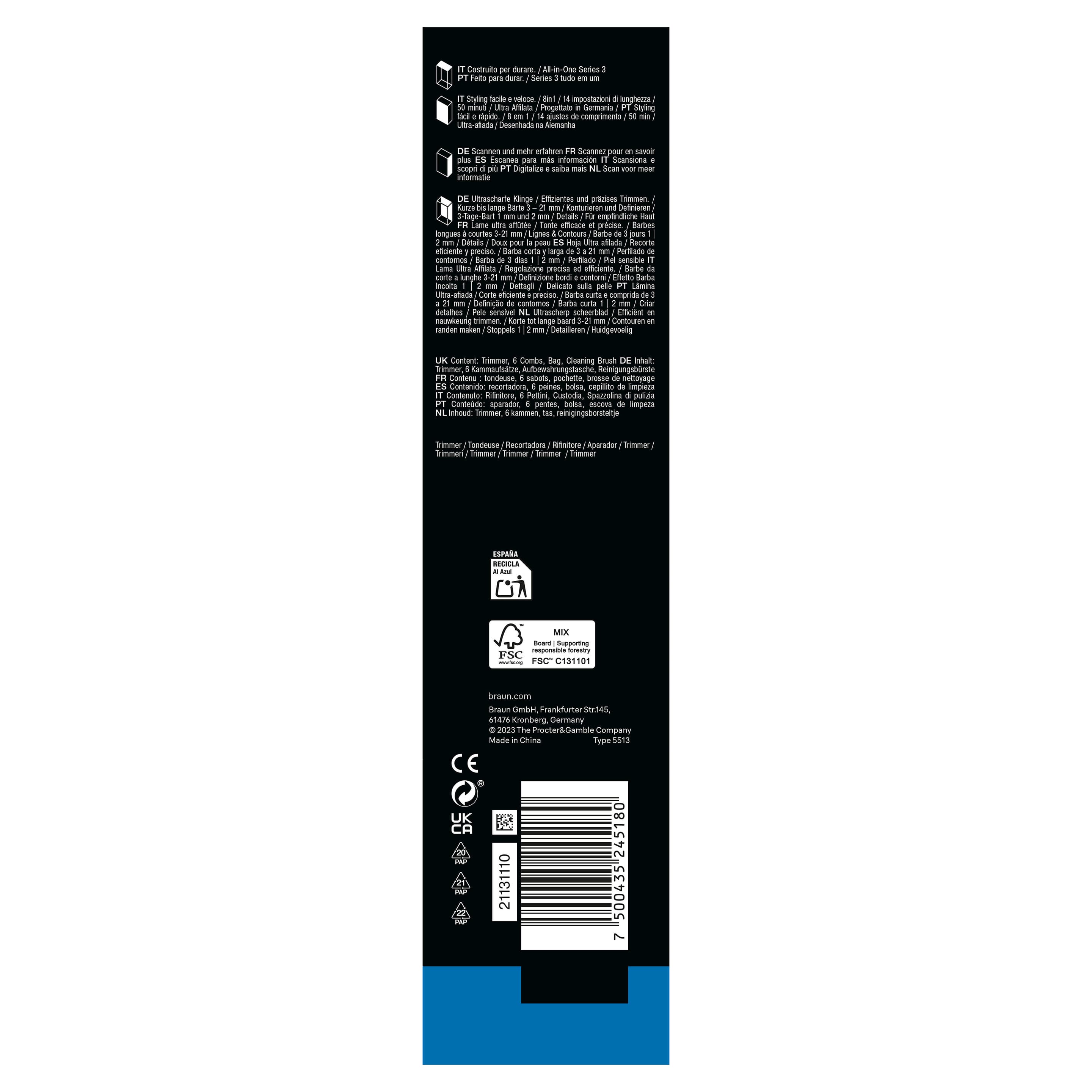 Brauns All-in-One Pflegeset für Männer. Das 8-in-1 Tool Set ermöglicht müheloses Trimmen von Gesicht und Haaren. Die ultrascharfe Klinge sorgt im kürzester Zeit für präzise und effiziente Ergebnisse. Die 14 Längeneinstellungen erlauben für volle Kontrolle über das Styling. Das Set enthält abwaschbare Aufsätze sowie eine Reinigungsbürste für eine schnelle und einfache Reinigung. Der langlebige, robuste Braun AIO Series 3 bietet eine Laufzeit von 50 Minuten.Lieferumfang: 1 Trimmer, 6 Kammaufsätze, 1 Reinigungsbürste, 1 Tasche