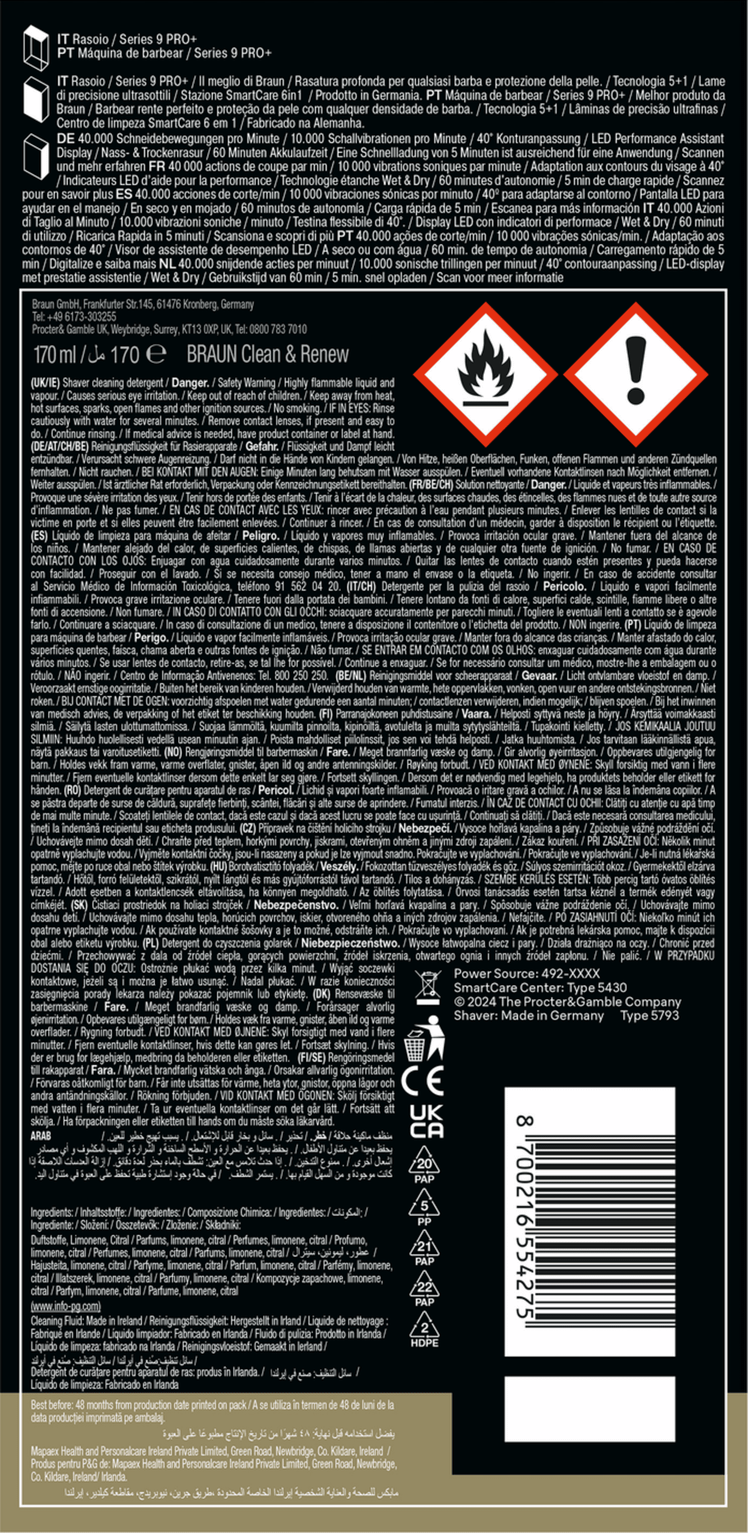 | Lieferumfang | 1x Braun Series 9 PRO+ Rasierer, 1x Reiseetui, 1x Ladegerät, 1x Reinigungsbürste, 1x 6-in-1 SmartCare Center, 1x Reinigungskartusche |