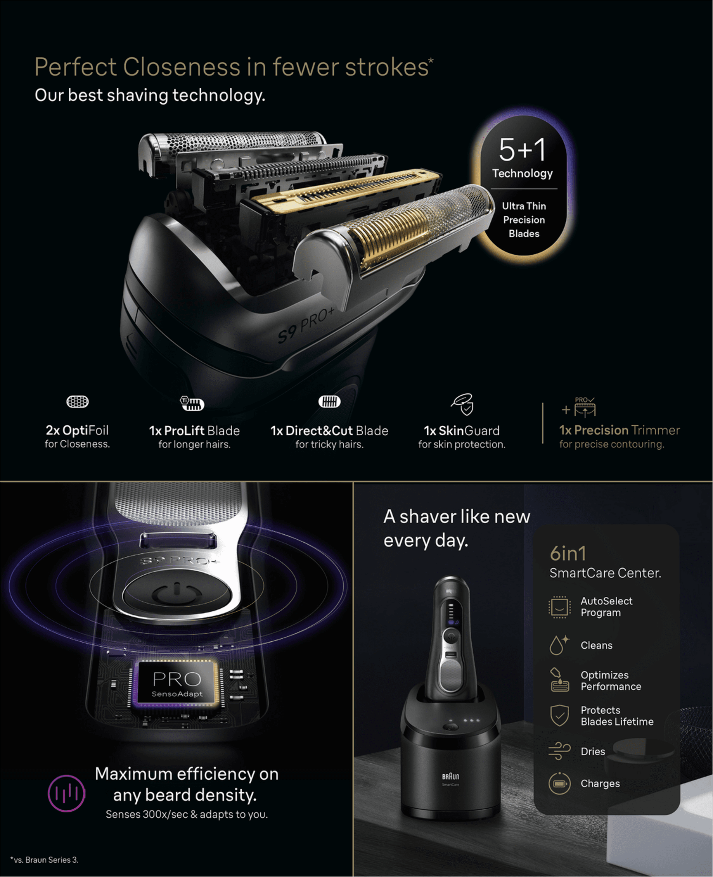 Der Braun Series 9 PRO+ Elektrorasierer für Männer wurde entwickelt, um perfekte Gründlichkeit und Hautschutz zu erzielen. Unsere ultradünnen Präzisionsklingen liefern die ultimative Rasur. Die 5+1 Scherkopf-Technologie synchronisiert perfekt die Direct&Cut Klinge, den ProTrimmer, die hautschonende OptiFoil, den schützenden SkinGuard und die titanbeschichtete ProLift-Klinge. Die Pro-SensoAdapt Technologie analysiert die Bartdichte 300x pro Sekunde und passt die Rasierleistung automatisch an. Inklusive 6-in-1 SmartCare Center, optimiert durch AutoSelect Programm, Reinigen, Schutz der Klingenlebensdauer, Trocknen, Aufladen und Erhaltung der Rasierleistung. Der Series 9 PRO+ Elektrorasierer für Männer ist zu 100% wasserdicht.