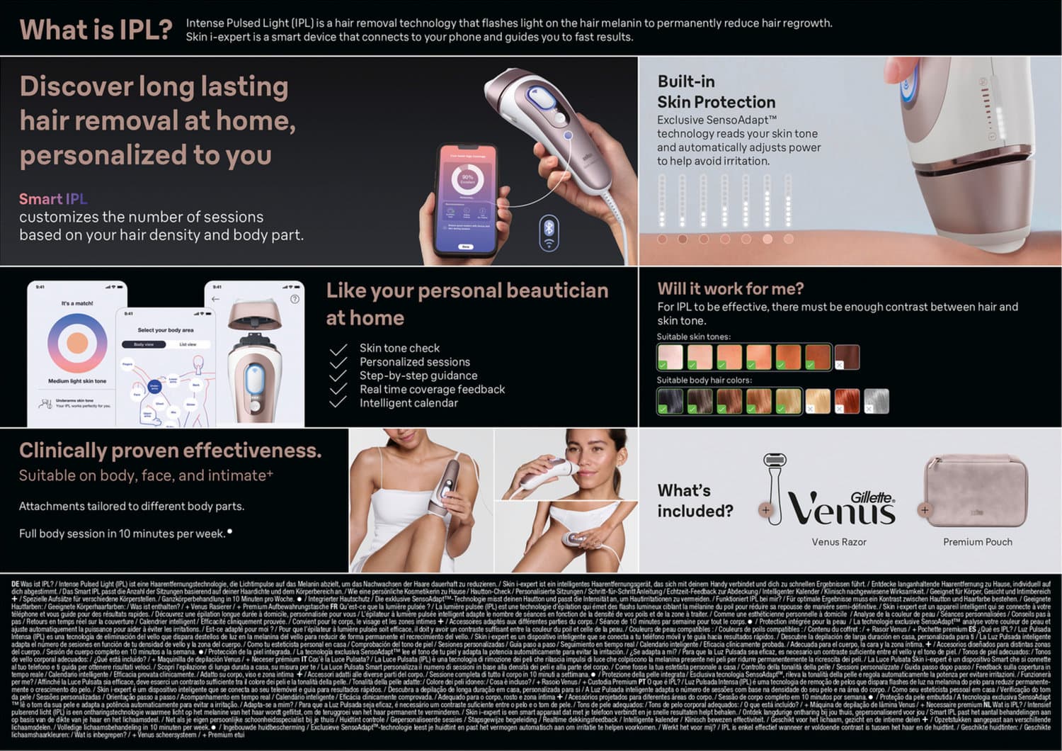 Verwende dieses Gerät nicht: auf der Kopfhaut, an den Augenbrauen oder in der Nähe der Augen. Eine Verwendung in diesen Bereichen könnte zu einer dauerhaften Schädigung der Augen führen; wenn du eine Tätowierung oder ein Permanent-Make-Up in dem zu behandelnden Bereich hast; an den Brustwarzen, im Genitalbereich oder in der Nähe des Anus. Diese Bereiche haben ggf. eine dunklere Hautfarbe oder eine stärkere Haardichte, weshalb die Verwendung des Geräts in diesen Bereichen zu Unwohlsein/Schmerzen führen oder deine Haut verletzen kann; wenn du braune oder schwarze Flecken wie Sommersprossen, Muttermale, Leberflecken oder Warzen in dem zu behandelnden Bereich hast; an Bart/Gesichtshaar bei Männern. Die Verwendung beim männlichen Bart oder Gesichtshaar kann zu permanenten oder ungleichmäßigen Ergebnissen führen, die ggf. zu unerwünschten Veränderungen der Gesichtshaut führen können. Es wird nicht empfohlen, dieses Gerät in Bereichen zu verwenden, in denen Dermalfüller vorhanden sind. Verwende das Gerät nicht mehr als einmal pro Woche an derselben Stelle. Nach längerer oder wiederholter Behandlung an einer Stelle können Hautschäden auftreten. Sicherheit der Augen Schau nicht direkt in den Glasfilter (9) und richte das Gerät nicht auf die Augen. Zu deiner Sicherheit und der von Personen in der Nähe kann das Gerät nur aktiviert werden, wenn die Hautsensoren direkt auf der Haut platziert werden. Sollte das Gerät einen Lichtimpuls auslösen, wenn die Hautsensoren NICHT die Haut berühren, verwende das Gerät nicht mehr und kontaktiere deinen Händler. Es können Augenverletzungen (die zum Verlust des Sehvermögens führen können) oder Hautverletzungen auftreten, wenn die Anweisungen nicht befolgt werden. Schütze dein Auge vor dem Lichtimpuls. Verwende das Gerät nicht über den Augenlidern oder in der Nähe des Auges. Wir empfehlen, den Blick vom Gerät abzuwenden, wenn die Anwendungstaste gedrückt wird. Vorsicht Dieses Gerät ist für einen einzelnen Benutzer vorgesehen. Personen mit eingeschränkten physischen, sensorischen oder mentalen Fähigkeiten oder einem Mangel an Erfahrung und/oder Wissen dürfen das Gerät verwenden, wenn sie dabei unter Aufsicht stehen oder eine Anleitung zur sicheren Verwendung des Geräts erhalten haben und die damit verbundenen Risiken verstehen. Kinder sollten beaufsichtigt werden, damit sie nicht mit dem Gerät spielen. Bewahre das Gerät immer für Kinder unzugänglich auf. Es gibt eine Reihe potenzieller Risiken – Verbrennungen oder Augenschäden durch die Lichtleistung, Stromschlag, Strangulation durch das Kabel. Elektrizität und Brandschutz Prüfe Gerät und Kabel regelmäßig auf sichtbare Anzeichen von Beschädigungen. Im Falle von Beschädigungen oder Rissen darf das Gerät nicht benutzt werden. Die Verwendung eines beschädigten Geräts kann zu einem Stromschlag führen. Im Falle eines Defekts sollte das Gerät von einem autorisierten Servicecenter überprüft werden. Eine unsachgemäß ausgeführte Reparatur kann zu extremen Risiken für den Benutzer führen. ACHTUNG Nach Gebrauch und im Falle eines Stromausfalls immer den Netzstecker ziehen, um Risiken oder Schäden zu vermeiden. Das Gerät darf keinen starken Erschütterungen ausgesetzt werden, um eine Beschädigung der Lampe zu vermeiden. Positioniere das Gerät so, dass es immer leicht vom Stromnetz zu trennen ist. Im eingeschalteten Zustand darf das Gerät niemals unbeaufsichtigt gelassen werden, um das Risiko von Bränden und Verbrennungen zu vermeiden. WARNUNG Wenn die Steckdose, über die das Gerät mit Strom versorgt wird, schlechten Kontakt hat, wird der Stecker des Geräts heiß. Schließe das Gerät immer an eine sachgemäß installierte Steckdose an, um das Risiko von Bränden und Verbrennungen zu vermeiden. Es dürfen keine Veränderungen am Gerät vorgenommen werden. Verwende keine anderen Komponenten und nimm keine Manipulationen am Gerät vor. Dadurch kann das Gerät beschädigt werden und nicht mehr funktionieren. GEFAHR Versuche niemals, das Gerät zu reparieren oder zu öffnen, um eventuellen Kontakt mit elektrischen Bauteilen oder pulsierter Lichtenergie zu vermeiden. Beides kann zu ernsthaften Verletzungen und/oder einer dauerhaften Schädigung der Augen führen. WARNUNG: Wasser und Elektrizität sind eine gefährliche Kombination. Um das Risiko eines Stromschlags zu senken: verwende das Gerät nicht in nassen Umgebungen (z. B. im Badezimmer, in der Nähe einer Dusche oder eines Pools); darf des Gerät nicht in Kontakt mit Wasser kommen. Verwende niemals ein nasses Gerät, da es sonst zu Stromschlägen kommen kann. Verwende das Gerät nicht, wenn es beschädigt ist (z. B. wenn das Gehäuse Risse aufweist oder das Kabel beschädigt ist). Die inneren Teile enthalten elektrische Ladungen, die gefährlich sind. Prüfe das Anwendungsfenster (1) regelmäßig auf Beschädigung: Verwende das Gerät nicht, wenn der Glasfilter (9) gerissen ist oder fehlt. Berühre den Glasfilter nicht während der Benutzung oder unmittelbar danach, da er sich während des Gebrauchs aufheizt. Verwende keine petroleumbasierten oder entzündlichen Reinigungsmittel (Alkohol, Azetone) auf dem Gerät, da diese zu Brandgefahr führen. Verwende keine aggressiven Reinigungsmittel. Diese können das Gerät beschädigen oder den Glasfilter zerkratzen. Verwende das Gerät nicht zu anderen Zwecken als zur Entfernung unerwünschter Haare. Verwende das Gerät nicht auf anderen Oberflächen als auf Haut. Drücke die Anwendungstaste nicht, wenn das Anwendungsfenster (1) keinen vollständigen Kontakt zur Haut aufweist. Die Lüftungsschlitze dürfen nicht blockiert werden, da das Gerät ggf. überhitzen, einen elektrischen Schlag oder Brand auslösen könnte. Bei fortgesetztem Gebrauch kann die Temperatur des Geräts bis zu 60 °C erreichen. Entferne das Gerät nach der Behandlung von der Haut.
