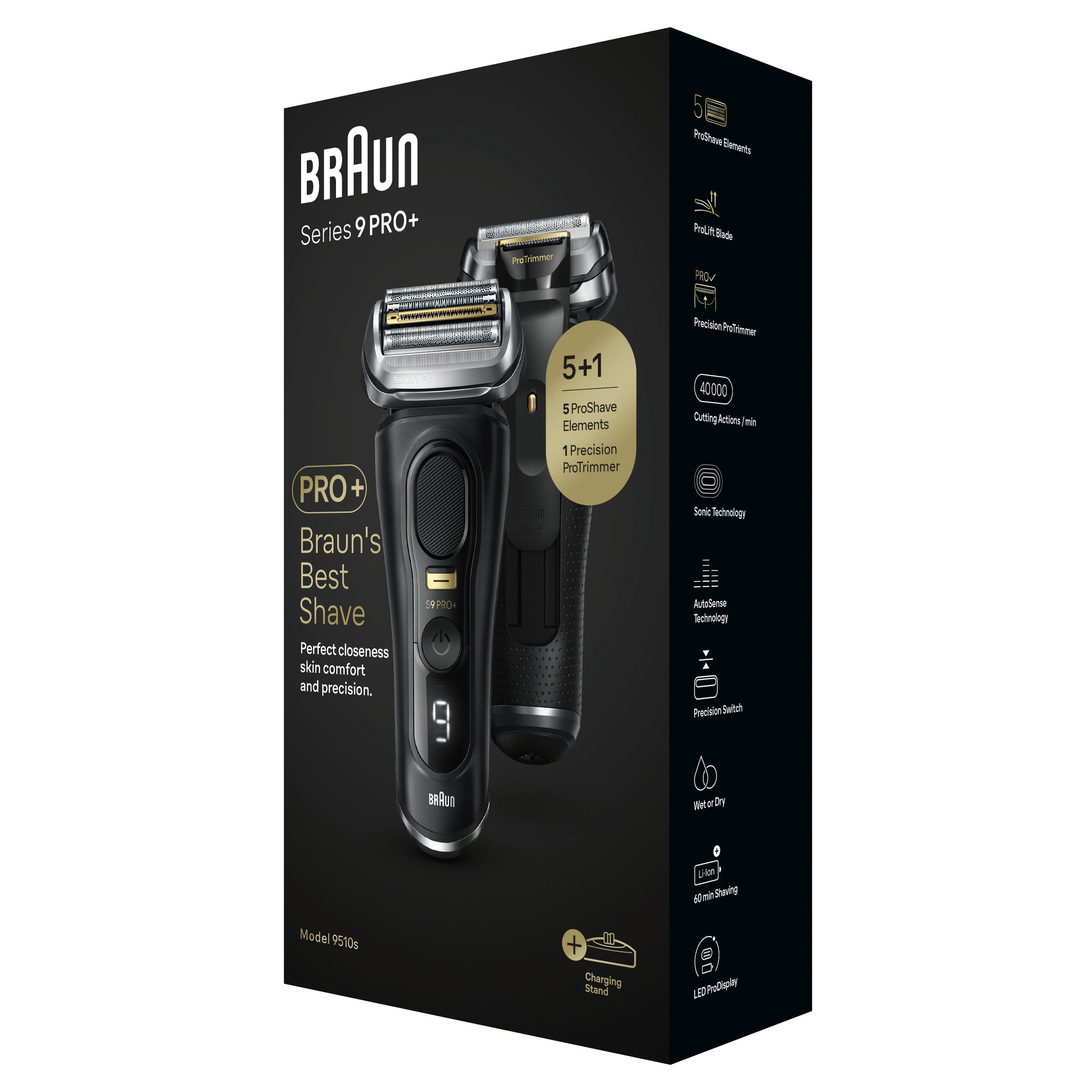 Der Braun Series 9 Pro+ Elektrorasierer definiert die Rasur neu – für eine gründliche Rasur mit ultimativem Hautkomfort. Mit 5 speziellen ProShave-Elementen inklusive ProLift-Klinge. Der Series 9 Pro+ sorgt für eine effiziente und sanfte Rasur in jedem Zug, egal ob Sie einen 1-, 3- oder 7-Tage-Bart haben. Erleben Sie die ultimative Präzision dank ProTrimmer mit Klingen aus Chirurgenstahl, der selbst längere Haare, Koteletten und Schnurrbart effektiv erfasst. Komplett in Deutschland hergestellt und mit einer langen Lebensdauer, selbst bei täglicher Rasur, sowie einem leistungsstarken Li-Ionen-Akku mit 60 Min Laufzeit. Für Trocken- und Nassrasur geeignet. Mit Ladestation.