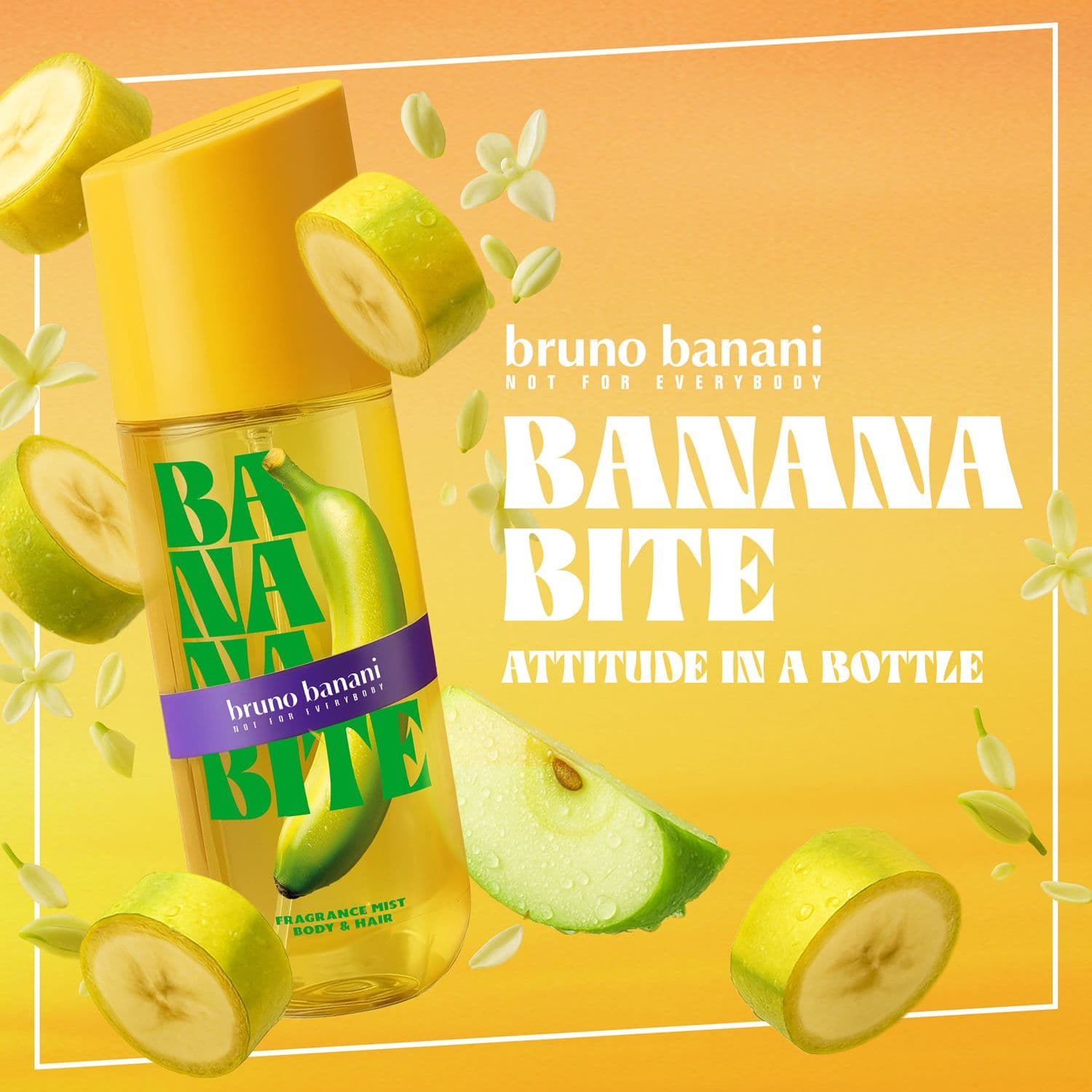 Erlebe die süchtig machenden Body & Hair Mists von bruno banani – für jede Stimmung, jeden Moment und jeden Main Character Vibe. Diese Body & Hair Mists sind mehr als nur ein Duft: Sie sind Attitude in a Bottle und passend für jeden Vibe. Von einem Flirt am Nachmittag bis hin zu unvergesslichen Nächten. Wähle den Duft, der zu deiner Stimmung passt und sprühe ihn von Kopf bis Fuß auf. Ideal für eine schnelle Auffrischung zwischendurch, vom Gym am Morgen bis hin zum Drink am Abend. Banana Bite ist eine floral-fruchtige Bananen-Obsession mit exotischem Twist. Der lebendige Duft vereint Noten von grüner Banane und spritzigem Kokosnusswasser mit elegantem Jasmin und üppiger Tuberose. Sinnliche Vanille und Patschuli verleihen dem tropischen Duft eine warme, luxuriöse Tiefe.