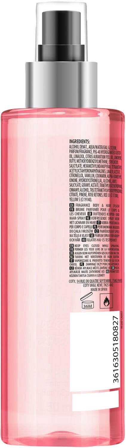 | Inhaltsstoffe | INGREDIENTS: ALCOHOL DENAT., AQUA/WATER/EAU, GLYCERIN, PARFUM/FRAGRANCE, PEG-40 HYDROGENATED CASTOR OIL, LINALOOL, CITRUS AURANTIUM PEEL OIL, LIMONENE, BUTYL METHOXYDIBENZOYLMETHANE, ETHYLHEXYL SALICYLATE, HEXAMETHYLINDANOPYRAN, TETRAMETHYL ACETYLOCTAHYDRONAPHTHALENES, LINALYL ACETATE, CITRONELLOL, VANILLIN, COUMARIN, ALPHA-ISOMETHYL IONONE, HYDROXYCITRONELLAL, ALCOHOL, AMYL SALICYLATE, GERANYL ACETATE, TRIMETHYLBENZENEPROPANOL, CINNAMYL ALCOHOL, TRIS(TETRAMETHYLHYDROXYPIPERIDINOL) CITRATE, PINENE, ROSE KETONES, RED 33 (CI 17200), YELLOW 5 (CI 19140). |