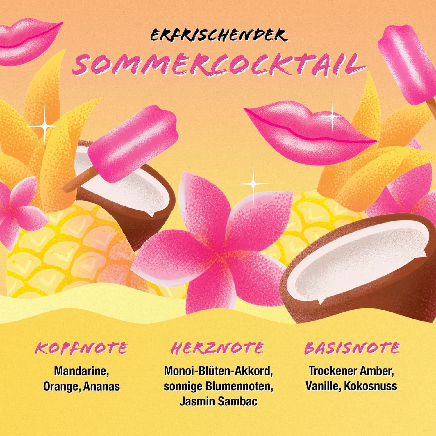 Feier den Sommer, mit dem neuen bruno banani Limited Edition Body & Hair Mist für Sie. Das floral-fruchtige Dufterlebnis versprüht den Vibe einer ausgelassenen Strandparty mit Freunden und erinnert an einen erfrischenden Cocktail. Der limitierte Duft eröffnet mit einer spritzigen Mischung aus Mandarine, Orange und Ananas, die sich dann zu einem blühenden Bouquet aus Monoi-Blüten-Akkord, süßem Jasmin-Sambac und sonnigen Blumennoten entwickelt. Warme, trockene Noten von cremiger Kokosnuss und Tonkabohne, die an ein sonnenverwöhntes tropisches Paradies erinnern runden das feminine Dufterlebnis harmonisch ab. Das erfrischend leichte Body & Hair Mist für Frauen ist die perfekte Ergänzung zum passenden Eau de Toilette, eignet sich aber auch fürs Duft-Layering mit anderen Lieblingsdüften von bruno banani.