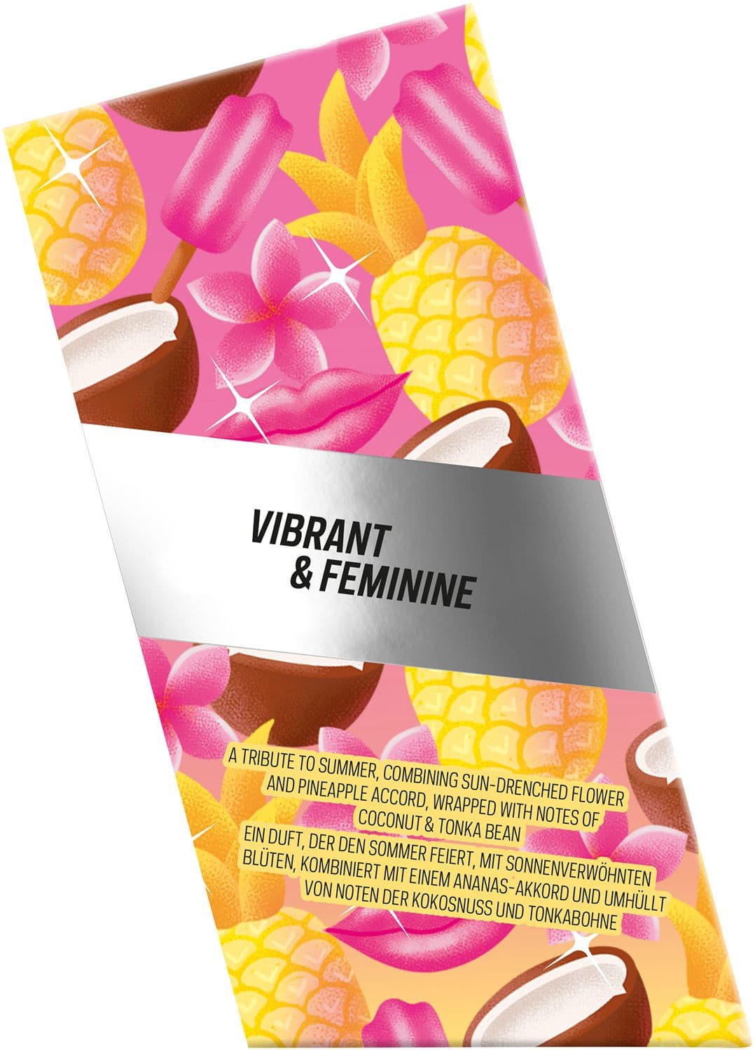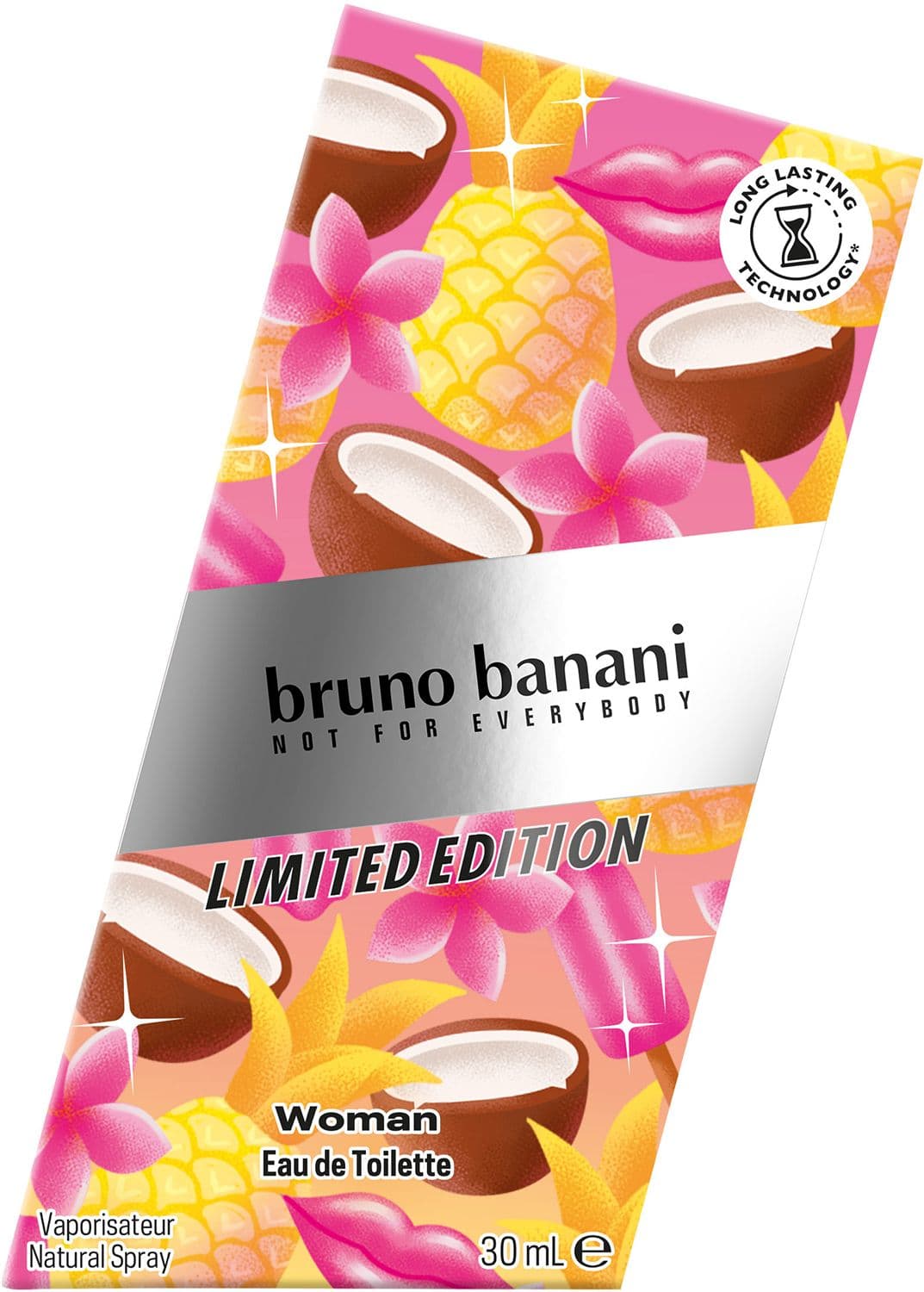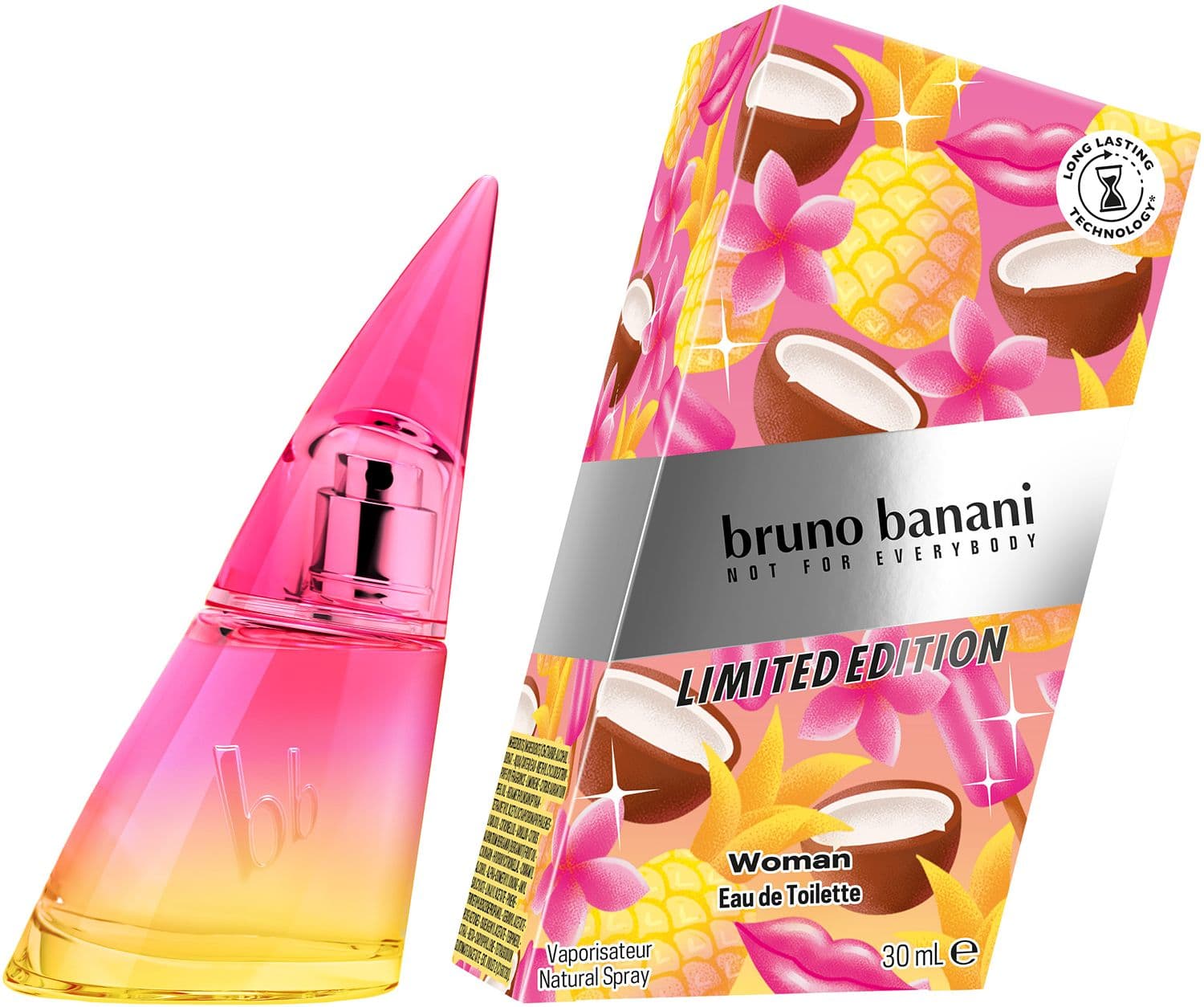 Feier den Sommer, mit dem neuen bruno banani Limited Edition Eau de Toilette für Sie. Das langanhaltende, floral-fruchtige Dufterlebnis versprüht den Vibe einer ausgelassenen Strandparty mit Freunden und erinnert an einen erfrischenden Cocktail. Der limitierte Duft eröffnet mit einer spritzigen Mischung aus Mandarine, Orange und Ananas, die sich dann zu einem blühenden Bouquet aus Monoi-Blüten-Akkord, süßem Jasmin-Sambac und sonnigen Blumennoten entwickelt. Warme, trockene Noten von cremiger Kokosnuss und Tonkabohne, die an ein sonnenverwöhntes tropisches Paradies erinnern, runden das feminine Dufterlebnis harmonisch ab. Das Eau de Toilette für Frauen setzt seine Duftnoten dank der patentierten Technologie über den Tag verteilt frei – für ein extra langanhaltendes Dufterlebnis. Passend zum lebensfrohen Sommer-Feeling erstrahlt der Flakon im pink-gelben Farbverlauf.