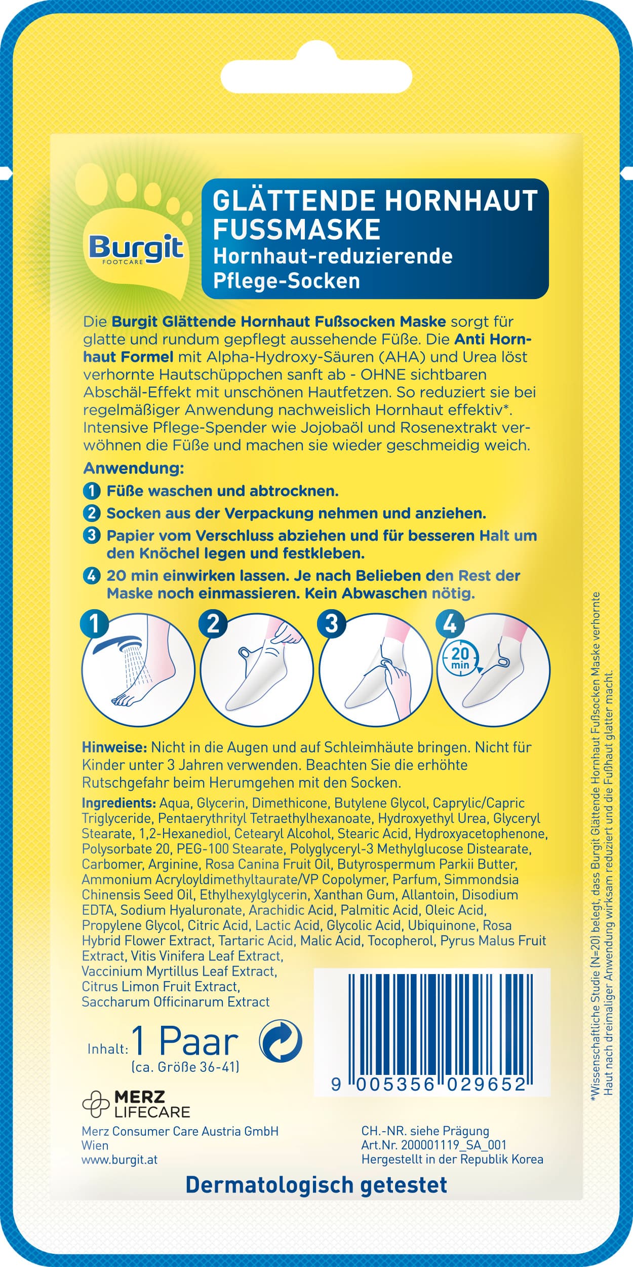 | Anwendungshinweis | 1. Füße waschen und abtrocknen. 2. Socken aus der Verpackung nehmen und anziehen. 3. Papier vom Verschluss abziehen und für besseren Halt um den Knöchel legen und festkleben. 4. 20 min einwirken lassen. Je nach Belieben den Rest der Maske noch einmassieren. Kein Abwaschen nötig. |