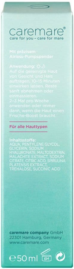 Kühlende Gelmaske mit Spirulina, Malachit-Extrakt und Hyaluron in der caremare Ageless Skin Formula. Die hochwirksame Formulierung versorgt die Haut intensiv mit Feuchtigkeit, schützt vor oxidativem Stress und lässt Anzeichen von Müdigkeit sichtbar gemildert erscheinen.