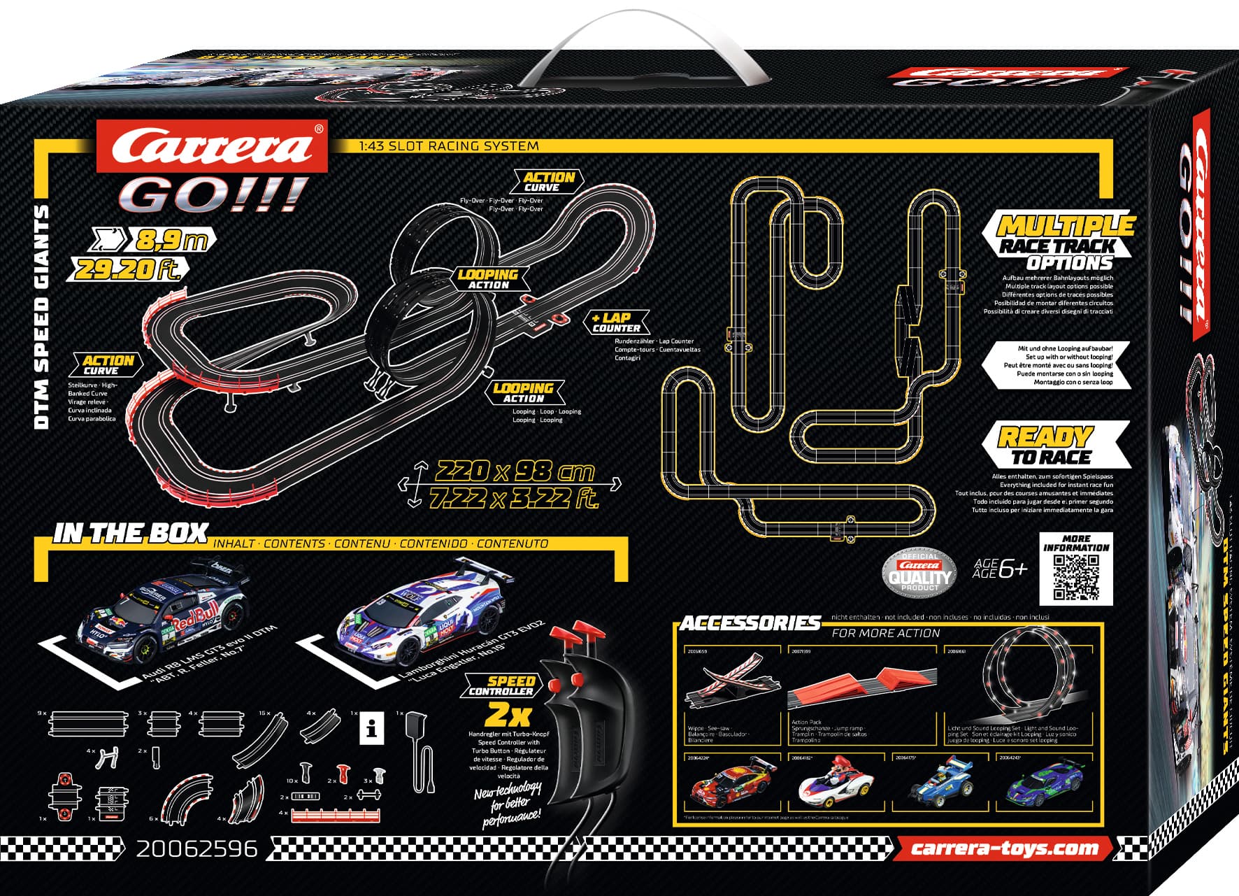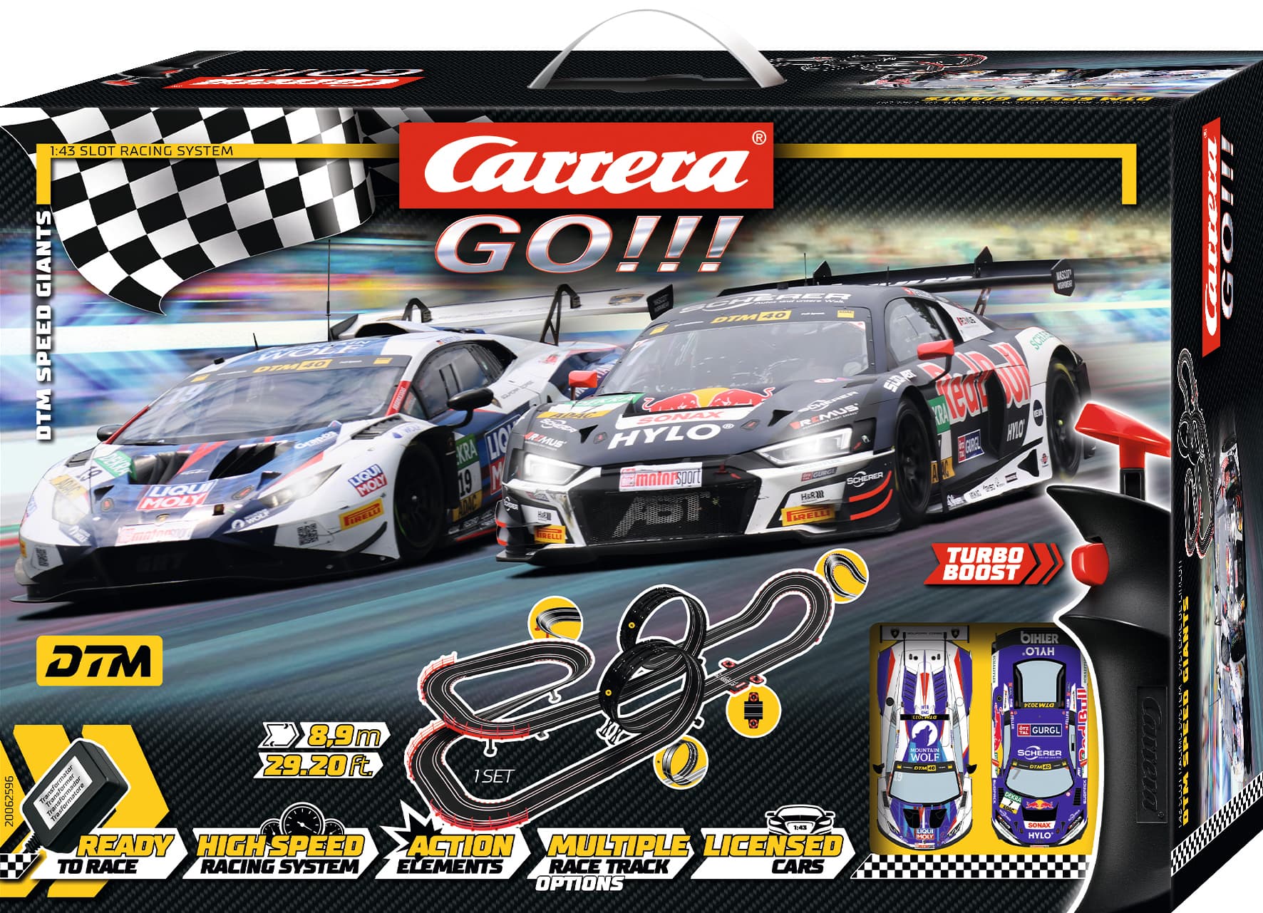 Mit dem Carrera GO!!! Set „DTM Speed Giants“ wird dein Wohnzimmer zur Hochgeschwindigkeits-Arena! Auf einer 8,9 Meter langen Rennstrecke liefern sich der Audi R8 LMS GT3 evo II DTM „ABT, R. Feller, No.7“ und der Lamborghini Huracán GT3 EVO2 „Luca Engstler, No.19“ packende Duelle. Zwei Loopings, Steilkurven und ein spektakulärer Fly-Over sorgen für maximale Action und Rennspaß.