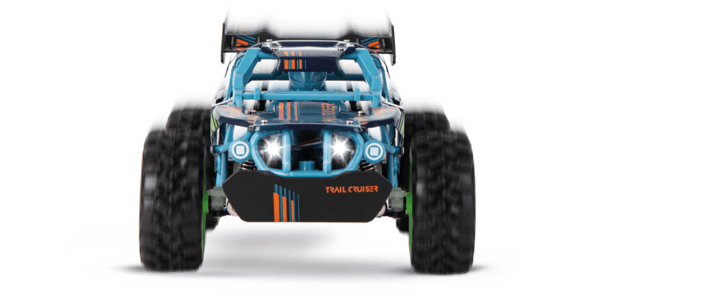 Bereit für Offroad-Action pur? Der Carrera RC 2,4 GHz Trail Cruiser ist der ideale Abenteuer-Buddy für kleine und große Gelände-Fans! Sobald der 23,5 cm lange Offroader los rollt, werfen die LED-Scheinwerfer ihr Licht über den Weg und eröffnen die nächste Etappe des Trails – ob bei Tageslicht oder in der Dämmerung. Für junge Entdecker ab 6 Jahren meistert der Cruiser Outdoor-Action mit bis zu 12 km/h, während die präzise Full Function Steuerung souveräne Kontrolle in jeder Kurve ermöglicht. Seine robuste Karosserie aus Metallteilen verleiht Stabilität, wenn das nächste Hindernis wartet. Ready to Run ausgestattet, startet das Abenteuer direkt nach dem Auspacken und verwandelt jede Fahrt in ein neues Offroad-Highlight.
