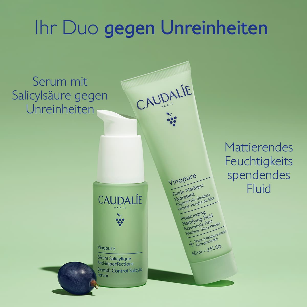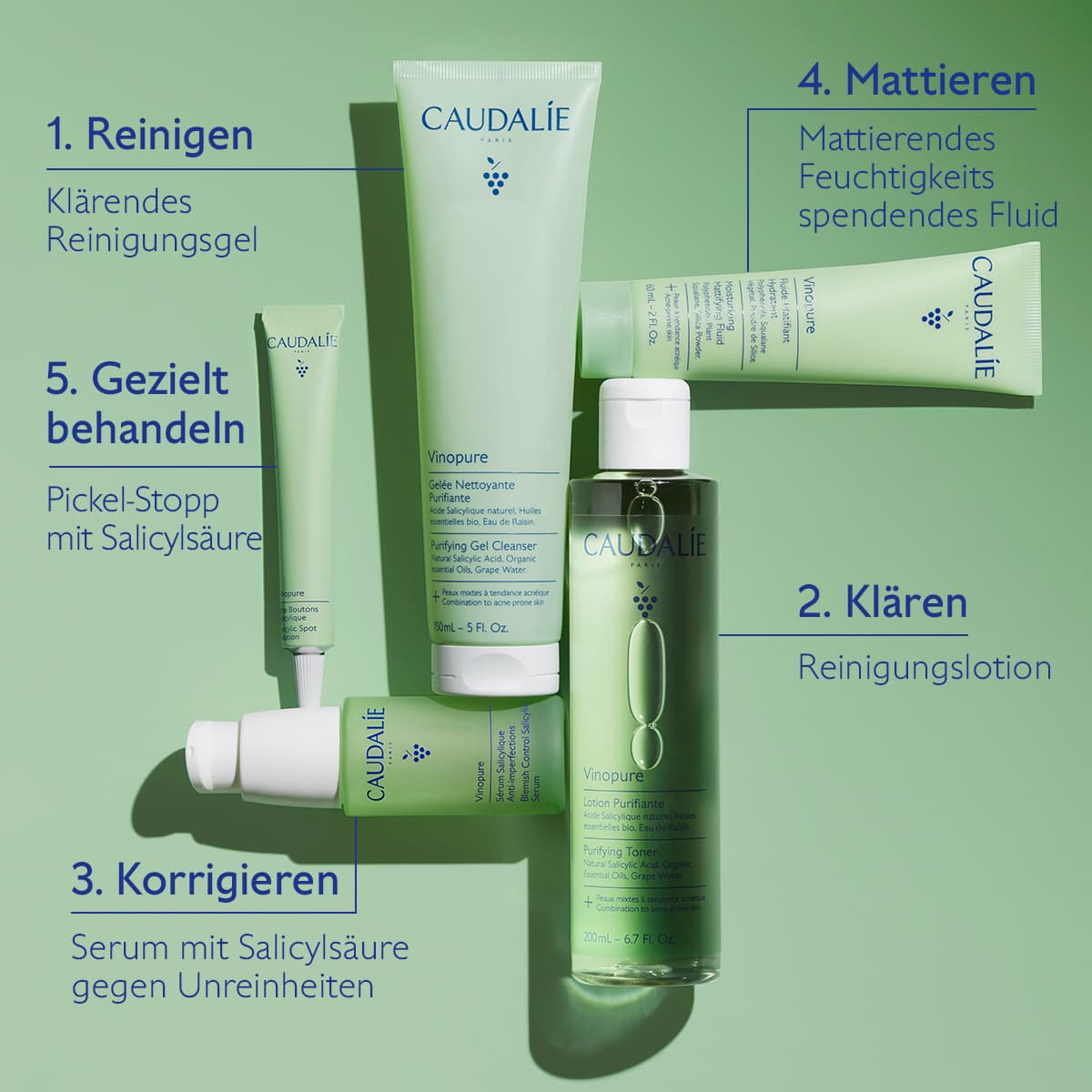 | Anwendungshinweis | Das Vinopure Serum gegen Unreinheiten morgens und abends auf die saubere und trockene Haut auftragen und dabei die Augenpartie vermeiden. Einige Minuten einwirken lassen, bevor die Creme auftragen wird. Wenn die Haut nach der Anwendung spannt, soll es nur einmal täglich angewendet werden. |