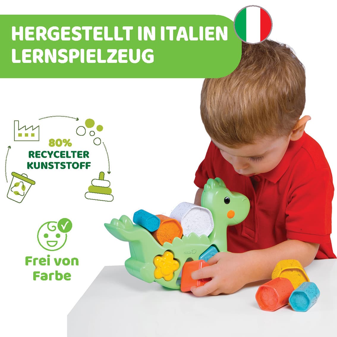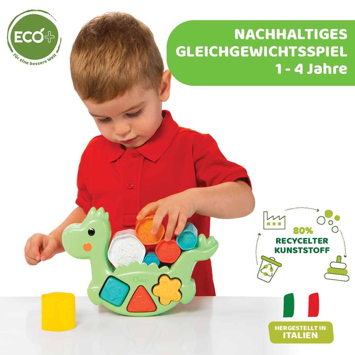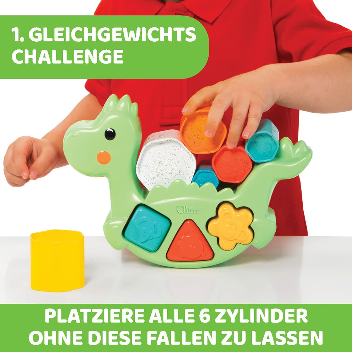 2 in 1 Balance- und Sortierdino. Finde das richtige Gleichgewicht mit den 6 Zylindern und setze die 3 Formen in ihren richtigen Platz ein. Balance-Aktivität: Lege alle 6 Zylinder in der richtigen Position auf den Dinosaurier, um ihn ins Gleichgewicht zu bringen und versuche dabei, keinen Zylinder fallen zu lassen. Sortier-Aktivität: Setze die 3 Formen in ihren richtigen Platz ein. Stapel alle Zylinder aufeinander, um einen Turm zu bauen. Das Spielzeug hilft mit 3 verschiedenen Aktivitäten kognitive und manuelle Fähigkeiten zu entwickeln. Hergestellt aus 80% recyceltem Kunststoff aus industriellem Produktionsüberschuss. Es werden verschiedene Farbkombinationen unter gleicher Artikelnummer angeboten. Die Abbildungen können demnach vom Original abweichen.