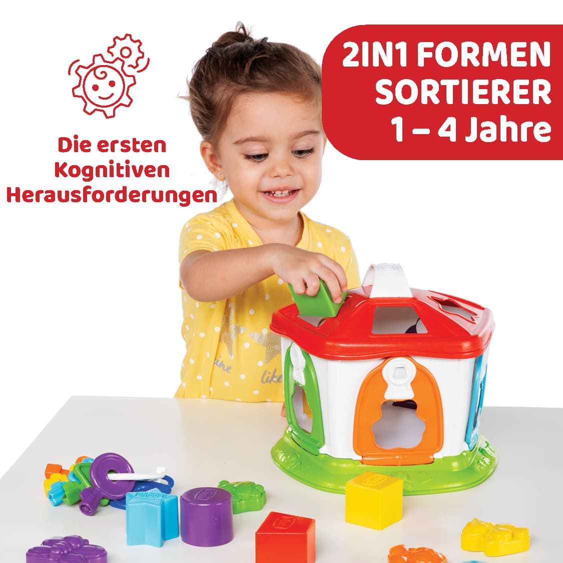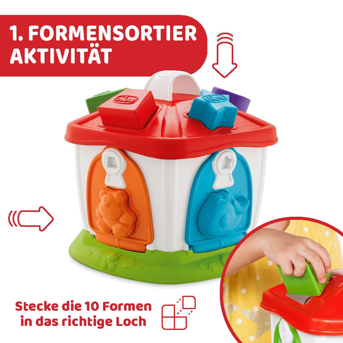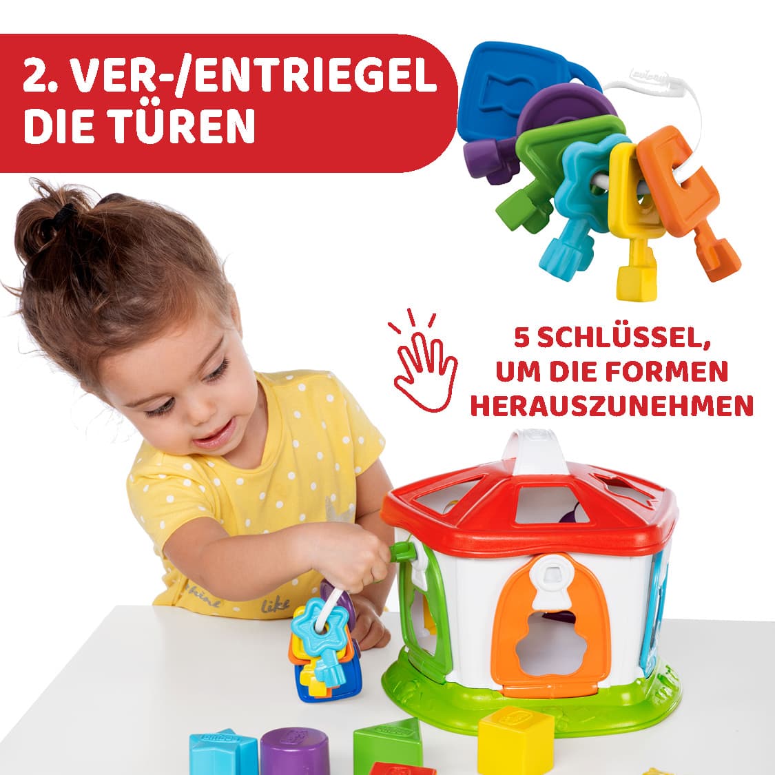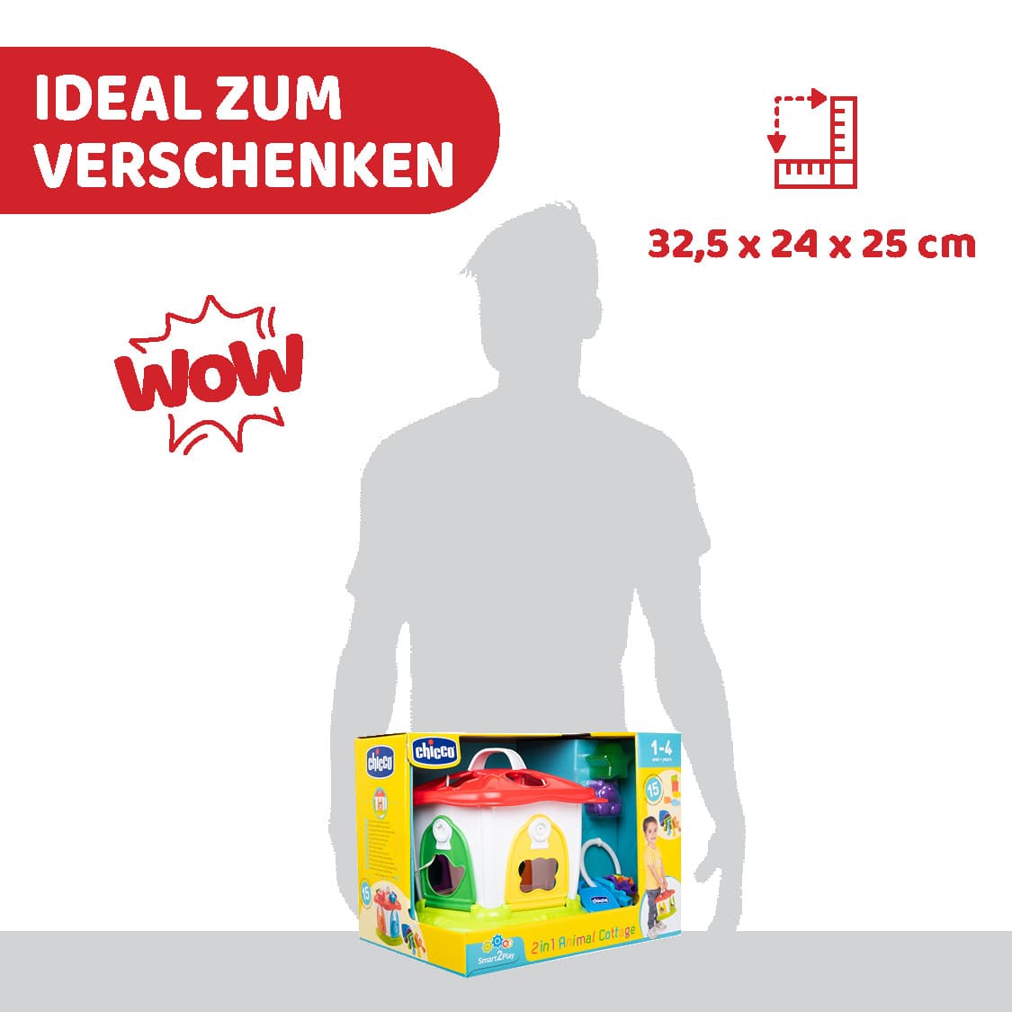 Die neue Smart2Play-Version des 2 in 1 Tierchen Zirkus ist ein komplettes Formsortierspielzeug.Ein Chicco-Klassiker mit neuem Design und leuchtenden Farben.2 in 1 Spielzeug, das den Kleinen dabei hilft, ihre kognitiven Fähigkeiten währendder Formsortierung zu entwickeln, bietet zwei verschiedene Schwierigkeitsgradeund stimuliert die Hand-Auge-Koordination und Präzision durch Öffnen undSchließen der Türen mit den 5 verschiedenen Schlüsseln.10 farbige Förmchen zum Einfügen (5 geometrische Formen und 5 Tiere)5 farbige Schlüssel zum Öffnen und Schließen der TürenPraktischer Griff zum Tragen