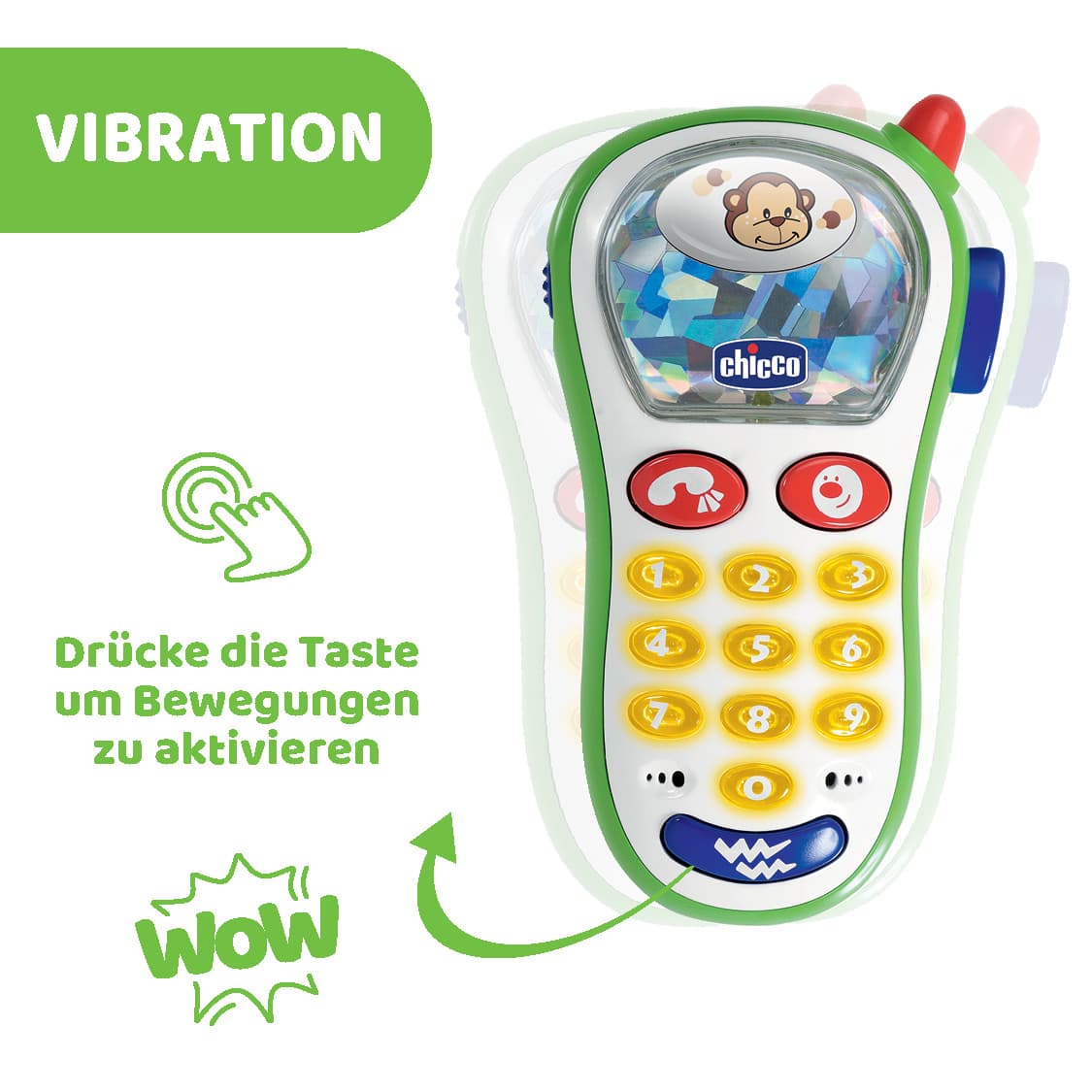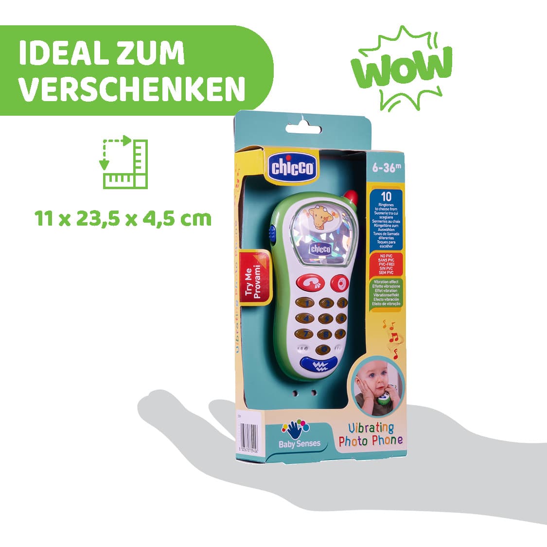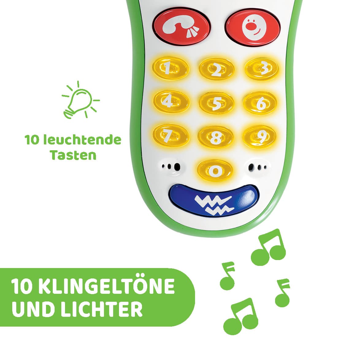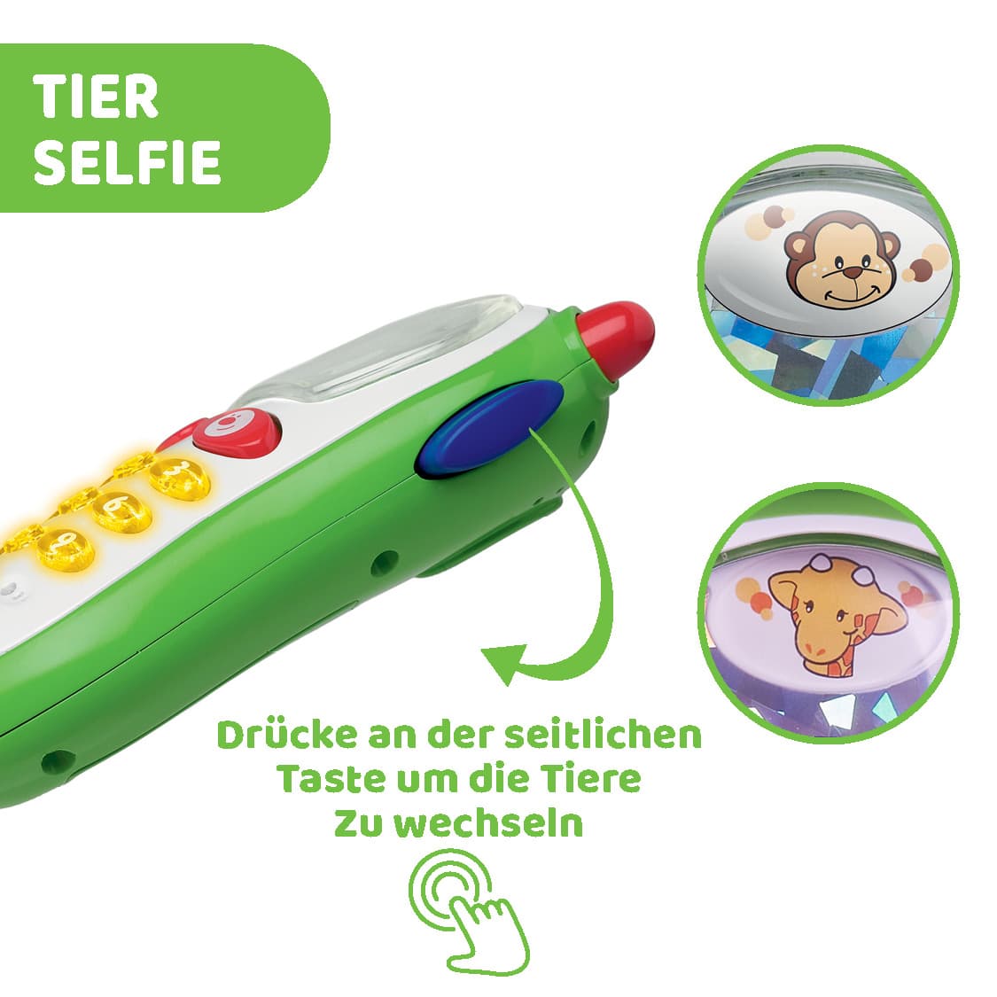Das erste Fotohandy Ihres Babys. Es kann damit verschiedene Tierfotos „schießen” und unter 10 Klingeltönen wählen, die von einem interessanten Lichterspiel begleitet werden. Zusätzlich vibriert das Handy wie ein echtes Handy für Erwachsene.