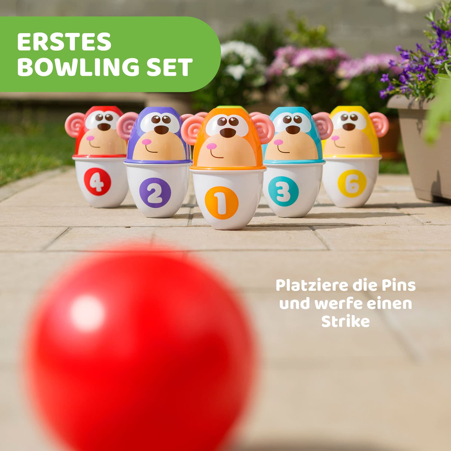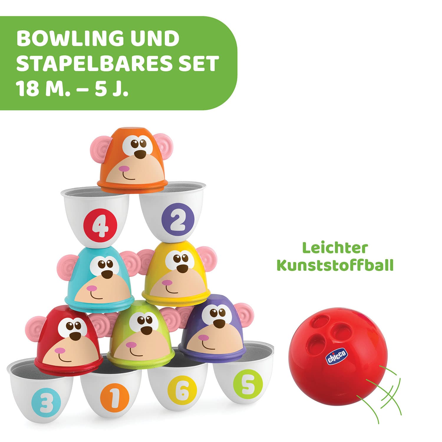 Das neue Bowling-Set von Chicco besteht aus sechs bunten Kegeln mit lustigen Affengesichtern und sorgt bei Kindern ab einem Alter von 18 Monaten für größten Kegelspaß. Auch der Kreativität sind bei dieser Aktivität keine Grenzen gesetzt: Jeder der sechs Kegel kann in zwei Hälften geteilt und verschieden aufeinandergesetzt werden, sodass die Kleinen 12 bunte Türme oder sogar eine Pyramide mit unterschiedlichen, austausch- und stapelbaren Elementen bauen können. Darüber hinaus hat jede Kegelfigur eine andere Farbe und Nummer, was das Zählen von eins bis sechs ganz einfach macht. Während das Kind versucht, die Kegel mit dem Ball umzustoßen, wird zusätzlich die visuelle und manuelle Koordination stimuliert und die Genauigkeit der Bewegung und die Treffsicherheit mit jedem Versuch verbessert. Besonderes Feature: Der Ball besteht aus einem sehr weichen Material, sodass die Kleinen auch problemlos im Haus bowlen können.