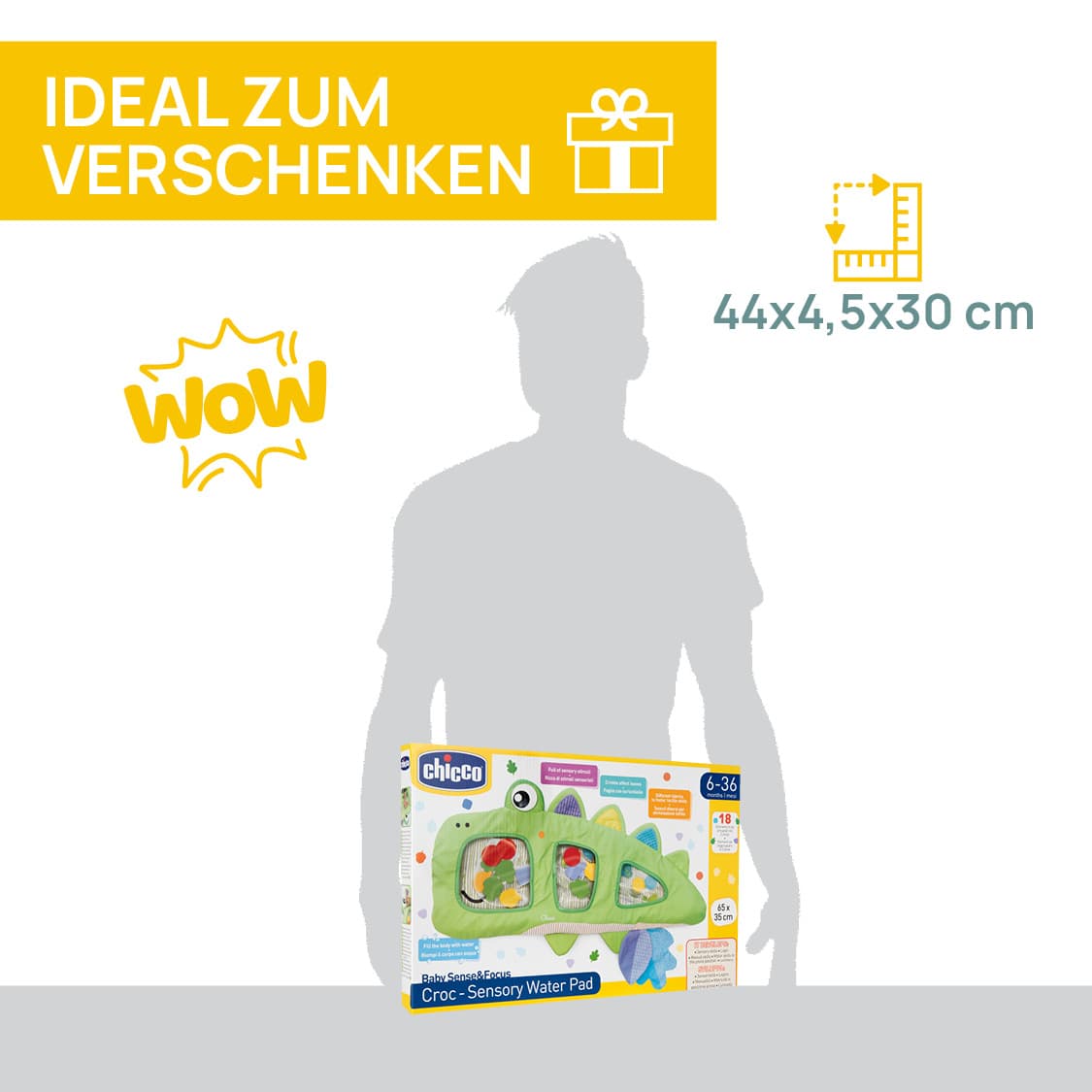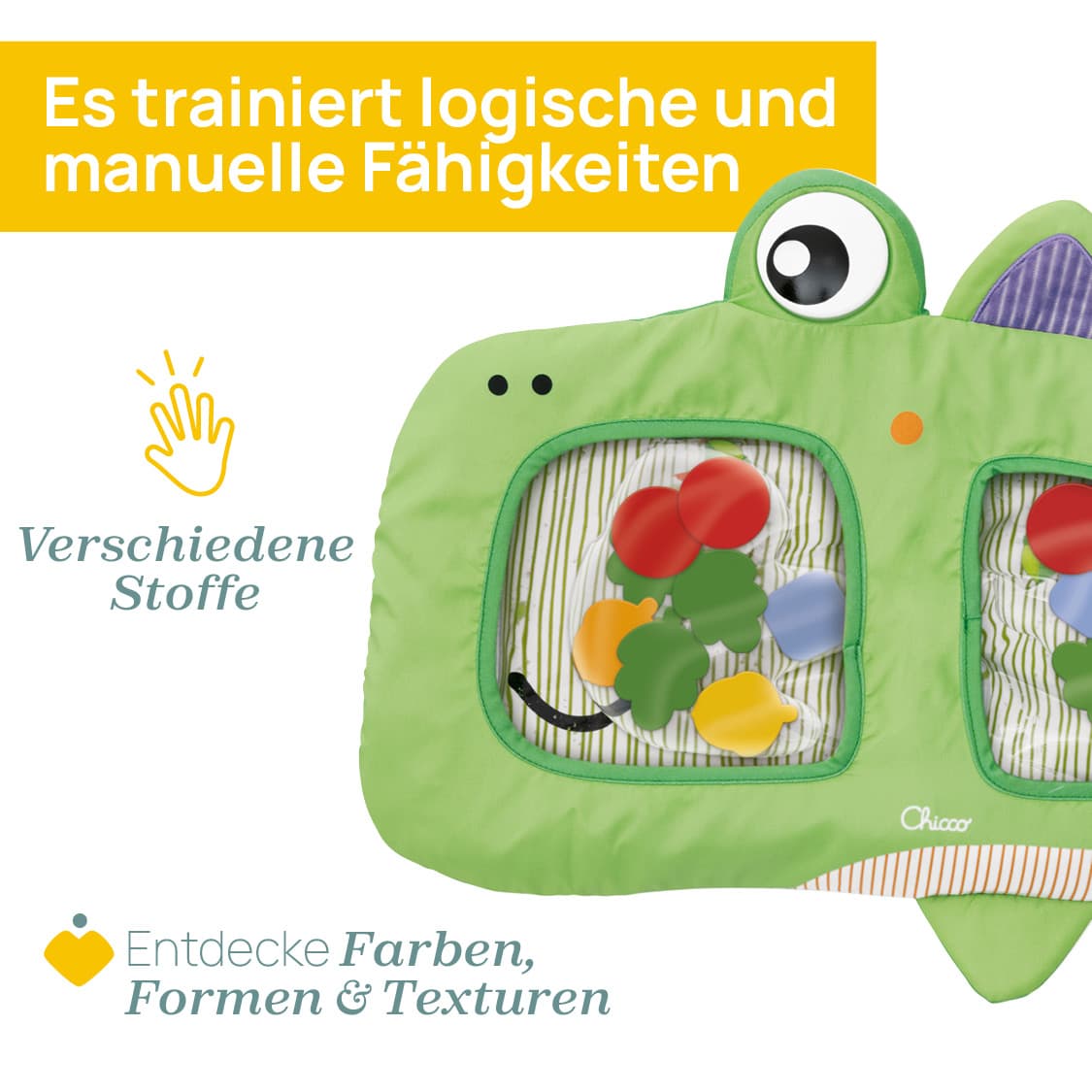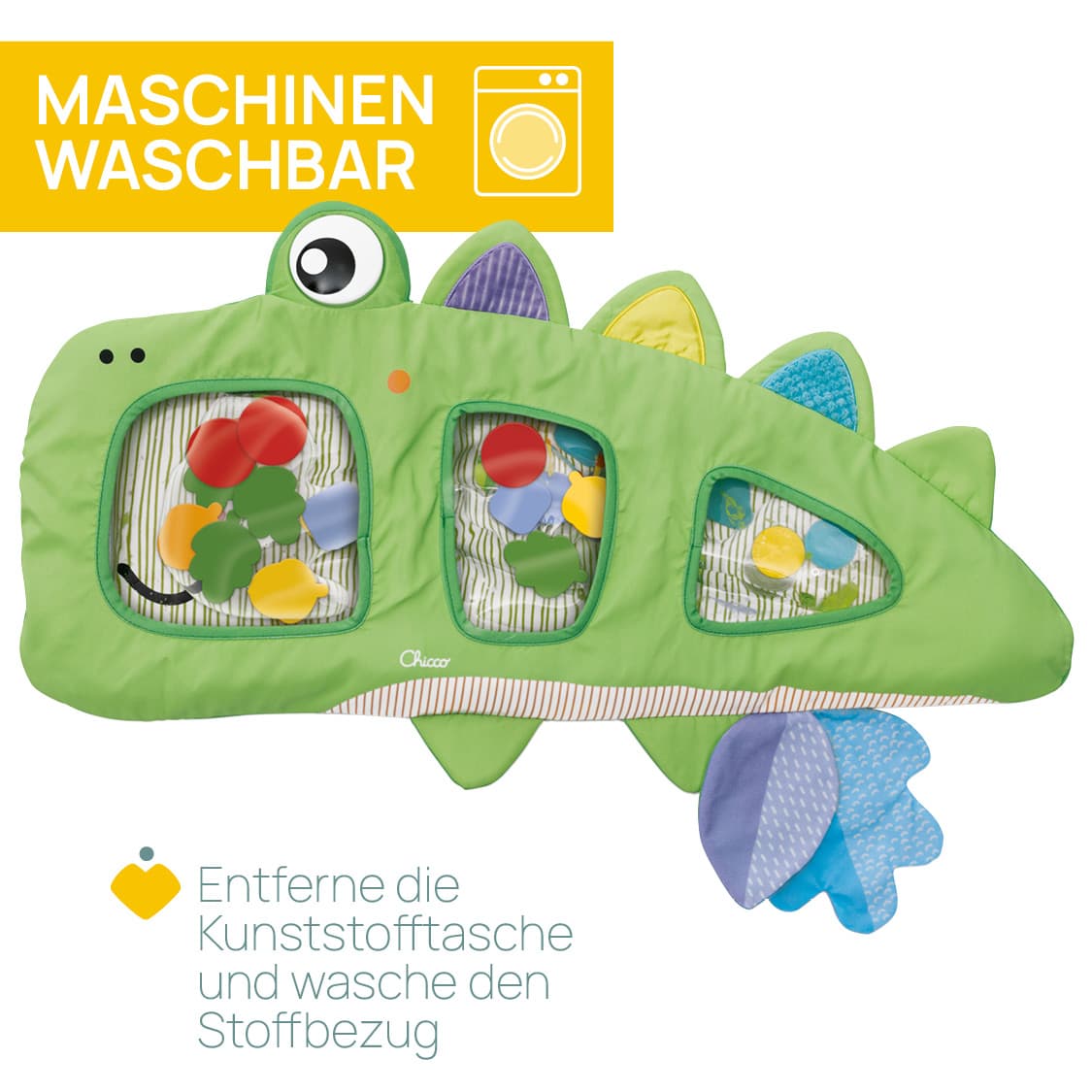 Das Krokodil von Chicco ist ein evolutives Spielzeug, das dank seines mit Wasser gefüllten und mit Luft aufgeblasenen Körpers und der verschiedenen Stoffe viele taktile Reize bietet.• 65x35 cm Krokodilkissen.• Reich an taktilen Reizen dank des mit Wasser zu füllenden und mit Luft aufzublasenden Körpers, der verschiedenen Stoffe und des Knister-Effekts in den Blättern.• Es enthält 18 Elemente, die in 3 Kategorien eingeteilt werden können, um logische Fähigkeiten zu entwickeln: Formen, Farben und Naturelemente.• Reich an manuellen Aktivitäten wie dem rotierenden Auge und den Überraschungseffekt-Blättern.
