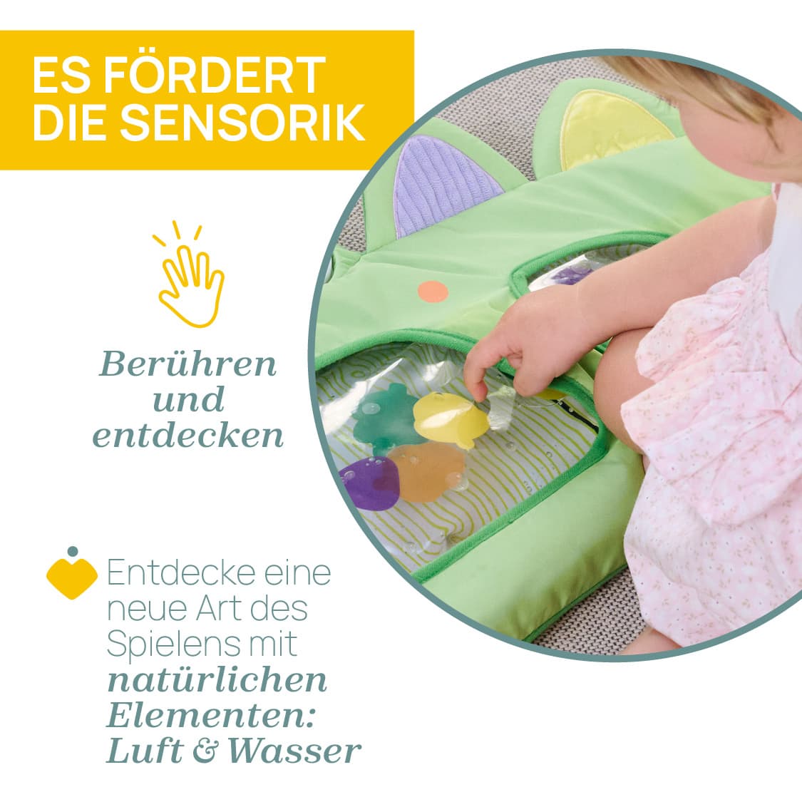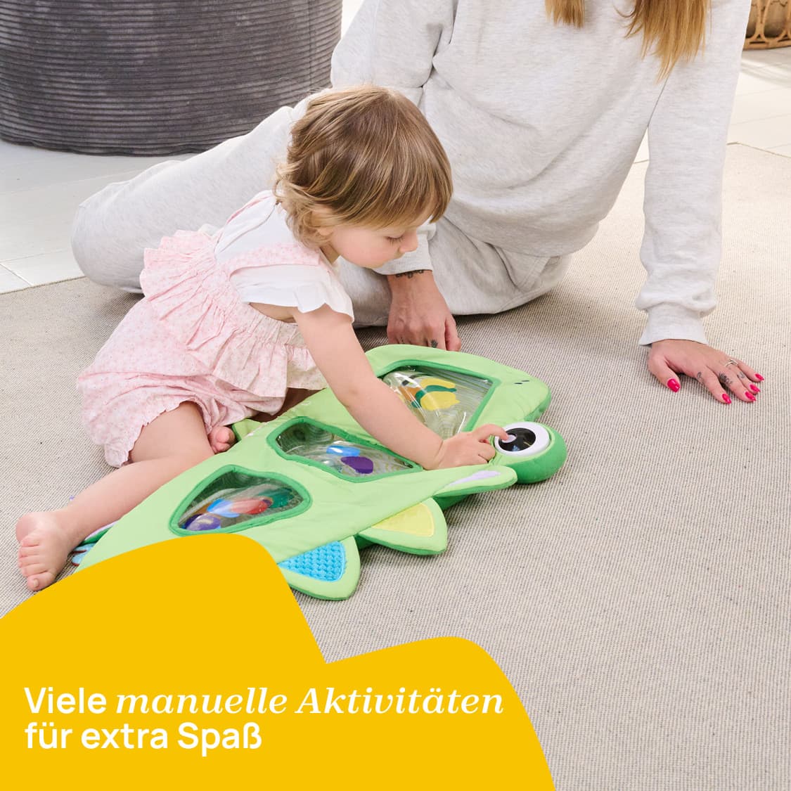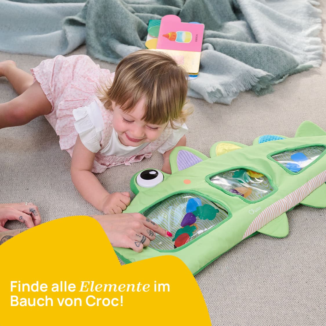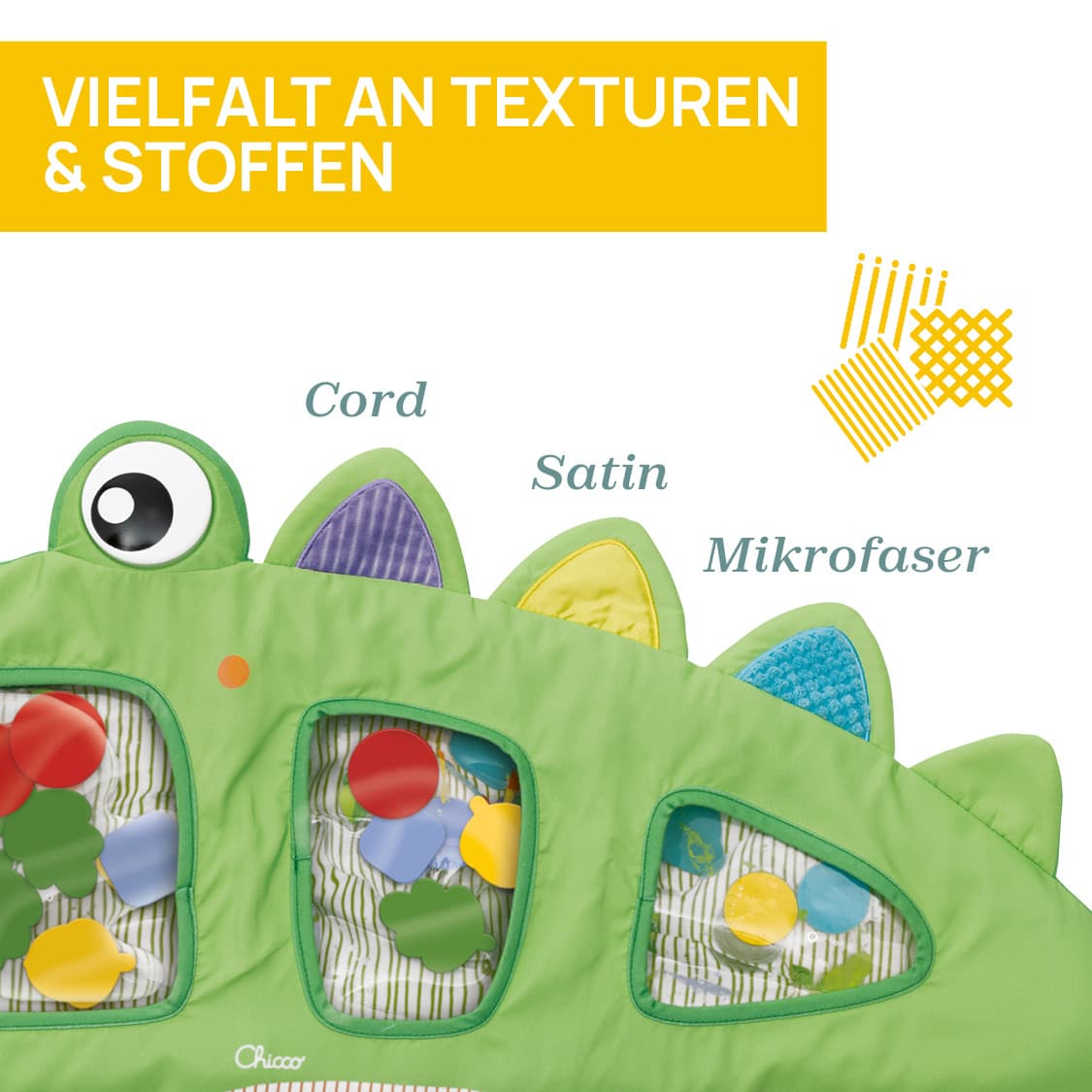 Das Krokodil von Chicco ist ein evolutives Spielzeug, das dank seines mit Wasser gefüllten und mit Luft aufgeblasenen Körpers und der verschiedenen Stoffe viele taktile Reize bietet.• 65x35 cm Krokodilkissen.• Reich an taktilen Reizen dank des mit Wasser zu füllenden und mit Luft aufzublasenden Körpers, der verschiedenen Stoffe und des Knister-Effekts in den Blättern.• Es enthält 18 Elemente, die in 3 Kategorien eingeteilt werden können, um logische Fähigkeiten zu entwickeln: Formen, Farben und Naturelemente.• Reich an manuellen Aktivitäten wie dem rotierenden Auge und den Überraschungseffekt-Blättern.
