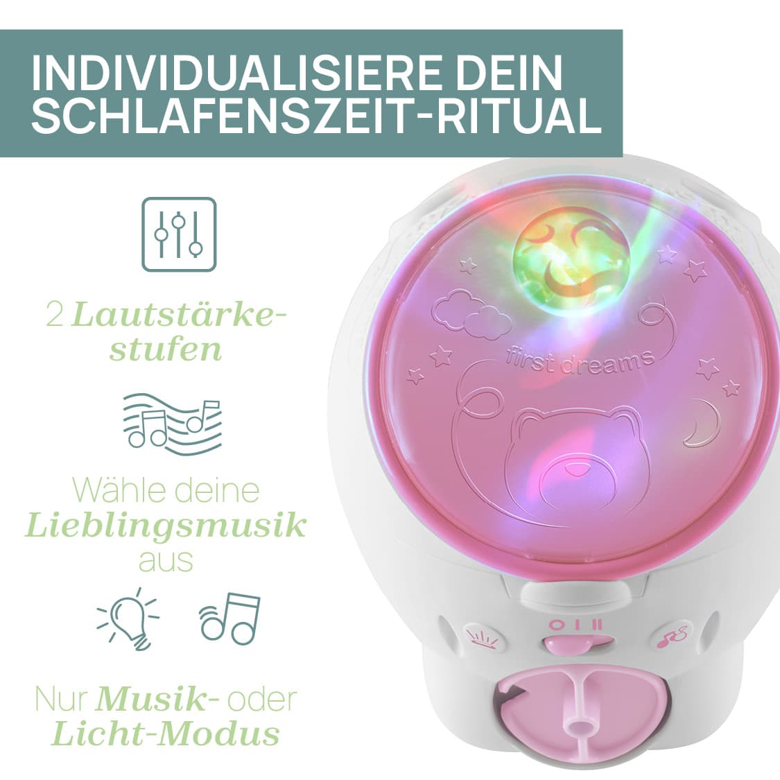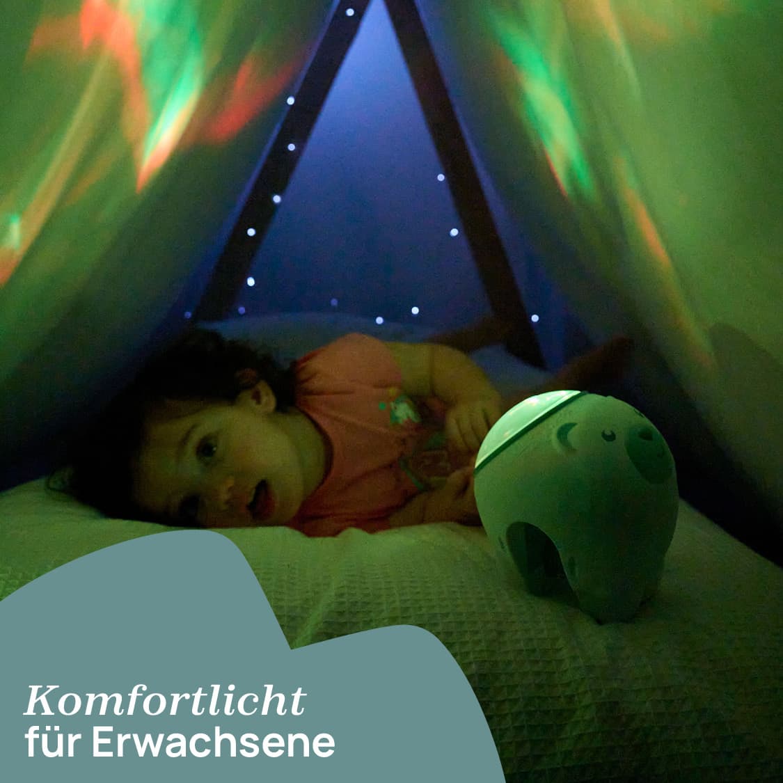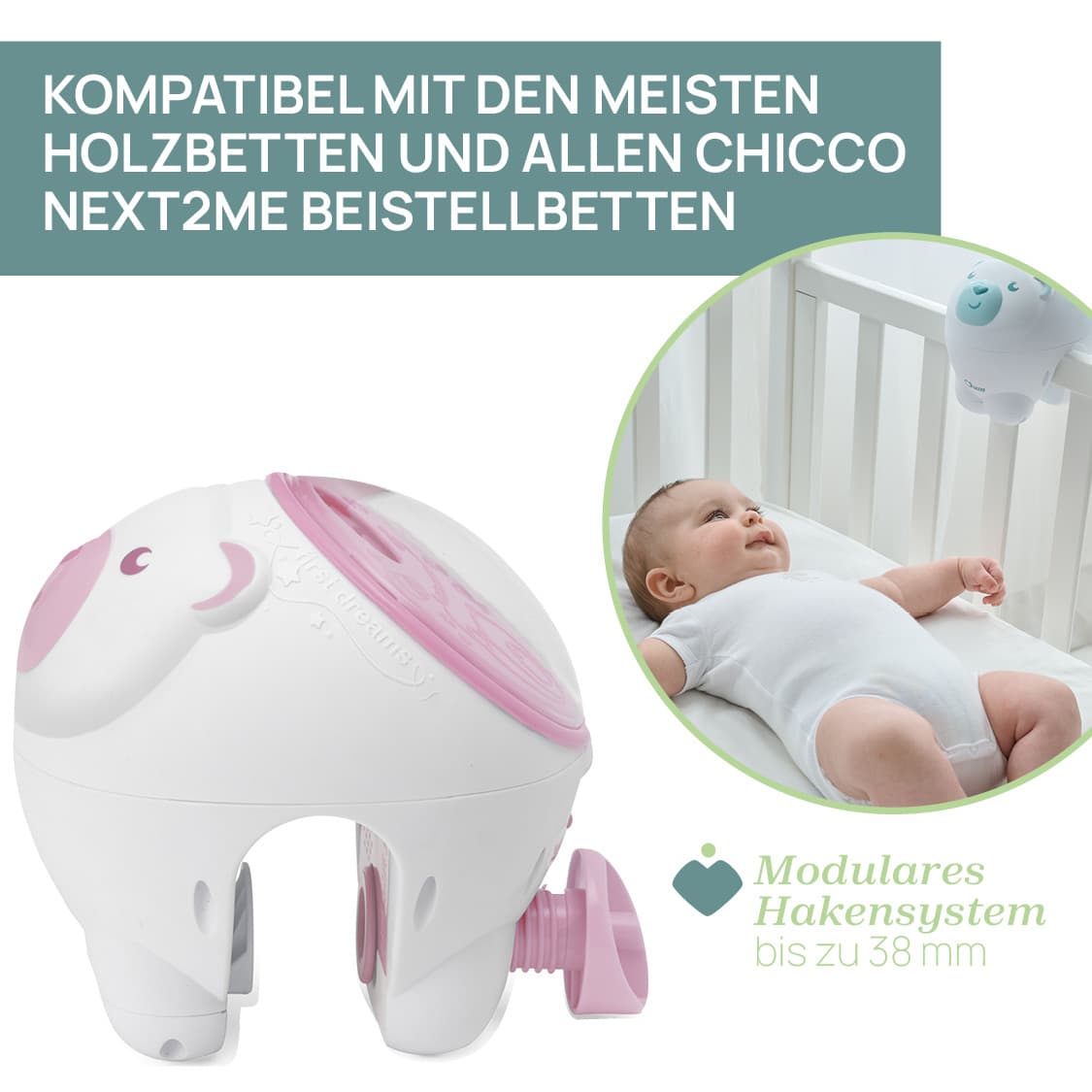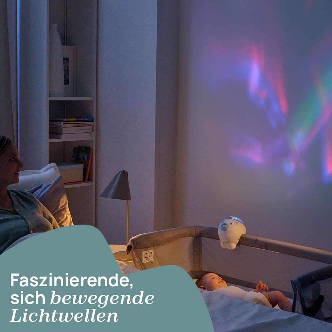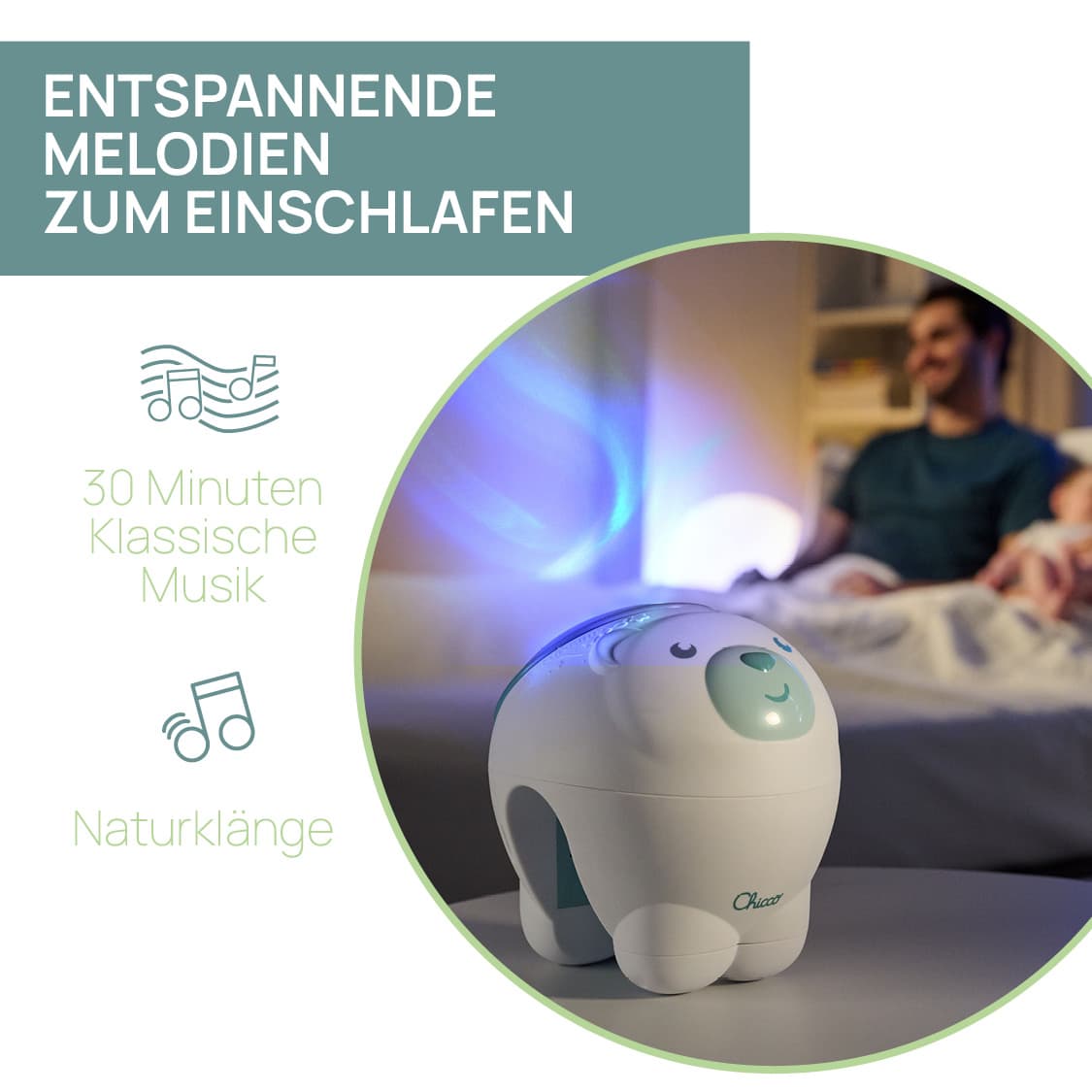 2in1 Kinderbett- und Nachttisch-Projektor mit 30 Minuten magischer Nordlichtprojektion und klassischer Musik. Perfekt für die persönliche Gestaltung des Schlafrituals des Babys.• 2in1 Projektor: 1. Kinderbett-Projektor, 2. Nachttisch-Projektor.• Eine magische und dynamische Nordlichtprojektion, um eine wunderbare Atmosphäre für die Ruhe des Babys zu schaffen.• 30 Minuten klassische Musik (Mozart, Bach, Glinka) und Naturgeräusche.• Anpassbare Funktionen mit zwei Tasten, eine zur Auswahl der Melodien und eine zur Aktivierung und Deaktivierung der Projektion.• Mit 2 Lautstärkestufen.• Modulares Hakensystem, geeignet für alle Chicco Next2me Kinderbetten und Betten mit Rohrteilen bis zu 38 mm.