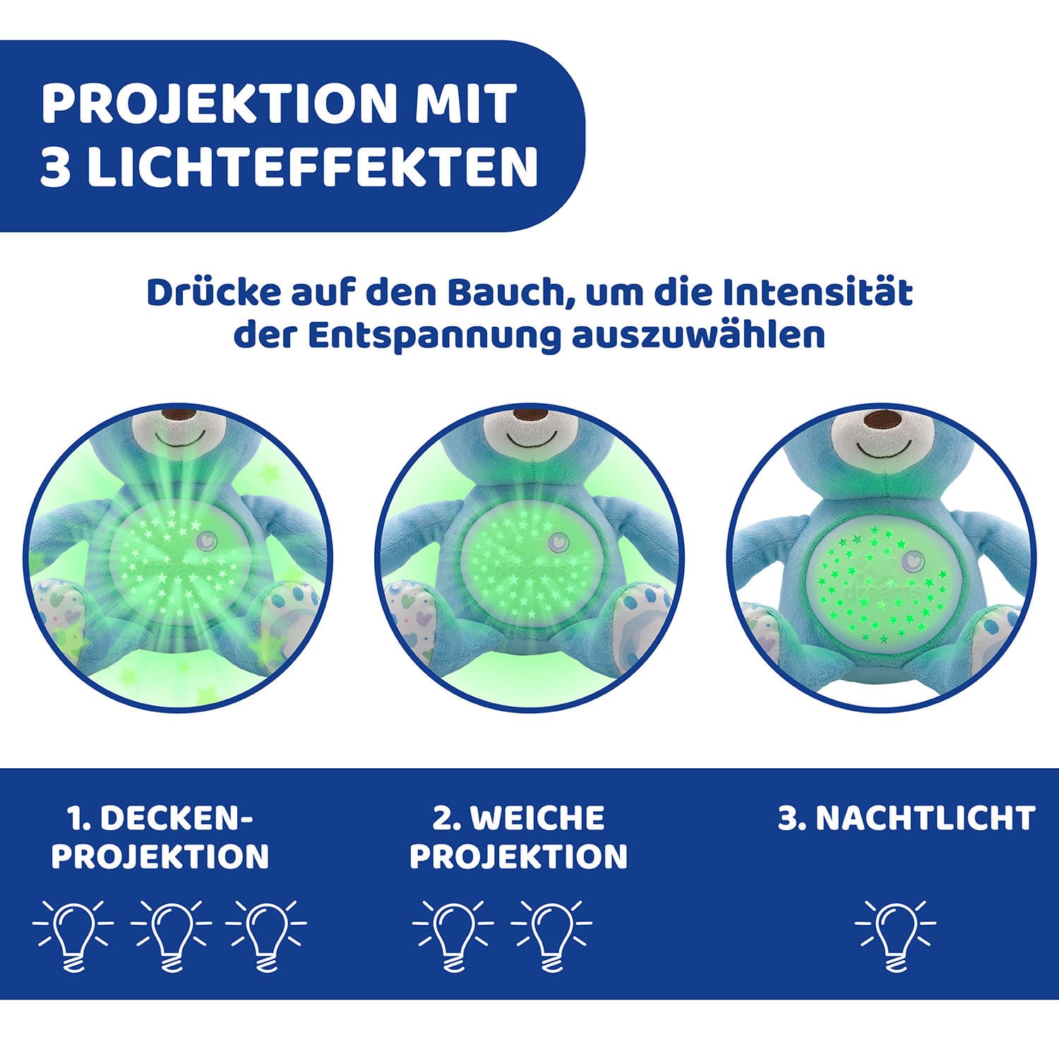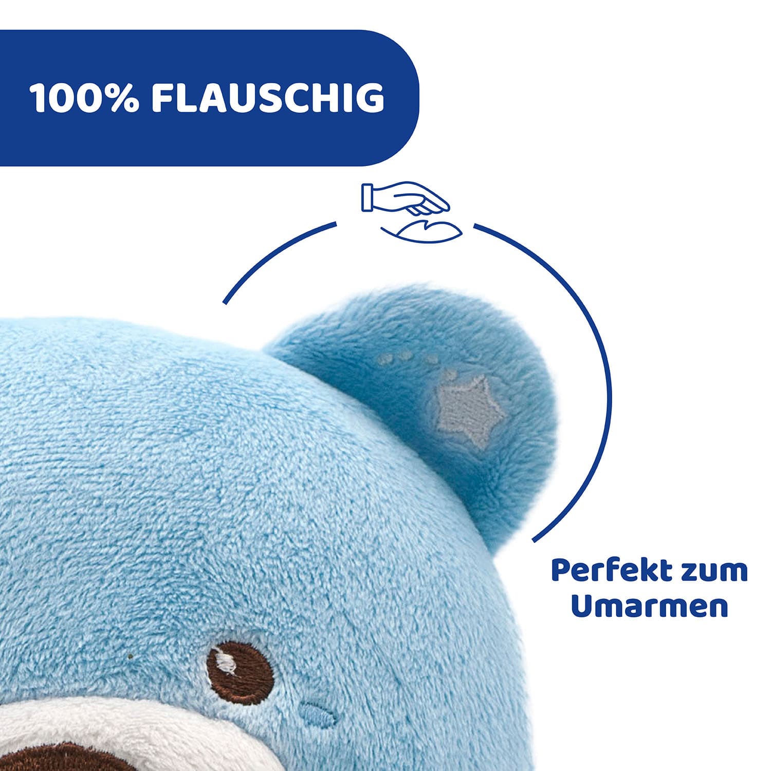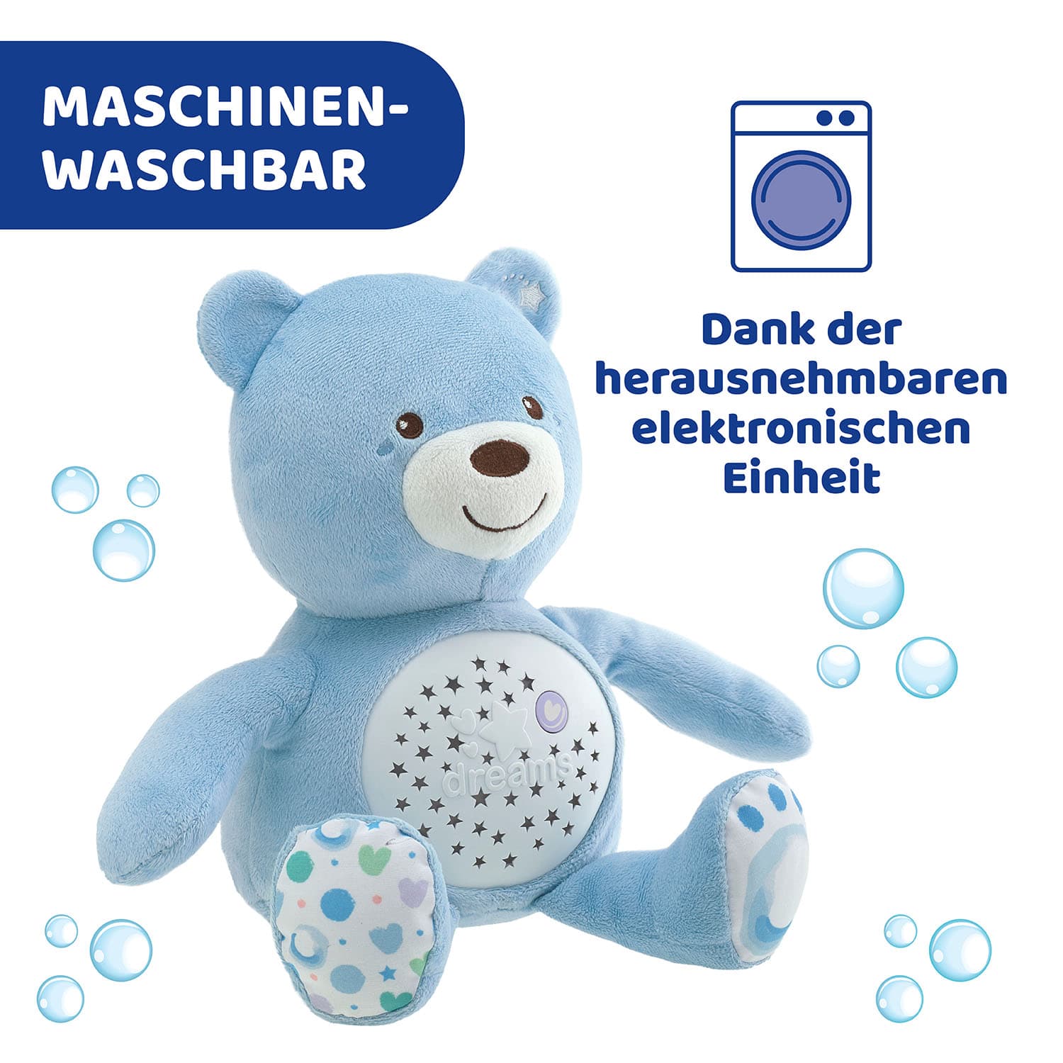 Für die perfekte Einschlafatmosphäre sorgt der neue First Dreams Baby Bär aus kuschelweichem Plüsch von Geburt an. Mit verschiedenen Lichtprojektionen mit Sternenmotiven und unterschiedlichen entspannenden Melodien ausgestattet, wird er schnell zum liebsten Kuschelfreund und Einschlafbegleiter der kleinen Familienmitglieder. Ob automatischer Farbwechsel, ein Projektionslicht für die Decke, ein sanftes Relaxlicht oder ein beruhigendes Nachtlicht - Mama und Papa können die Intensität der Lichteffekte aus dem weichen Plastikeinsatz am Bauch des Bären je nach Bedürfnis der Kleinen individuell einstellen und das Bettchen so in eine magische Sternenlandschaft verwandeln. Mit einer Spielzeit von ca. 30 Minuten begleiten zudem klassische Musik von Bach und Beethoven, Jazz, Soft Rock,Modern, New Age oder Naturklänge die Kleinsten beim sanften Einschlummern. Mithilfe des lilafarbenen Knopfs auf dem Bauch desBären können Eltern dabei ganz leicht die Lieblingsmelodie des kleinen Zöglings einstellen. Und wird im Bettchen mal das Fläschchen verschüttet, kann der Bär ganz leicht in der Maschine gewaschen werden.