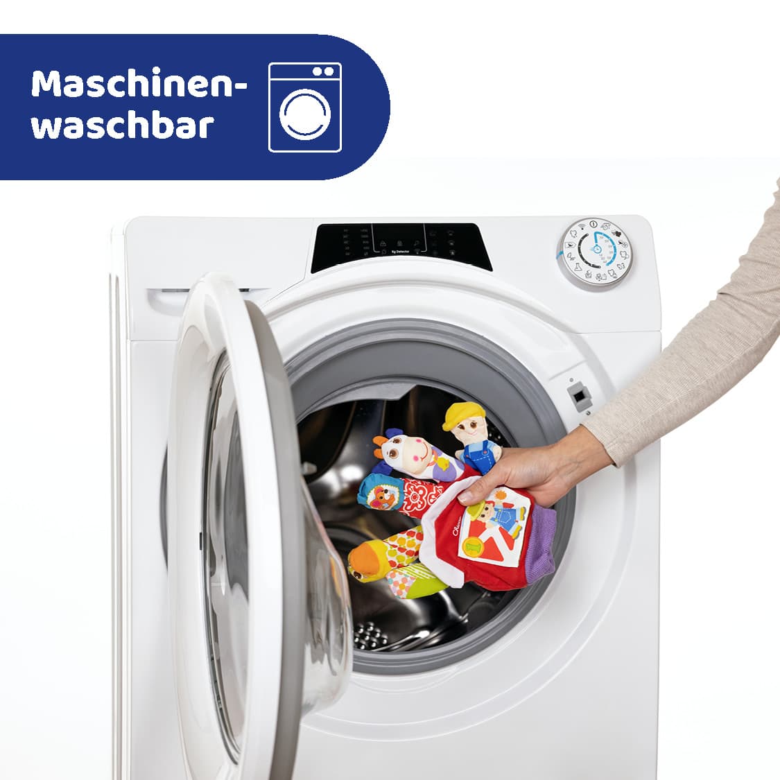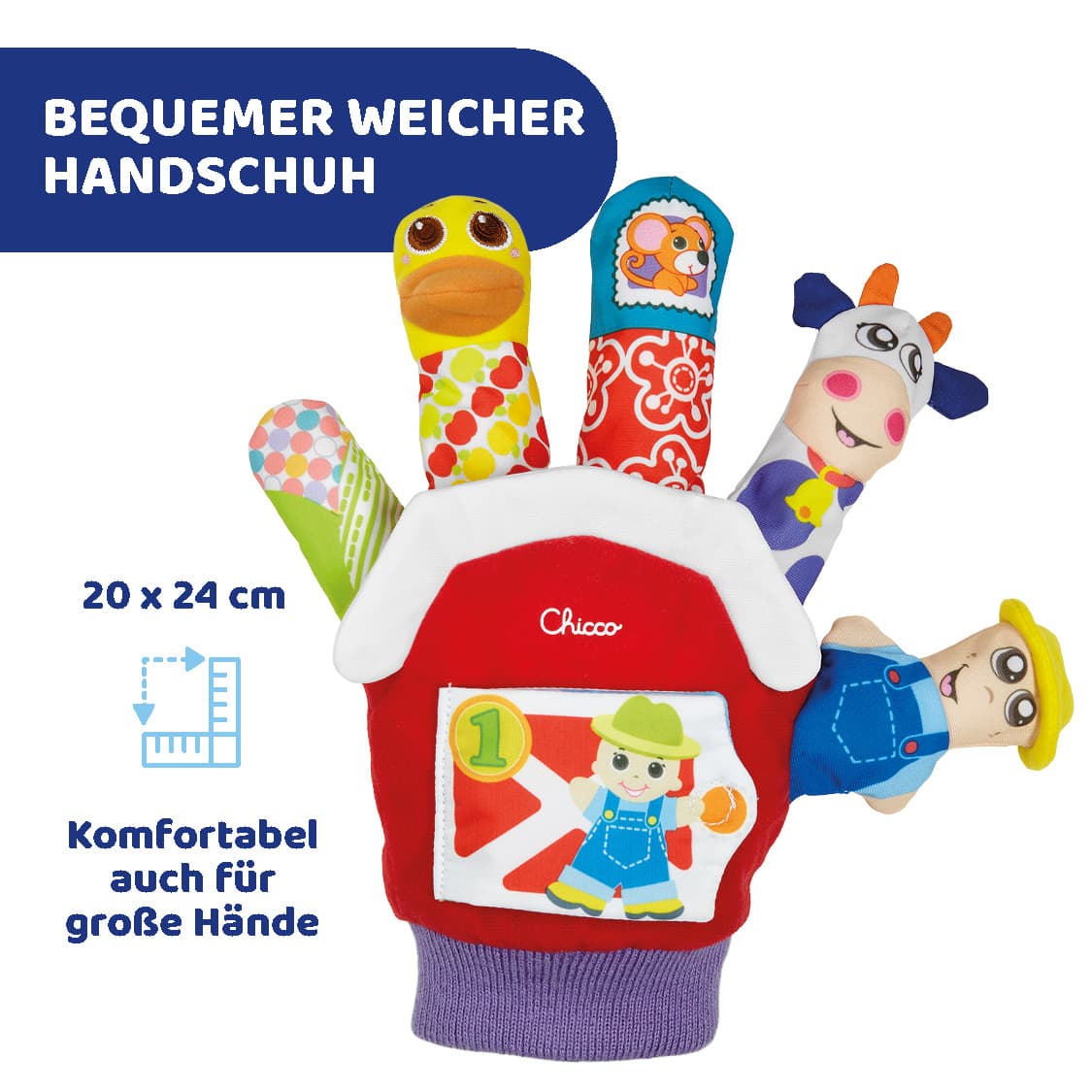 Ziehen Sie den Spielhandschuh an und entdecken Sie den Spielspaß mit Ihrem Kind. Es wird es lieben, die Farm mit Ihren Fingern zum Leben zu erwecken und den Geschichten zu lauschen. Mit Elementen, die knistern, quietschen und rasseln. Mit dem knisternden Buch können Sie gemeinsam die Tiere zählen. Maschinenwaschbar.