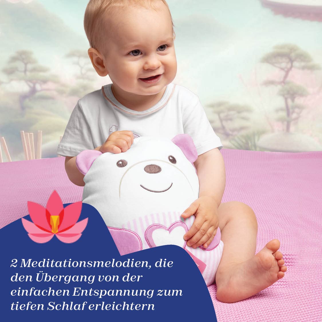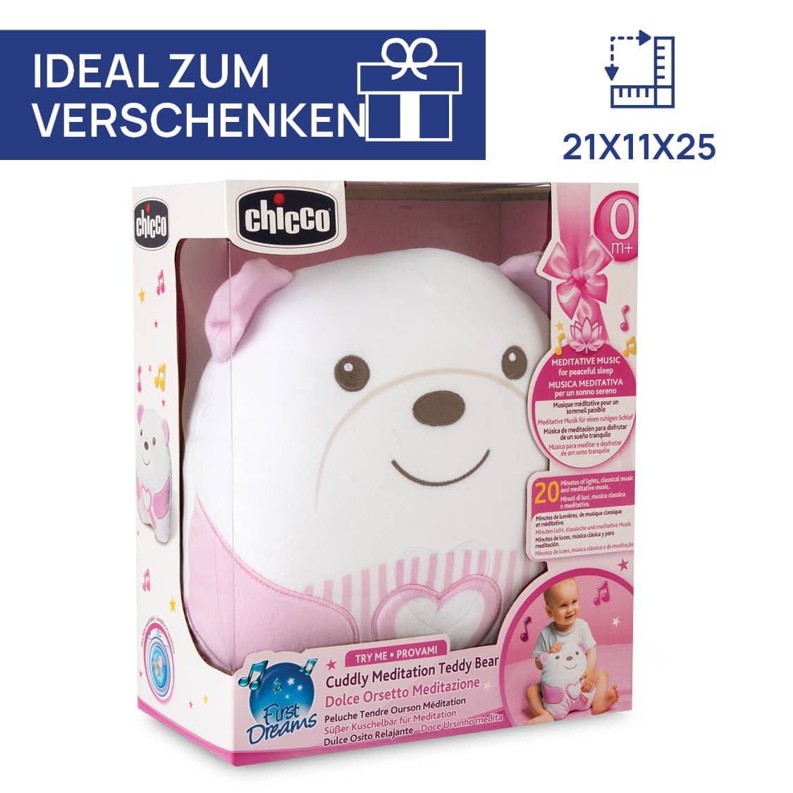 Süßer Kuschelbär: Sanfter Begleiter für entspannte Momente • Beruhigende Melodien: Der Kuschelbär spielt klassische Musik und Meditationsmelodien, die das Baby sanft beruhigen. Ein weiches, weißes Nachtlicht schafft eine entspannte Atmosphäre. • Sanftes Design: Kuscheliger Bär aus weichem Velours mit besonders softer Füllung. Seine kissenartige Form lädt Babys zum Kuscheln und Drücken ein. • Einfache Bedienung: Durch Drücken des herzförmigen Knopfes am Bauch startet ein 20-Minuten-Zyklus entspannender Melodien. Wähle eine Lieblingsmelodie, um das Baby sanft zu begleiten und eine tiefe Entspannung zu fördern. • Pflegeleicht: Der Kuschelbär ist maschinenwaschbar, nachdem das elektronische Modul entnommen wurde.