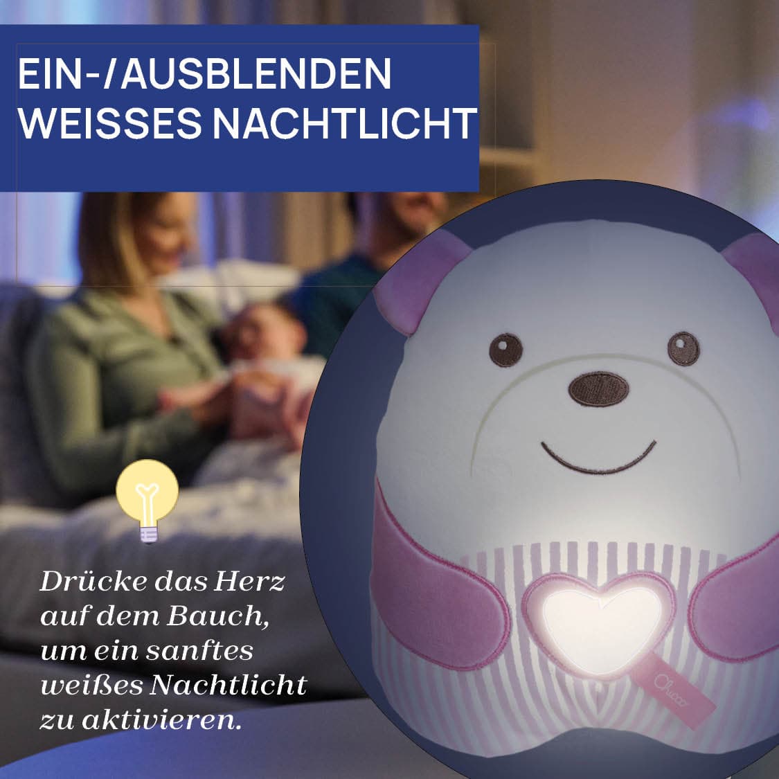 BITTE DIESE GEBRAUCHSANLEITUNG SORGFÄLTIG LESEN UND FÜR SPÄTERE RÜCKFRAGEN AUFBEWAHREN. ACHTUNG! • Vor dem Gebrauch eventuelle Kunststoffbeutel und andere Bestandteile (z. B. Bänder, Befestigungselemente, usw.), die nicht Teil des Spielzeugs sind, entfernen und für Kinder unzugänglich aufbewahren. Erstickungsgefahr. • Prüfen Sie regelmäßig den Abnutzungszustand des Produkts und ob es beschädigt ist. Sollten Beschädigungen vorliegen, das Spielzeug nicht mehr verwenden und von Kindern fernhalten. • Das Spielzeug darf nur auf die empfohlene Weise verwendet werden. • Das Spielzeug nur unter Aufsicht eines Erwachsenen verwenden. • Das Spielzeug nie im Kinderbettchen lassen. • Das Spielzeug wurde entwickelt, um das Kind in den Schlaf zu begleiten. Das Spielzeug aus dem Kinderbett entfernen, wenn das Kind schläft.