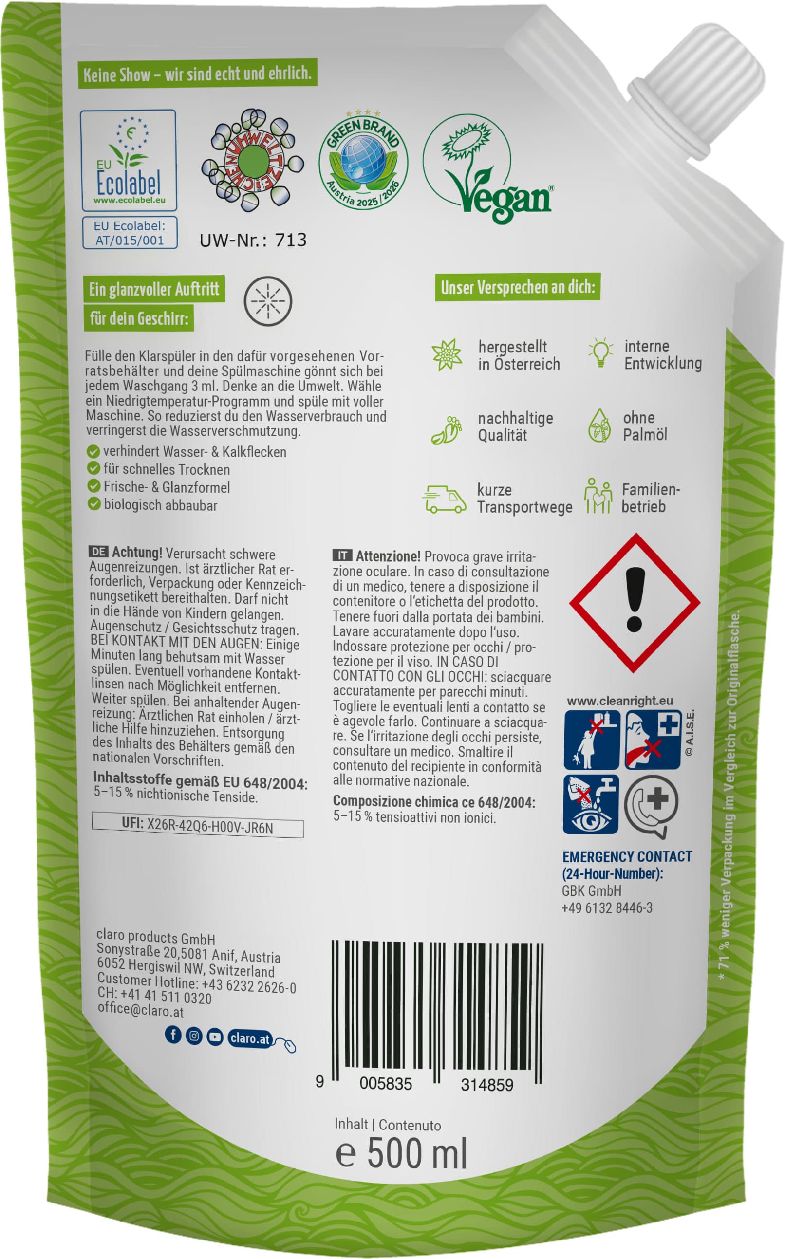 | Anwendungshinweis | Fülle den Klarspüler in den dafür vorgesehenen Vorratsbehälter und deine Spülmaschine gönnt sich bei jedem Waschgang 3ml. |