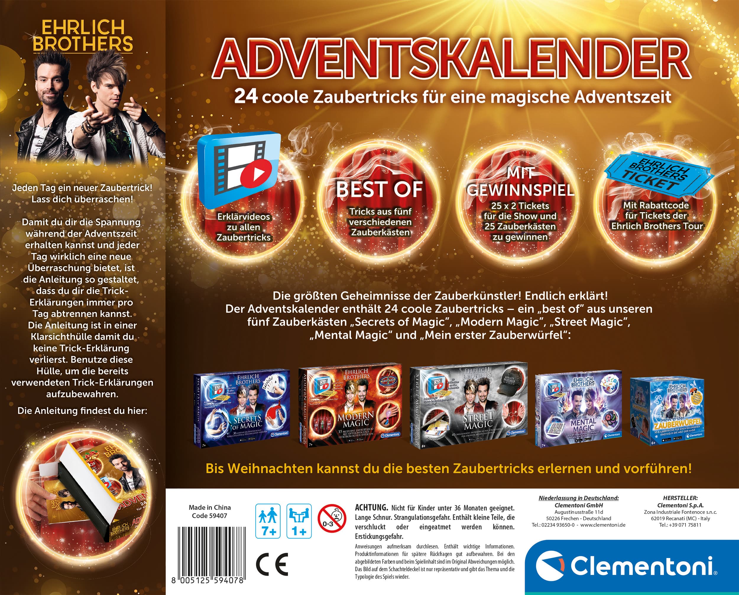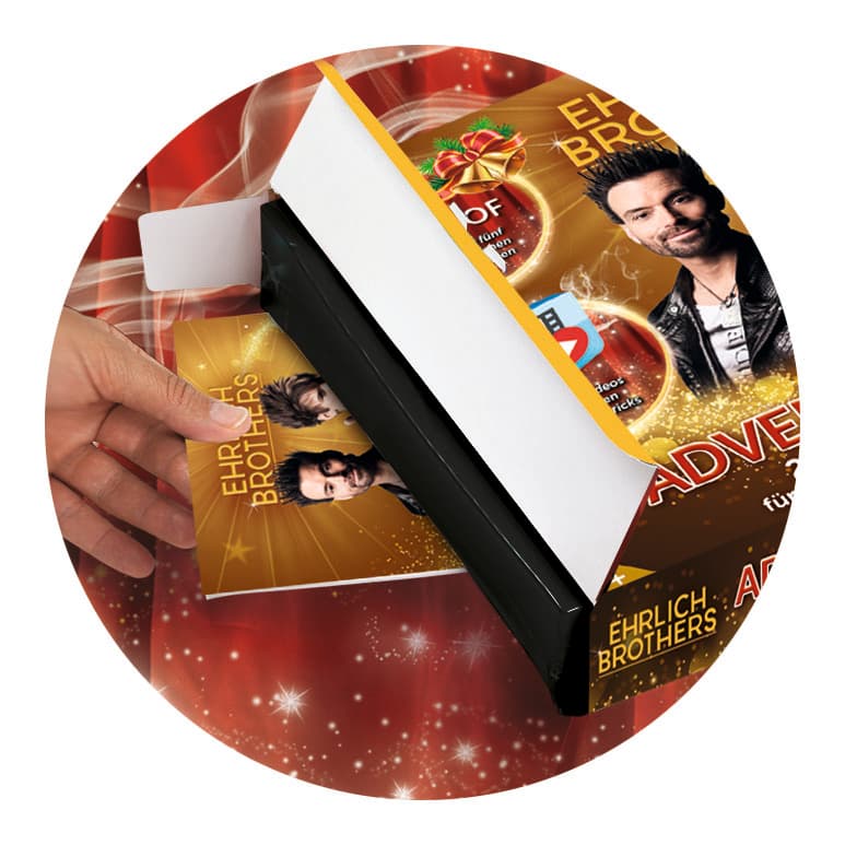 Der Adventskalender mit 24 coolen Zaubertricks für eine magische Adventszeit enthält die besten Tricks aus den drei Zauberkästen „Secrets of Magic”, „Modern Magic” und „Street Magic”.