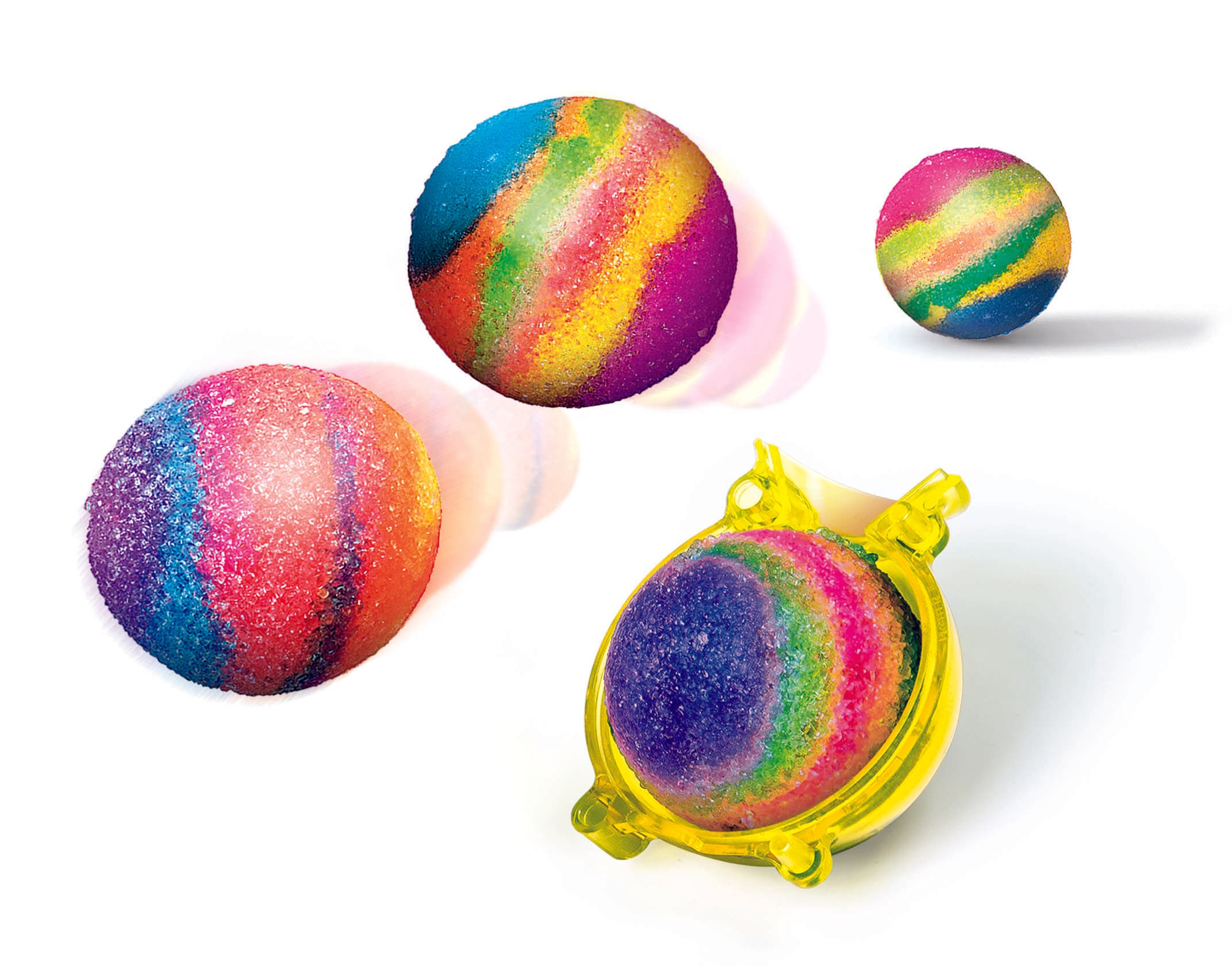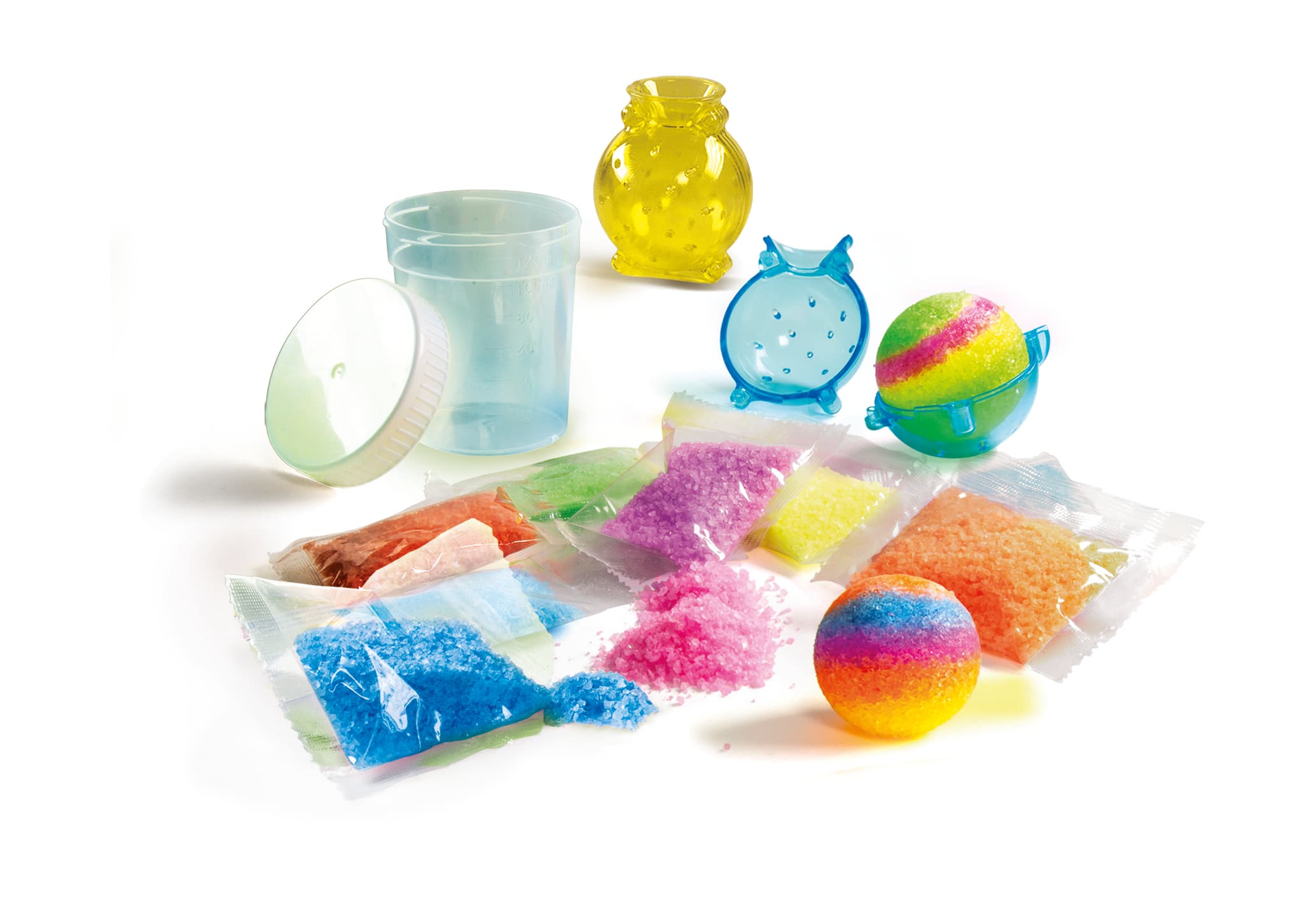 Ein fantastisches Set, um echte Spring-Bälle herzustellen, die knallbunt und höchst unterhaltsam sind. Das Set enthält kugelförmige Formen und viele Beutelchen mit farbigem Puder, der mit Wasser vermischt wird, und mit dem man wirklich"magische"Bälle herstellen kann.Der Prozess ist einfach und schnell: tauche einfach die Form in Wasser und lasse sie für einige Minuten stehen... schon ist das Experiment fertig! Einfach, unterhaltsam und schnell zum Spielen fertig.Beinhaltet eine umfangreiche illustrierte Anleitung, die den Vorbereitungsprozess kurz und einfach erklärt.