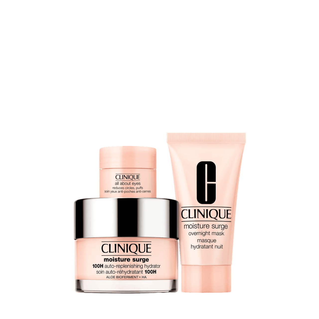 AnwendungshinweisMoisture Surge™ 100-Stunden-Selbstauffüllende Feuchtigkeitscreme 50 ml • Morgens und abends auf die gereinigte Haut auftragen oder als strahlenden Highlighter über dem Make-up verwenden. • Kann auch als 5-Minuten-Maske verwendet werden. Moisture Surge™ Nachtmaske 30 ml • Einmal täglich abends anwenden. • Nach der 3-Schritte-Pflege oder immer dann anwenden, wenn die Haut einen Feuchtigkeitskick benötigt. • Auf Gesicht und Hals auftragen, oder nach Bedarf. Augenpartie aussparen. All About Eyes™ 5 ml • Diese Augencreme für Tag und Nacht zweimal täglich, morgens und abends, anwenden. • Mit dem Ringfinger sparsam und sanft einklopfend auf die gesamte Augenpartie auftragen.