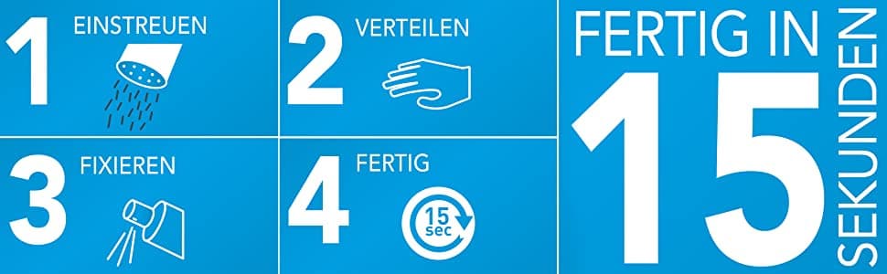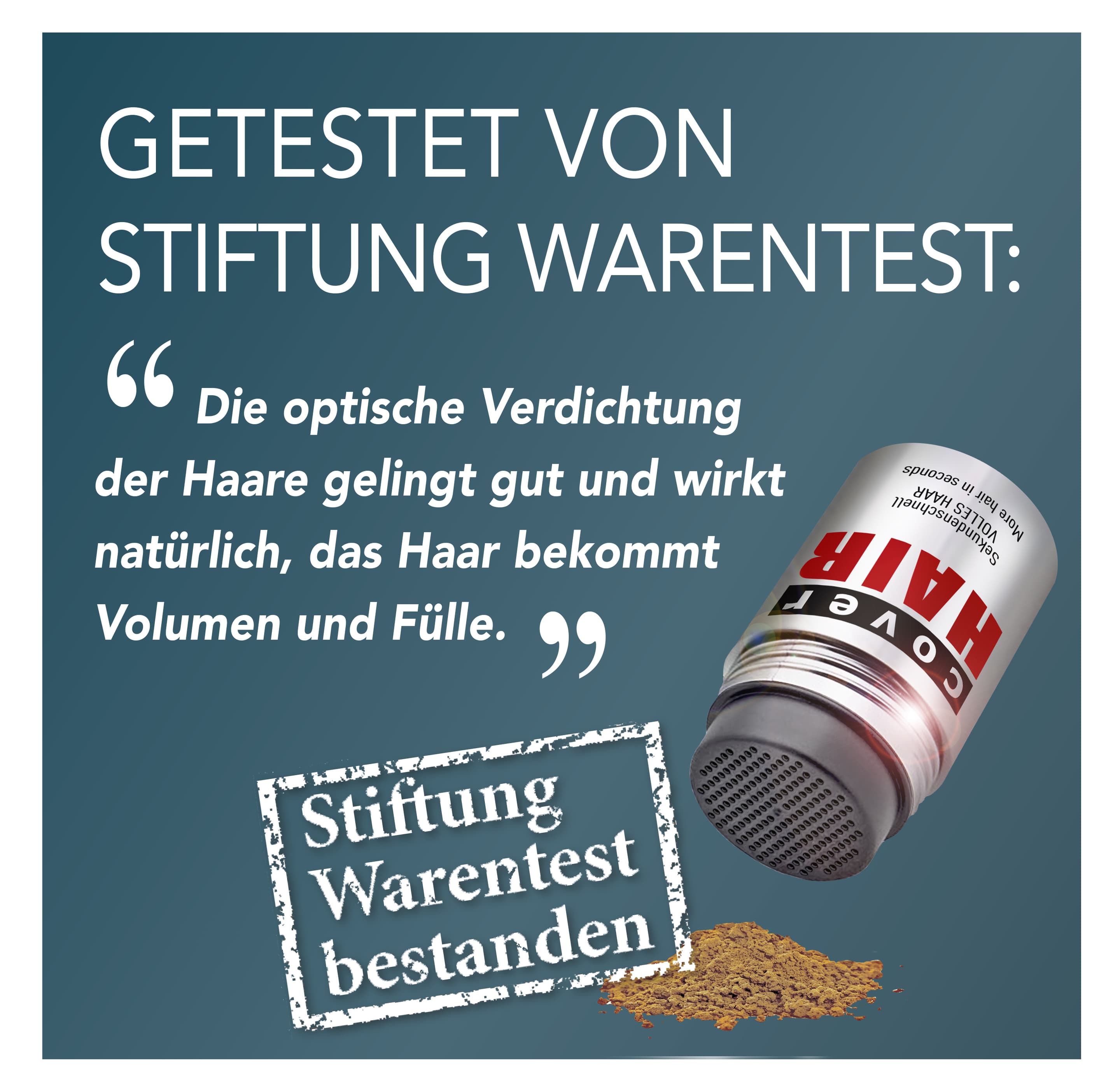 Mit dem Cover Hair Streuhaar erhalten Sie sekundenschnell volles und farbiges Haar. Damit geben Sie kahlen Stellen mehr Fülle und Dichte und können Ihren Haaransatz rasch nachfärben und kaschieren. Für perfekte Stylings, Fülle und Farbe im Haar. Es unterstützt Sie gegen erste graue Haare, schüttere Stellen, beginnende Glatze oder nachwachsenden, uncolorierten Haaransatz. Es ist einfach anzuwenden: Einstreuen, Stylen, fixieren– Sie erhalten volles Haar in 15 Sekunden. Entfernt wird Cover Hair ganz einfach beim Haarewaschen. Feuchtigkeit, schwitzen und leichter Regen können der Haftwirkung hingegen nichts anhaben. Cover Hair ist nach dem Fixieren mit starkem Haarspray Wind und Wetterfest, hält auch beim Schwitzen und Sport.