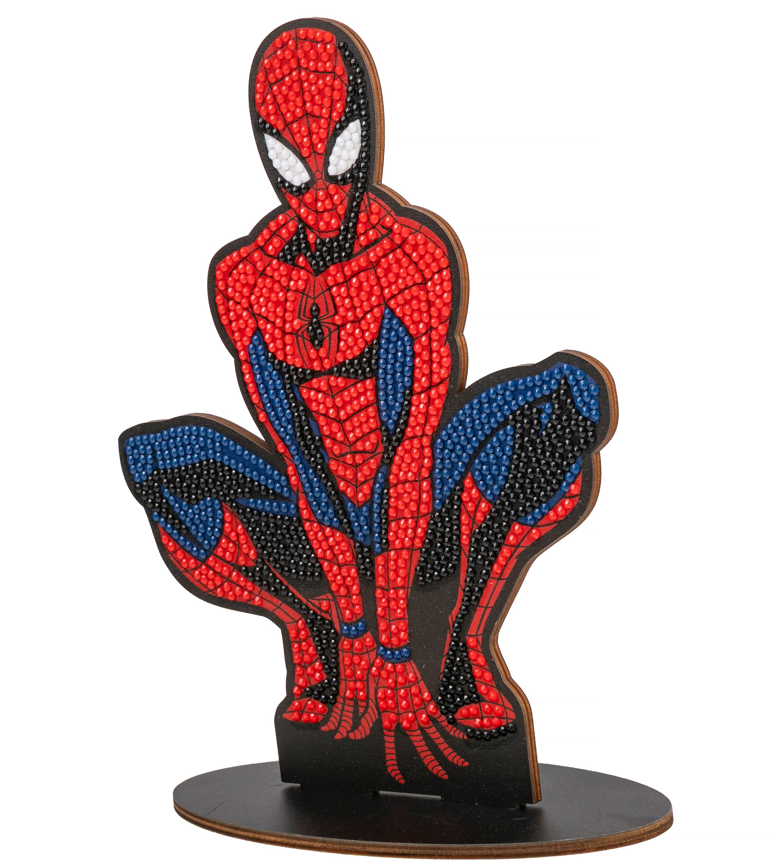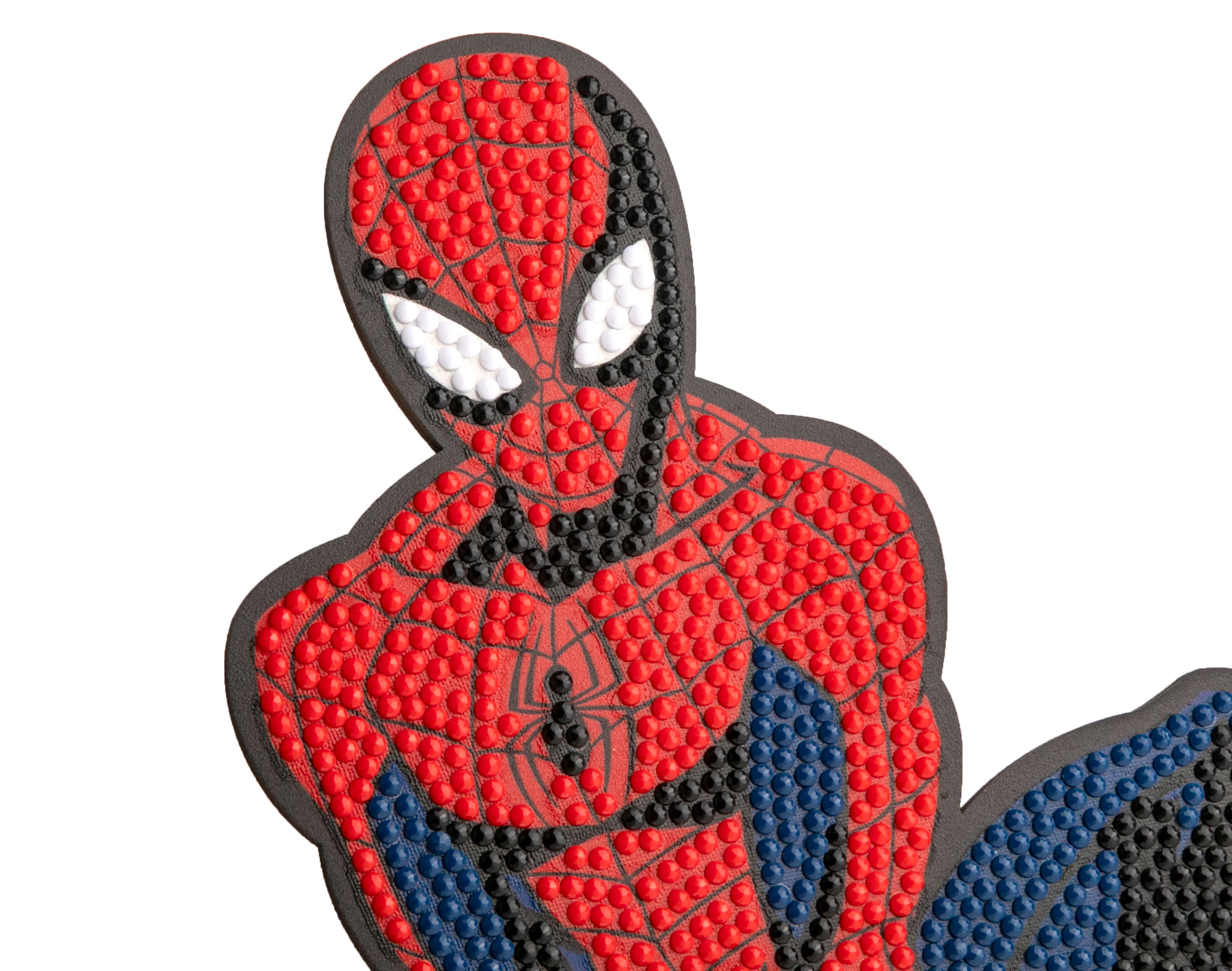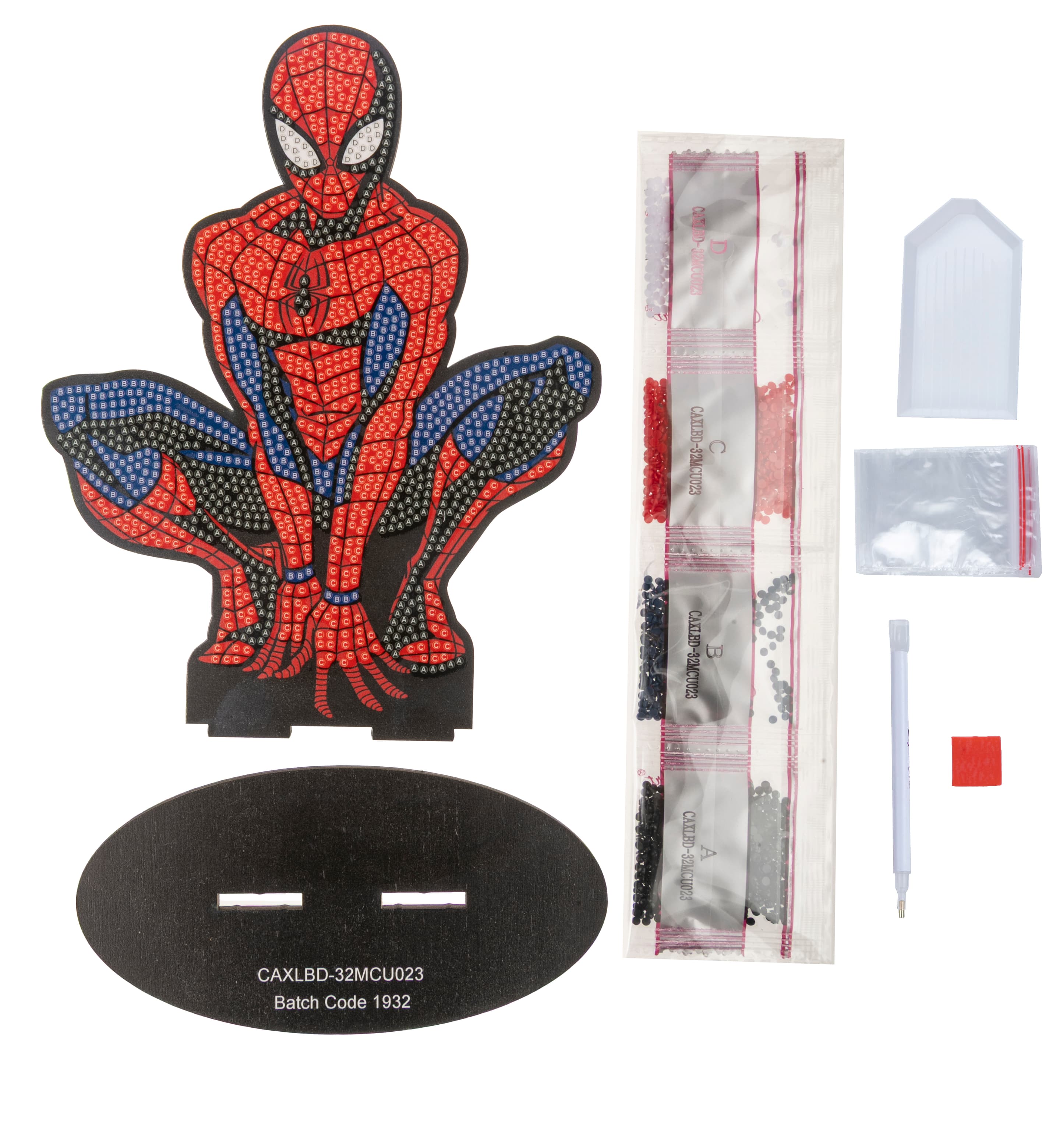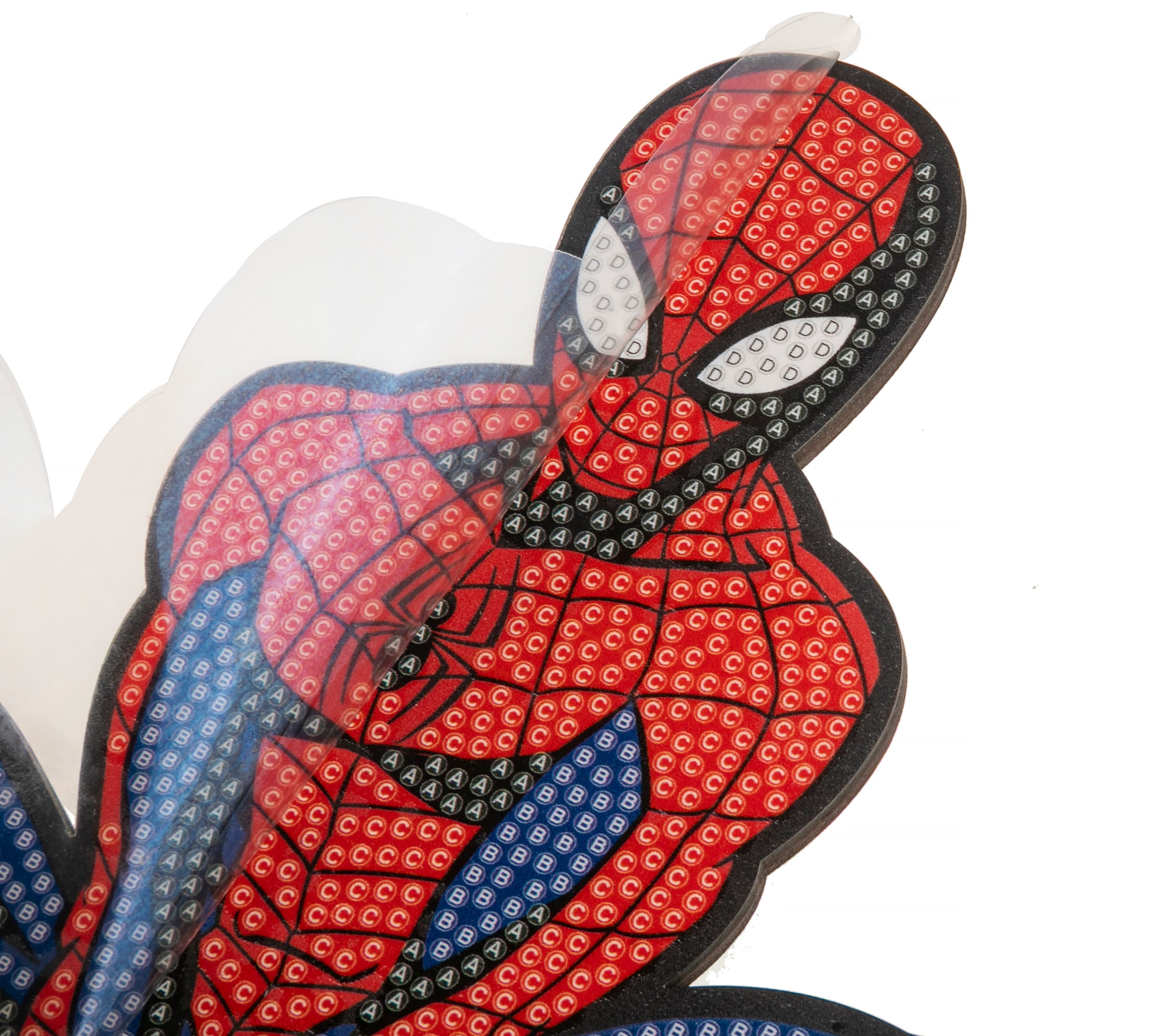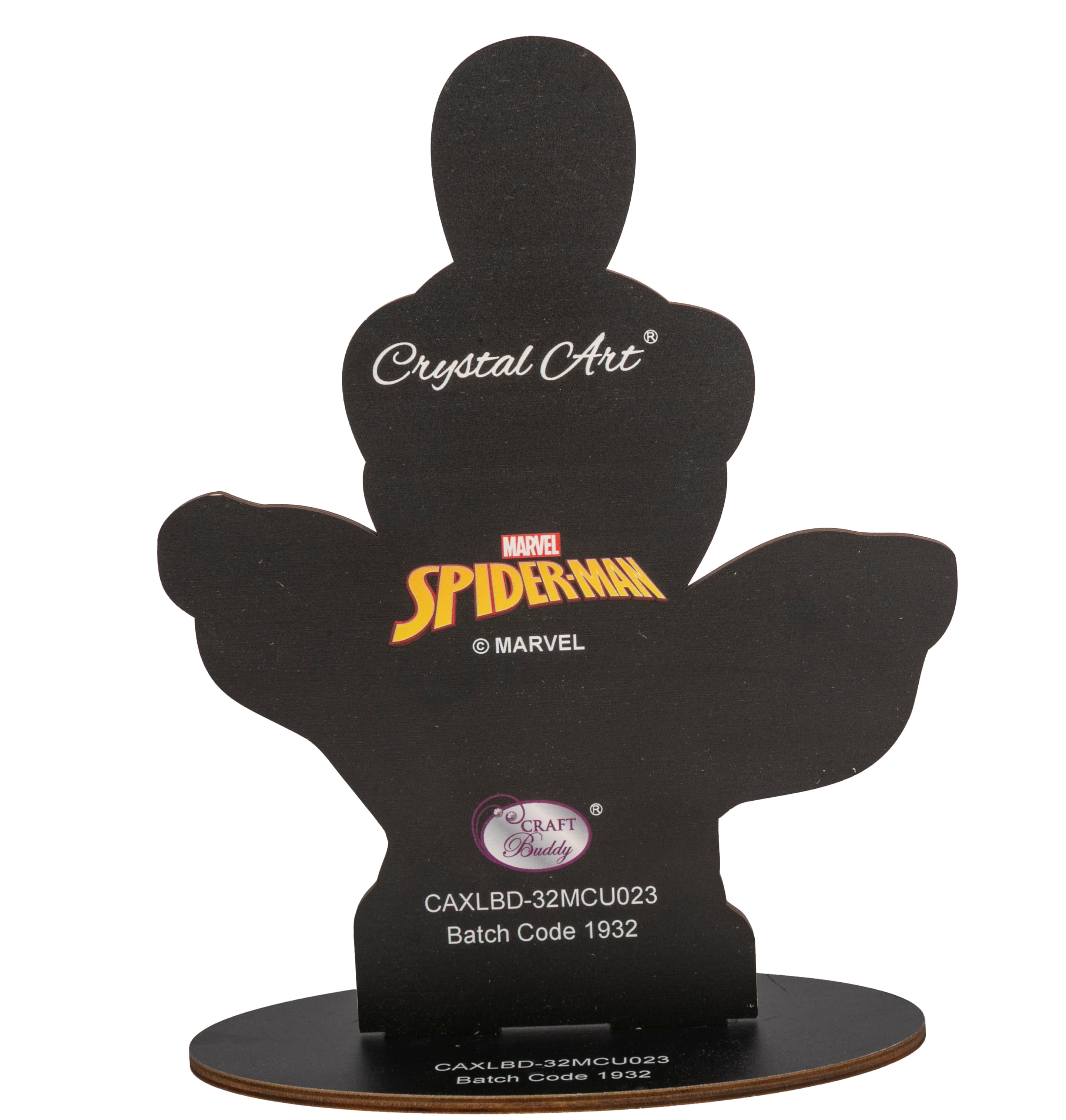 Gestalte einee funkelnde XL SPIDERMAN-Figur nach einem vorgegebenen, Design auf einer Holzvorlage Alle Kretaivstes enthalten: 1 selbstklebende Holzvorlage, vorsortierte Beutel mit farbigen Kristallen, Stift zum Aufnehmen der Kristalle, Schale, Gelwachs, Bastelanleitung