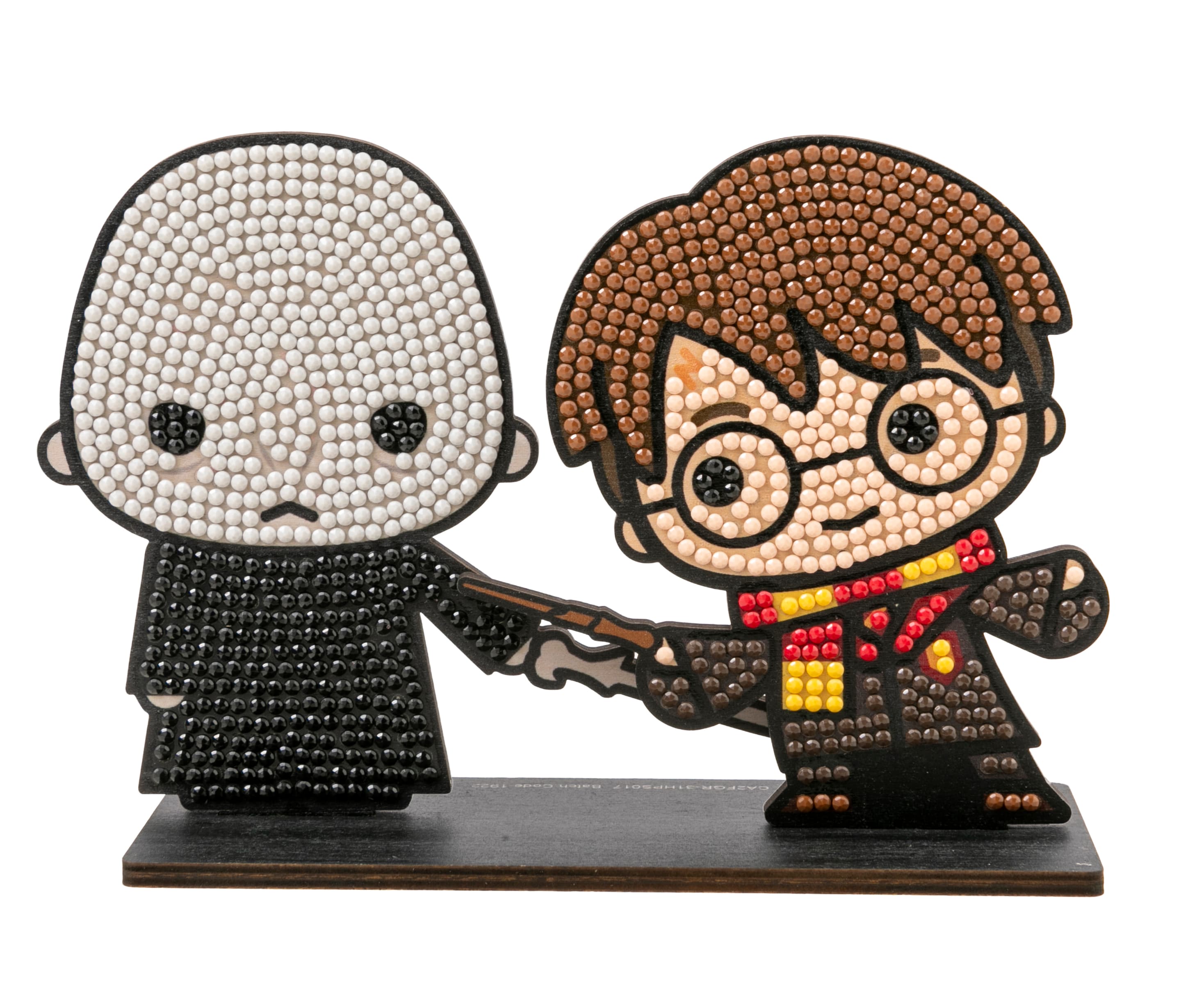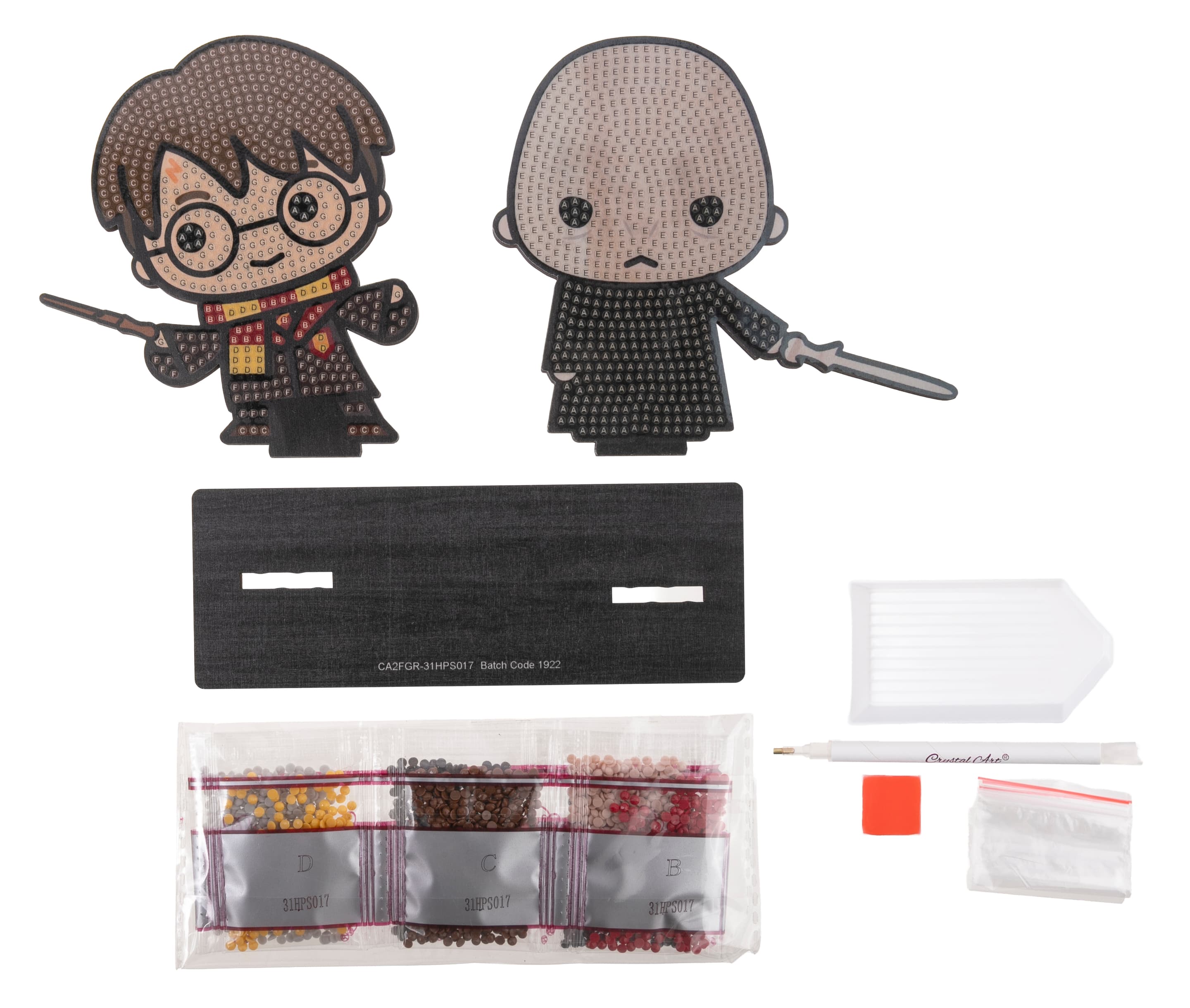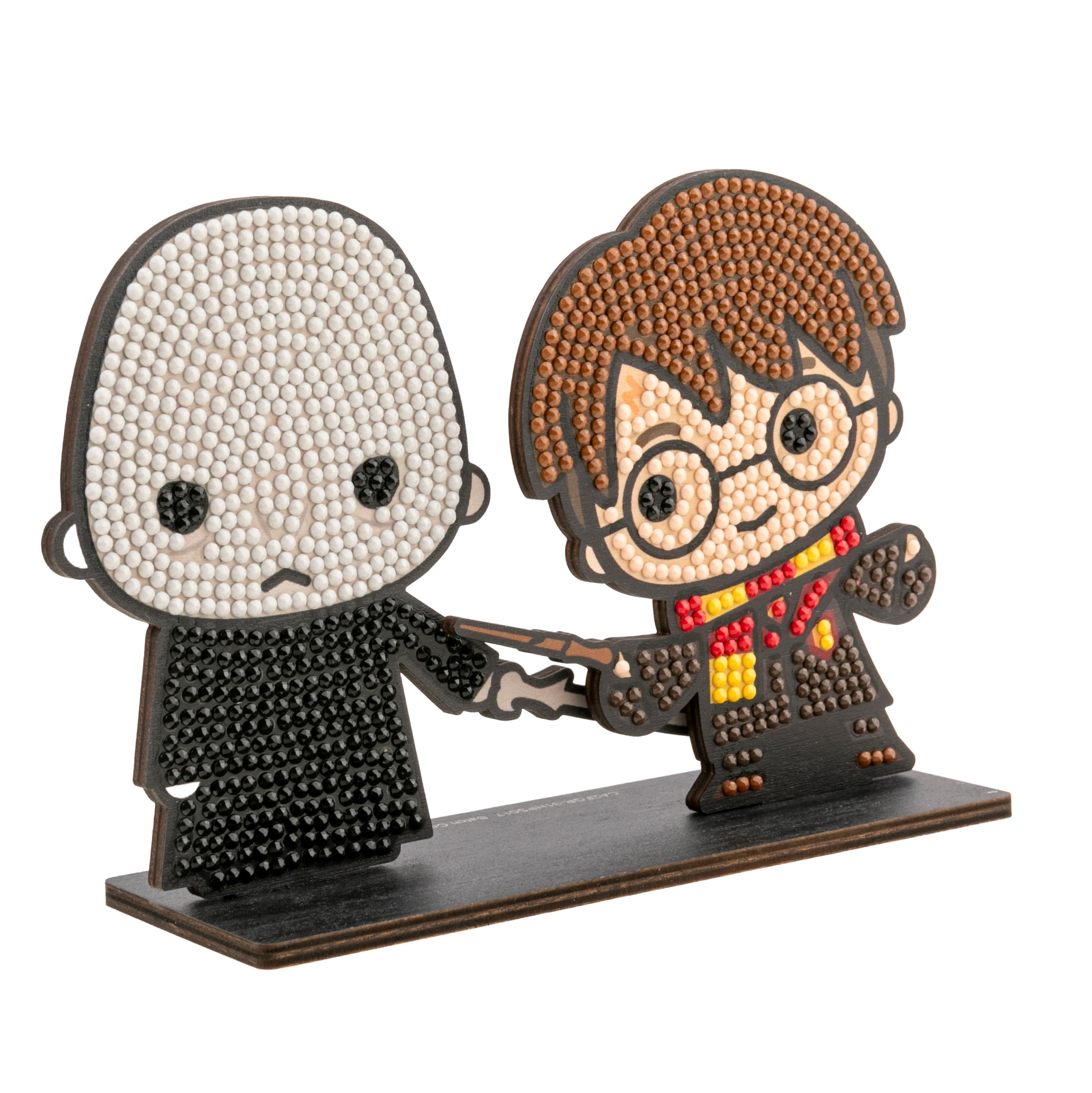 Gestalte zwei funkelnde HARRY POTTER-Figuren nach einem vorgegebenen, Design auf einer Holzvorlage Alle Kretaivstes enthalten: 2 selbstklebende Holzvorlagen, vorsortierte Beutel mit farbigen Kristallen, Stift zum Aufnehmen der Kristalle, Schale, Gelwachs, Bastelanleitung