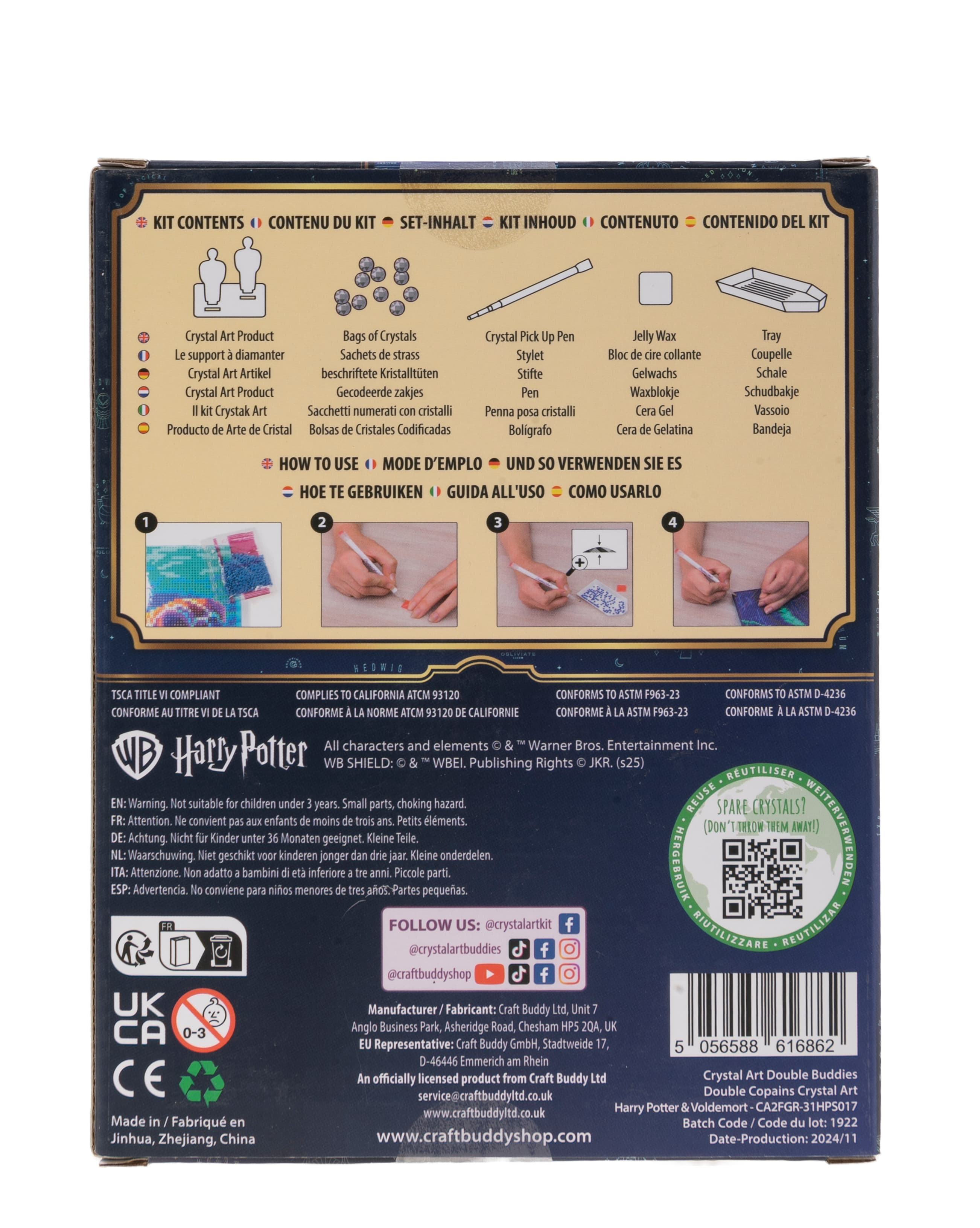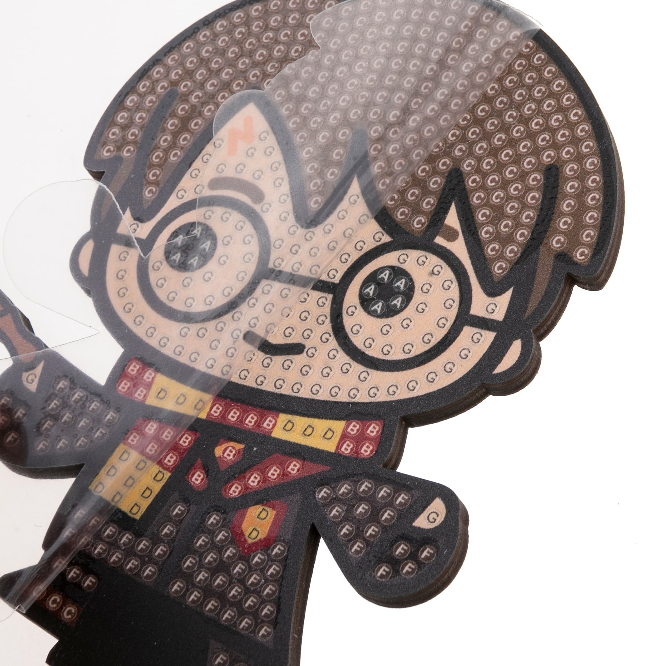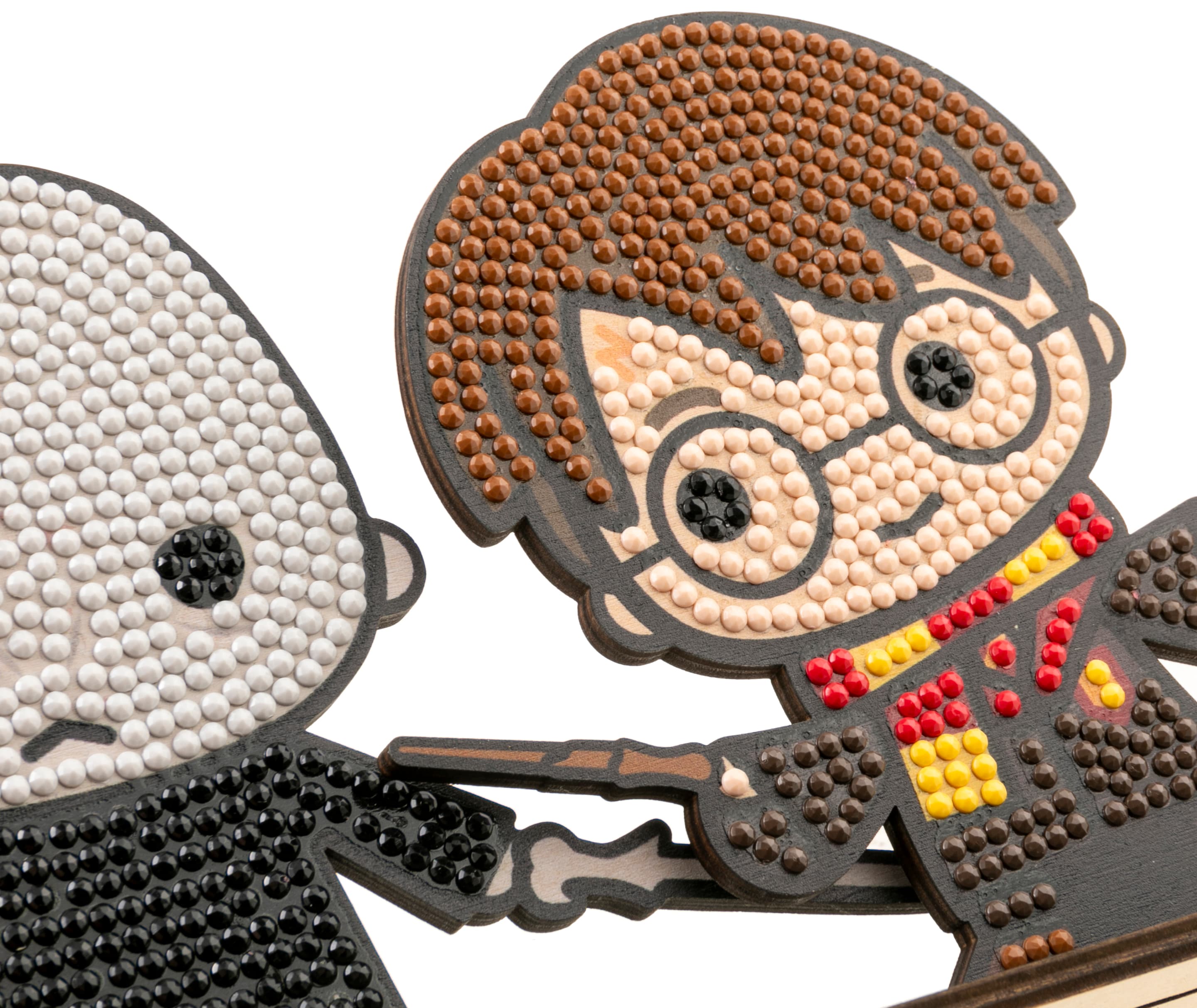 Gestalte zwei funkelnde HARRY POTTER-Figuren nach einem vorgegebenen, Design auf einer Holzvorlage Alle Kretaivstes enthalten: 2 selbstklebende Holzvorlagen, vorsortierte Beutel mit farbigen Kristallen, Stift zum Aufnehmen der Kristalle, Schale, Gelwachs, Bastelanleitung