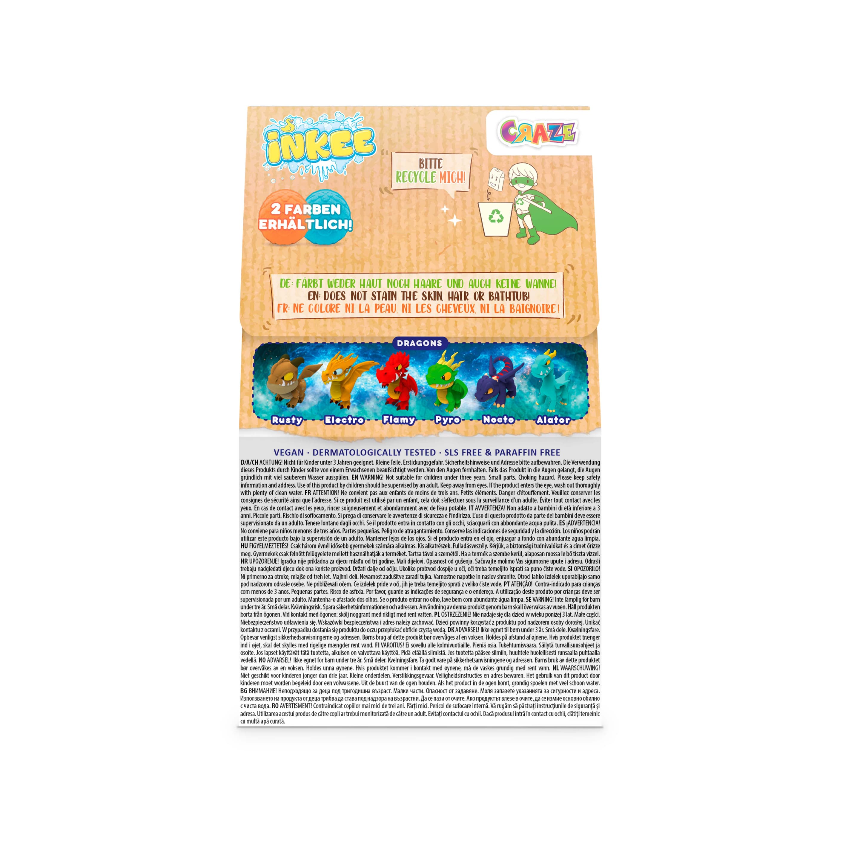 Wow! Wie das nach Cola-Orange duftet, wie das schäumt und in welch schönen Farben! Die INKEE - Drachen Überraschungs-Badekugel sorgt für viel Spaß bei Drachenfans. Während sich die Badekugel sprudelnd im Wasser auflöst und sich das Badewasser in ein wunderschönes orange oder türkisfarbene Schaumbad verwandelt und dabei einem erfrischenden Cola-Orange-Duft den Raum erfüllt, steigt die Spannung, welche der insgesamt 6 verschiedenen Mini-Drachenfiguren sich wohl in der Badekugel befindet. Sicherer Badespaß mit INKEE. Die Badekugel ist vom TÜV Rheinland geprüft, vom unabhängigen Institut Dermatest mit "sehr gut" bewertet und frei von Mikroplastik. Der Badezusatz färbt weder Haut, Haare noch Wanne. Unsere INKEE Badezusätze für Kinder in höchster CRAZE Premium Qualität sorgen für ein sorgenfreies Planschen in der Wanne. Der CRAZE INKEE Badezusatz für Kinder sorgt für echten Badespaß in Badewanne bei kleinen Wasserratten. Ideal als kleines Geschenk – Egal ob als kleine Aufmerksamkeit, als Mitgebsel zu Weihnachten, um den Adventskalender zu füllen oder als Badespielzeug für Kinder, die sonst nicht so gerne baden. Die CRAZE Badezusätze passen zu jeder Gelegenheit.