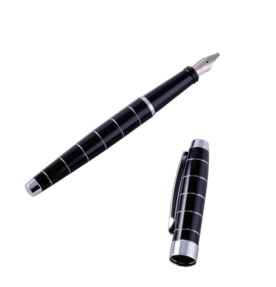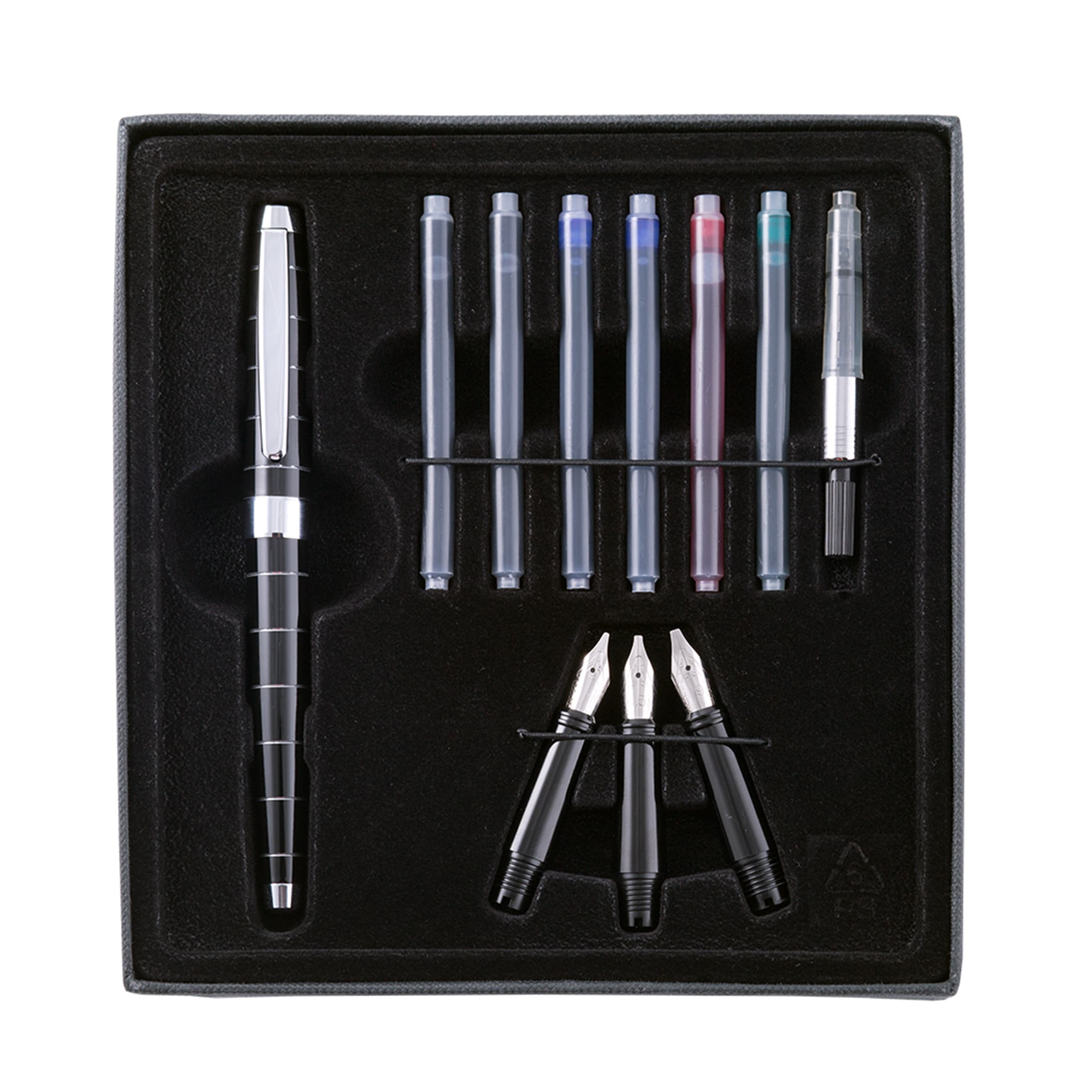 | Lieferumfang | Füllhalter schwarz/silber, Federstücke (1,1/1,5/1,9 mm), Tintenpatronen (2x Schwarz, 2x Blau, Rot, Grün), Tintenkonverter, Anleitungsheft mit Schriftbeispielen |